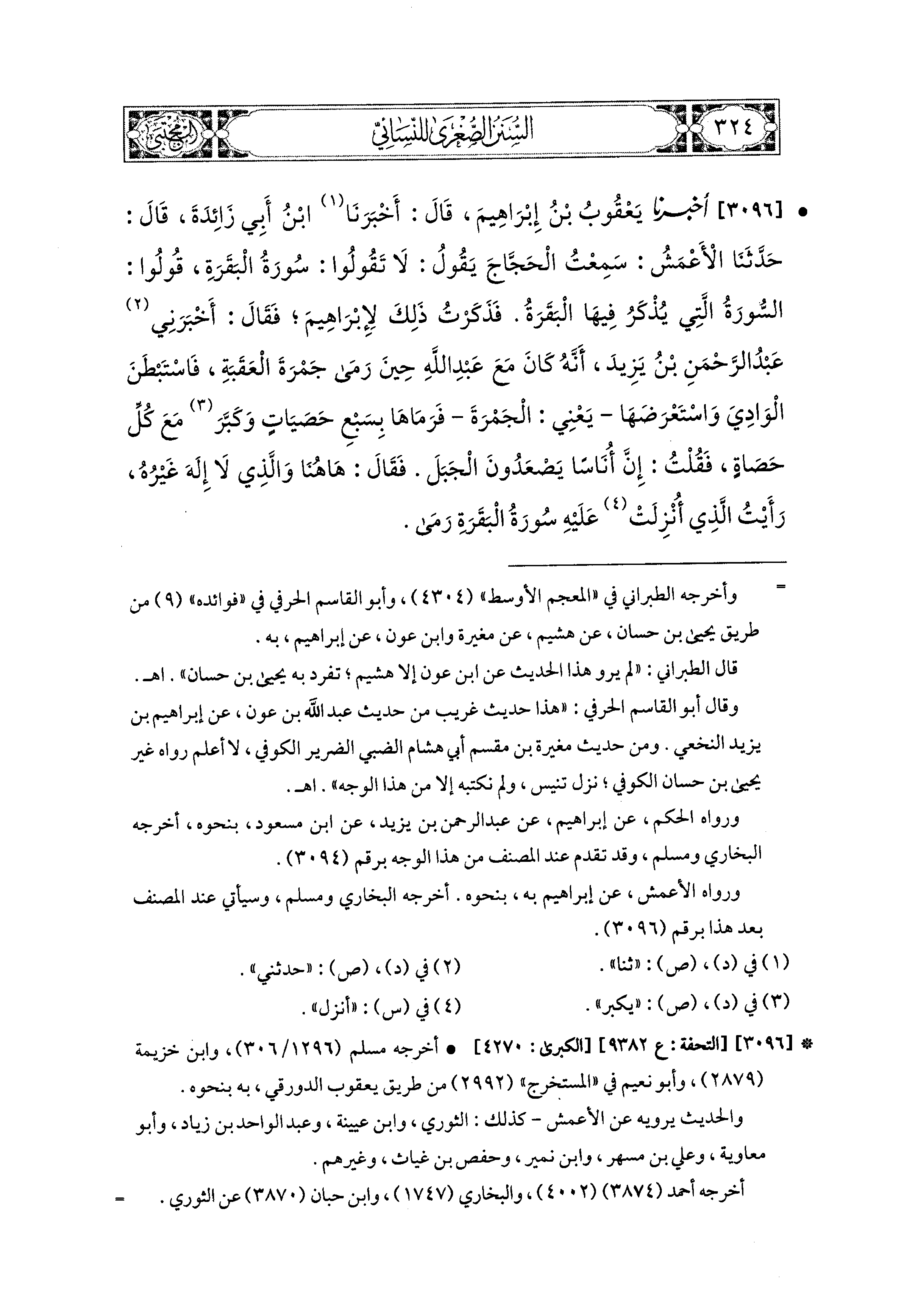 3096 - أَخبَرَنا يَعقُوبُ بْنُ إِبراهِيمَ، قَالَ: أَخبَرنا ابنُ أَبي زَائِدَةَ، قال: حَدثنا الأَعْمَشُ، سَمِعْتُ الحَجَّاجَ يَقُولُ: لاَ تَقُولُوا: سُورَةَ البَقَرَةِ، قُولُوا: السُّورَةُ الَّتِي يُذْكَرُ فِيهَا البَقَرَةُ، فَذَكَرْتُ ذَلِكَ لإِبراهِيمَ، فَقَالَ: أَخبَرني عَبدُ الرَّحمَنِ بْنُ يَزِيدَ، أَنَّهُ كَانَ مَعَ عَبدِ اللهِ، حِينَ رَمَى جَمْرَةَ العَقَبَةِ، فَاسْتَبْطَنَ الوَادِيَ، وَاسْتَعْرَضَهَا، يَعْني الجَمْرَةَ، فَرَمَاهَا بِسَبْعِ حَصَيَاتٍ، وَكَبَّرَ مَعَ كُلِّ حَصَاةٍ، فَقُلْتُ: إِنَّ أُنَاسًا يَصْعَدُونَ الجَبَلَ، فَقَالَ: هَاهُنَا، وَالَّذِي لاَ إِلَهَ غَيْرُهُ رَأَيْتُ الَّذِي أُنْزِلَتْ عَلَيهِ سُورَةُ البَقَرَةِ رَمَى.