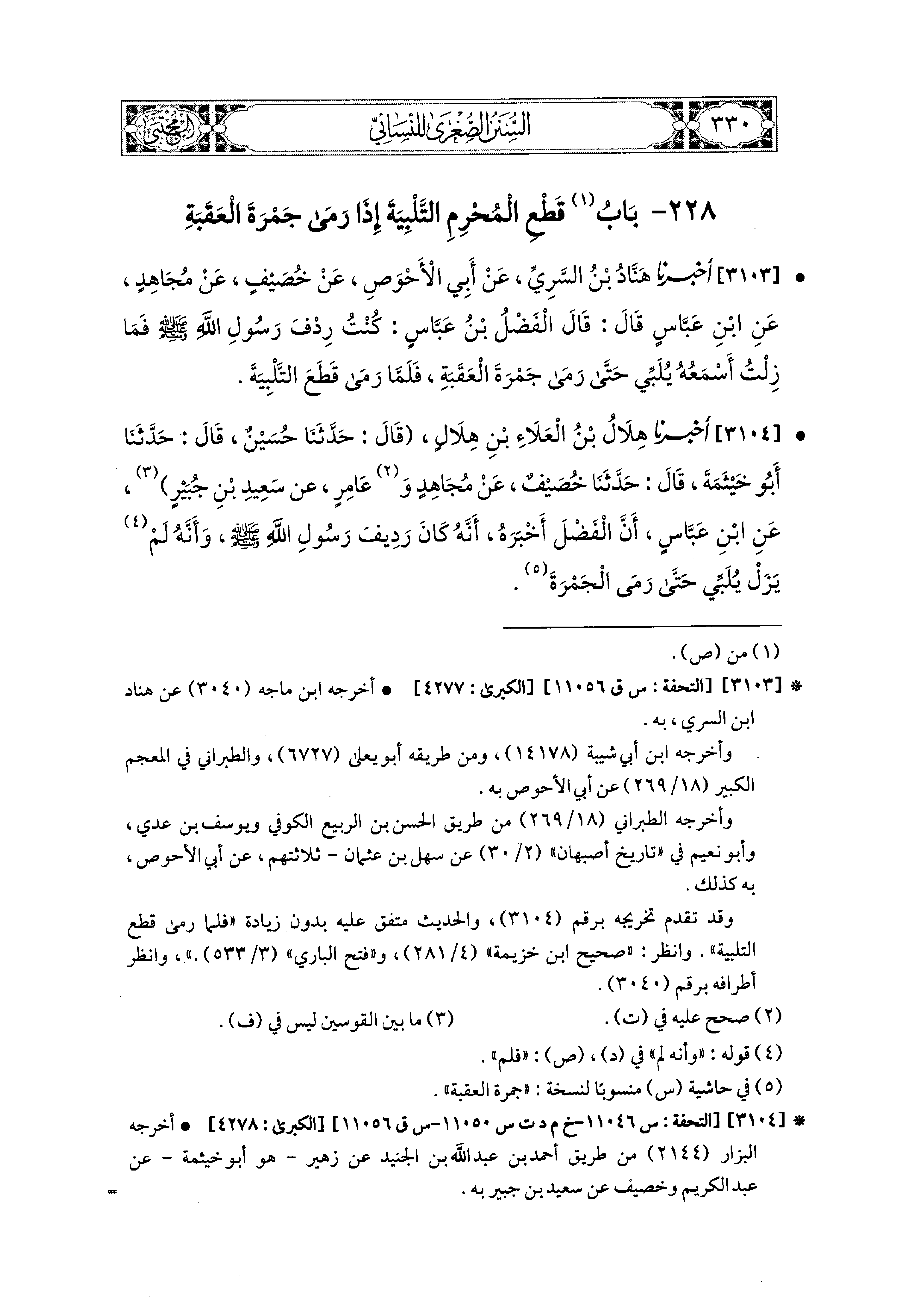 3104 - أَخبَرَنا هِلاَلُ بْنُ العَلاَءِ بْنِ هِلاَلٍ، قال: حَدثنا حُسَيْنٌ، قال: حَدثنا أَبو خَيْثَمَةَ، قال: حَدثنا خُصَيْفٌ، عَن مُجَاهِدٍ، وَعَطَاءٍ، وَسَعيدِ بْنِ جُبَيْرٍ (1)، عَنِ ابنِ عَبَّاسٍ، أَنَّ الفَضْلَ، أَخْبَرَهُ أَنَّهُ كَانَ رَدِيفَ رَسُولِ اللهِ صَلى الله عَليه وسَلم، وَأَنَّهُ لَمْ يَزَلْ يُلَبِّي حَتَّى رَمَى الجَمْرَةَ.