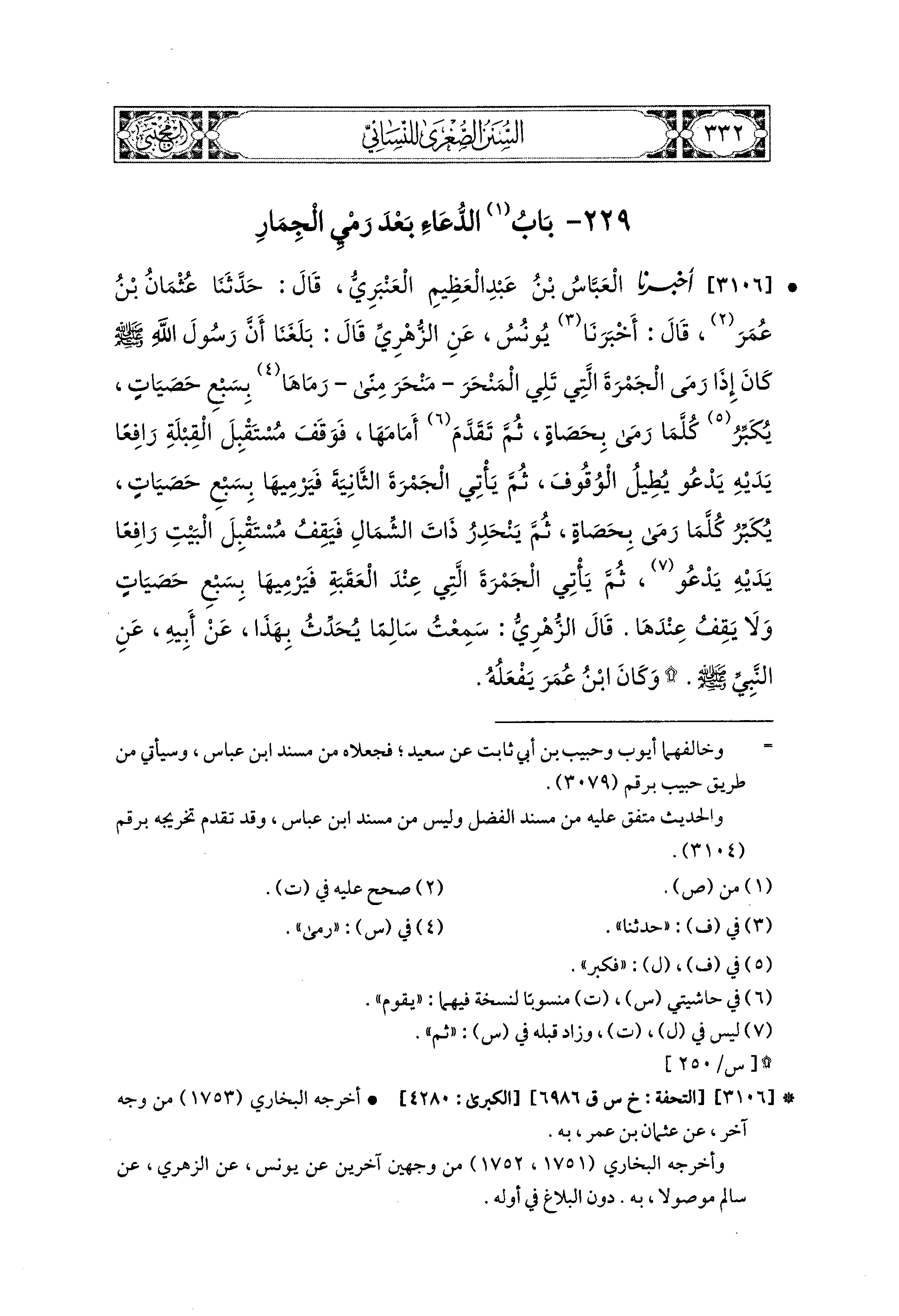 3106 - أَخبَرَنا العَبَّاسُ بْنُ عَبدِ العَظِيمِ العَنبَرِيُّ، قال: حَدثنا عُثمَانُ بْنُ عُمَرَ، قَالَ: أَخبَرنا يُونُسُ، عَنِ الزُّهْرِيِّ، قَالَ: بَلَغَنَا أَنَّ رَسُولَ اللهِ صَلى الله عَليه وسَلم كَانَ إِذَا رَمَى الجَمْرَةَ الَّتِي تَلِي المَنْحَرَ، مَنْحَرَ مِنًى، رَمَاهَا بِسَبْعِ حَصَيَاتٍ يُكَبِّرُ كُلَّمَا رَمَى بِحَصَاةٍ، ثُمَّ تَقَدَّمَ أَمَامَهَا، فَوَقَفَ مُسْتَقْبِلَ القِبْلَةِ رَافِعًا يَدَيْهِ، يَدْعُو يُطِيلُ الوُقُوفَ، ثُمَّ يَأْتِي الجَمْرَةَ الثَّانيَةَ فَيَرْميهَا بِسَبْعِ حَصَيَاتٍ، يُكَبِّرُ كُلَّمَا رَمَى بِحَصَاةٍ، ثُمَّ يَنْحَدِرُ ذَاتَ الشِّمَالِ، فَيَقِفُ مُسْتَقْبِلَ البَيْتِ، رَافِعًا يَدَيْهِ يَدْعُو، ثُمَّ يَأْتِي الجَمْرَةَ الَّتِي عِنْدَ العَقَبَةِ، فَيَرْميهَا بِسَبْعِ حَصَيَاتٍ، وَلاَ يَقِفُ عِنْدَهَا.
