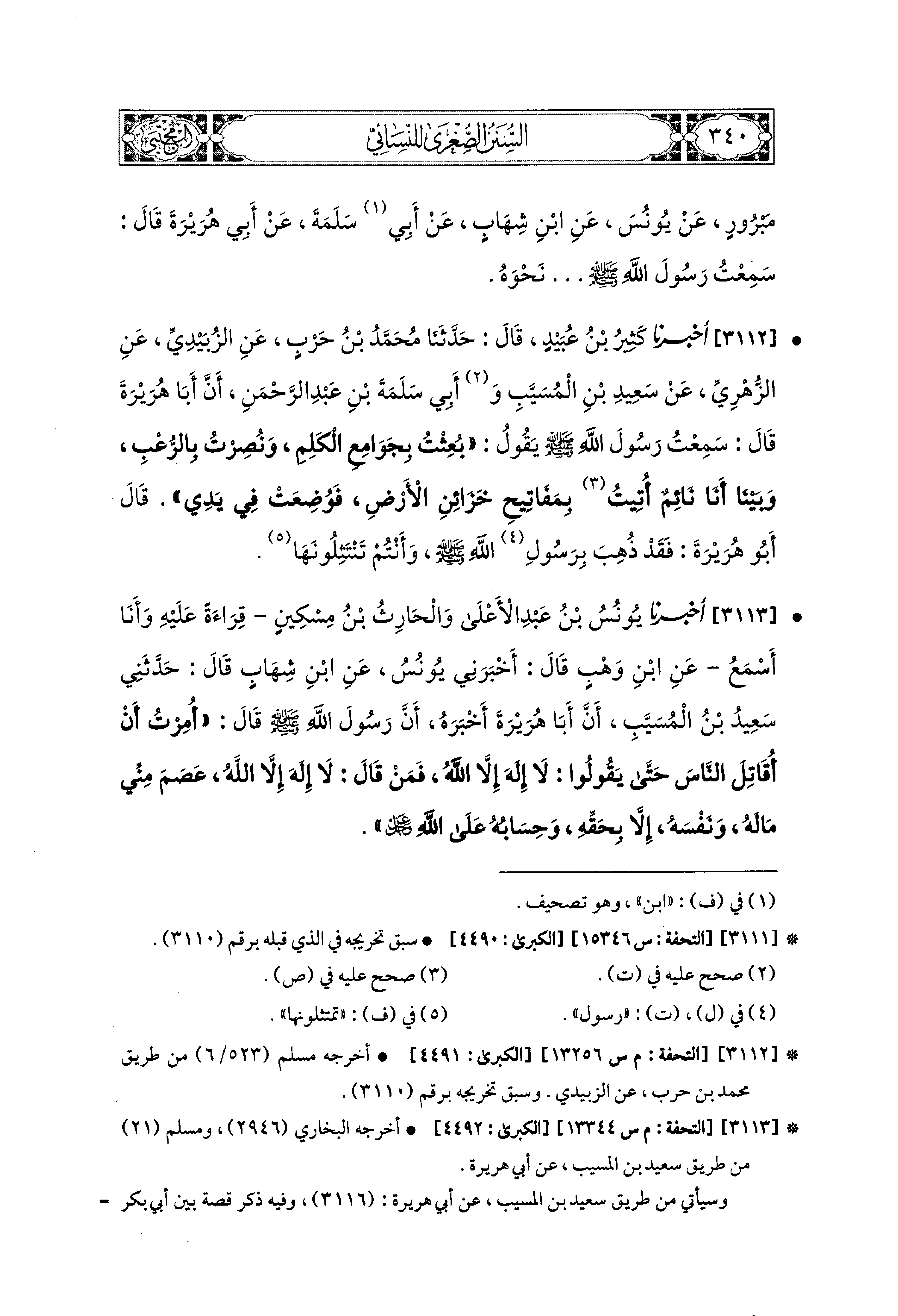 3113 - أَخبَرَنا يُونُسُ بن عَبدِ الأَعلَى، وَالحَارِثُ بْنُ مِسكينٍ، قِرَاءَةً عَلَيهِ وَأَنَا أَسْمَعُ، عَنِ ابنِ وَهْبٍ، قَالَ: أَخبَرني يُونُسُ، عَنِ ابنِ شِهَابٍ، قَالَ: حَدَّثَني سَعيدُ بْنُ المُسَيَّبِ، أَنَّ أَبَا هُرَيرَةَ أَخْبَرَهُ، أَنَّ رَسُولَ اللهِ صَلى الله عَليه وسَلم قَالَ: أُمِرْتُ أَنْ أُقَاتِلَ النَّاسَ حَتَّى يَقُولُوا: لاَ إِلَهَ إِلاَّ اللهُ، فَمَنْ قَالَ: لاَ إِلَهَ إِلاَّ اللهُ، عَصَمَ مِنِّي مَالَهُ وَنَفْسَهُ، إِلاَّ بِحَقِّهِ وَحِسَابُهُ عَلَى الله عزوجل.