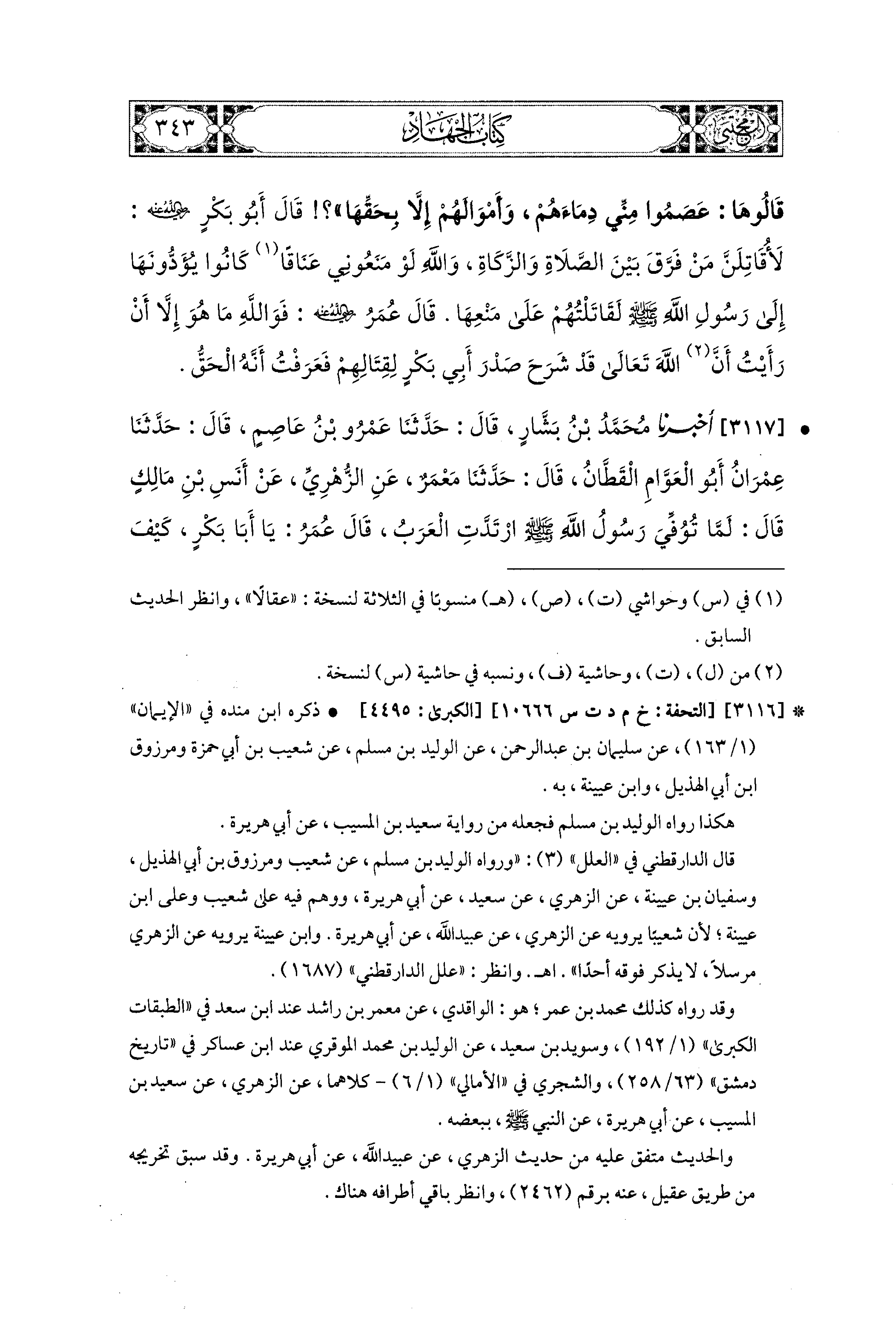 3117 - أَخبَرَنا مُحَمد بْنُ بَشَّارٍ، قال: حَدثنا عَمْرُو بْنُ عَاصِمٍ، قال: حَدثنا عِمْرَانُ أَبو العَوَّامِ القَطَّانُ، قال: حَدثنا مَعْمَرٌ، عَنِ الزُّهْرِيِّ، عَن أَنَسِ بْنِ مَالِكٍ، قَالَ: لَمَّا تُوُفِّيَ رَسُولُ اللهِ صَلى الله عَليه وسَلم، ارْتَدَّتِ العَرَبُ، قَالَ عُمَرُ: يَا أَبَا بَكْرٍ، كَيْفَ تُقَاتِلُ العَرَبَ؟ فَقَالَ أَبو بَكْرٍ، رَضِيَ اللهُ عَنهُ: إِنَّمَا قَالَ رَسُولُ اللهِ صَلى الله عَليه وسَلم: أُمِرْتُ أَنْ أُقَاتِلَ النَّاسَ حَتَّى يَشْهَدُوا أَنْ لاَ إِلَهَ إِلاَّ اللهُ، وَأَنِّي رَسُولُ اللهِ، وَيُقِيمُوا الصَّلاَةَ، وَيُؤْتُوا الزَّكَاةَ، وَالله لَوْ مَنَعُوني عَنَاقًا مِمَّا كَانُوا يُعْطُونَ رَسُولَ اللهِ صَلى الله عَليه وسَلم لَقَاتَلْتُهُمْ عَلَيهِ، قَالَ عُمَرُ، رَضِيَ اللهُ عَنهُ: فَلَمَّا رَأَيْتُ رَأْيَ أَبي بَكْرٍ قَدْ شُرِحَ، عَلِمْتُ أَنَّهُ الحَقُّ.