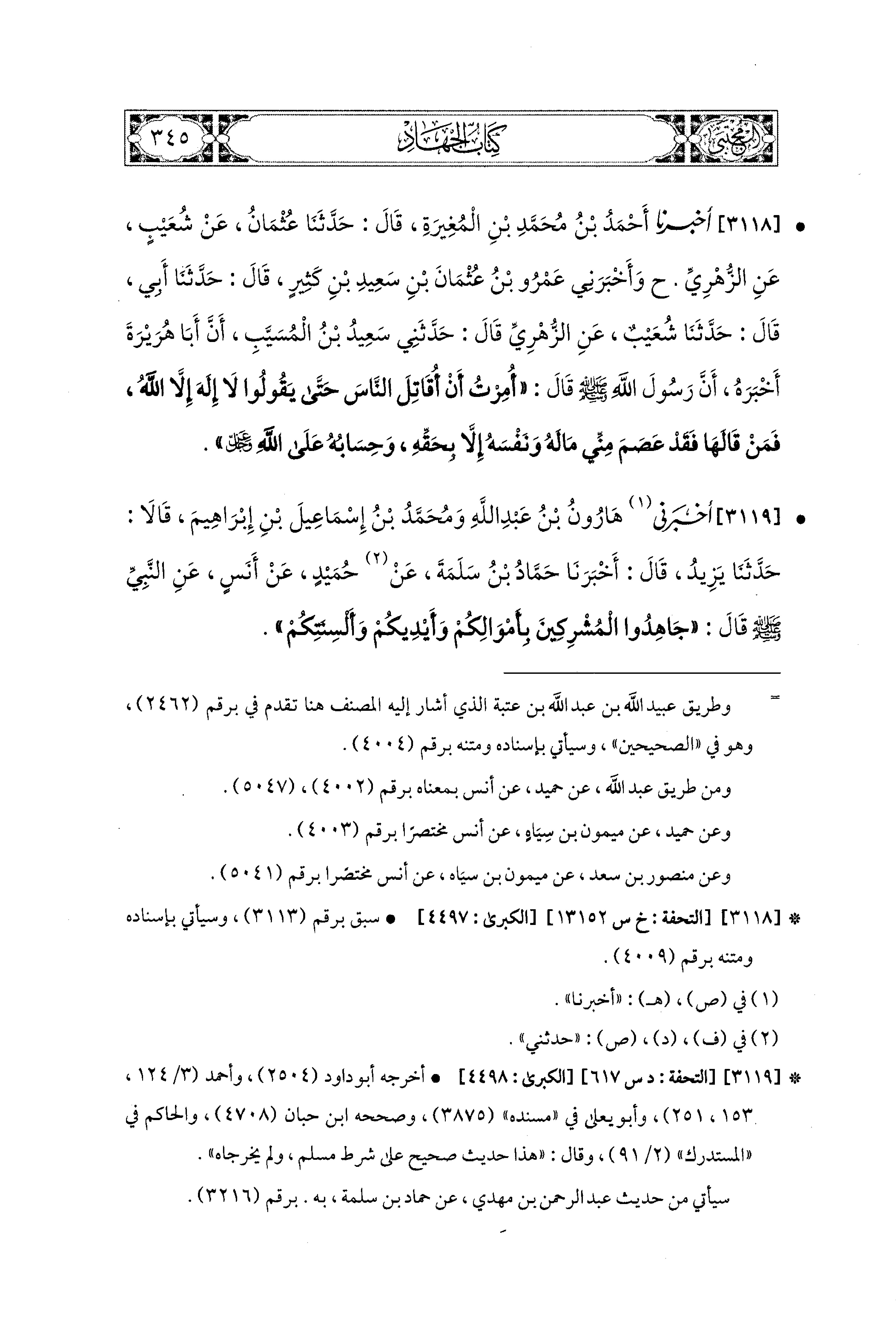 3119 - أَخْبَرَنِي هَارُونُ بْنُ عَبدِ اللهِ، وَمُحَمدُ بْنُ إِسماعِيلَ بْنِ إِبراهِيمَ، قَالاَ: حَدَّثَنَا يَزِيدُ، قَالَ: أَخبَرنا حَمَّادُ بْنُ سَلَمَةَ، عَن حُمَيدٍ، عَن أَنَسٍ، عَنِ النَّبيِّ صَلى الله عَليه وسَلم قَالَ: جَاهِدُوا المُشْرِكِينَ بِأَمْوَالِكُمْ وَأَيْدِيكُمْ وَأَلْسِنَتِكُمْ.