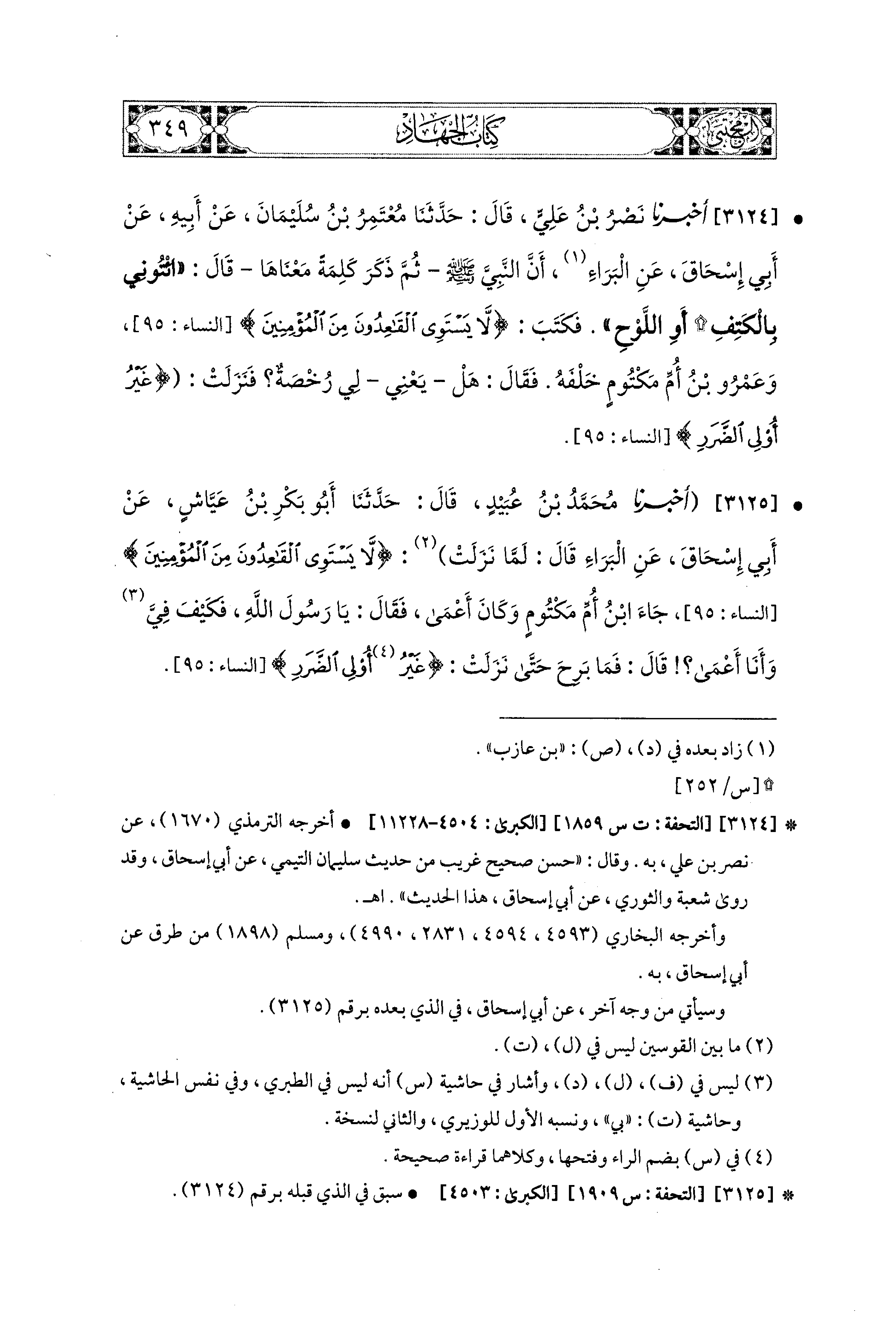 3125 - أَخبَرَنا مُحَمد بْنُ عُبَيدٍ، قال: حَدثنا أَبو بَكْرِ بْنُ عَيَّاشٍ، عَن أَبي إِسحَاقَ، عَنِ البَرَاءِ، قَالَ: لَمَّا نَزَلَتْ: {لاَ يَسْتَوِي القَاعِدُونَ مِنَ المُؤْمِنينَ} جَاءَ ابنُ أُمِّ مَكْتُومٍ وَكَانَ أَعْمَى، فَقَالَ: يَا رَسُولَ اللهِ، فَكَيْفَ فِيَّ وَأَنَا أَعْمَى؟ قَالَ: فَمَا بَرِحَ، حَتَّى نَزَلَتْ: {غَيْرُ أُولِي الضَّرَرِ}.