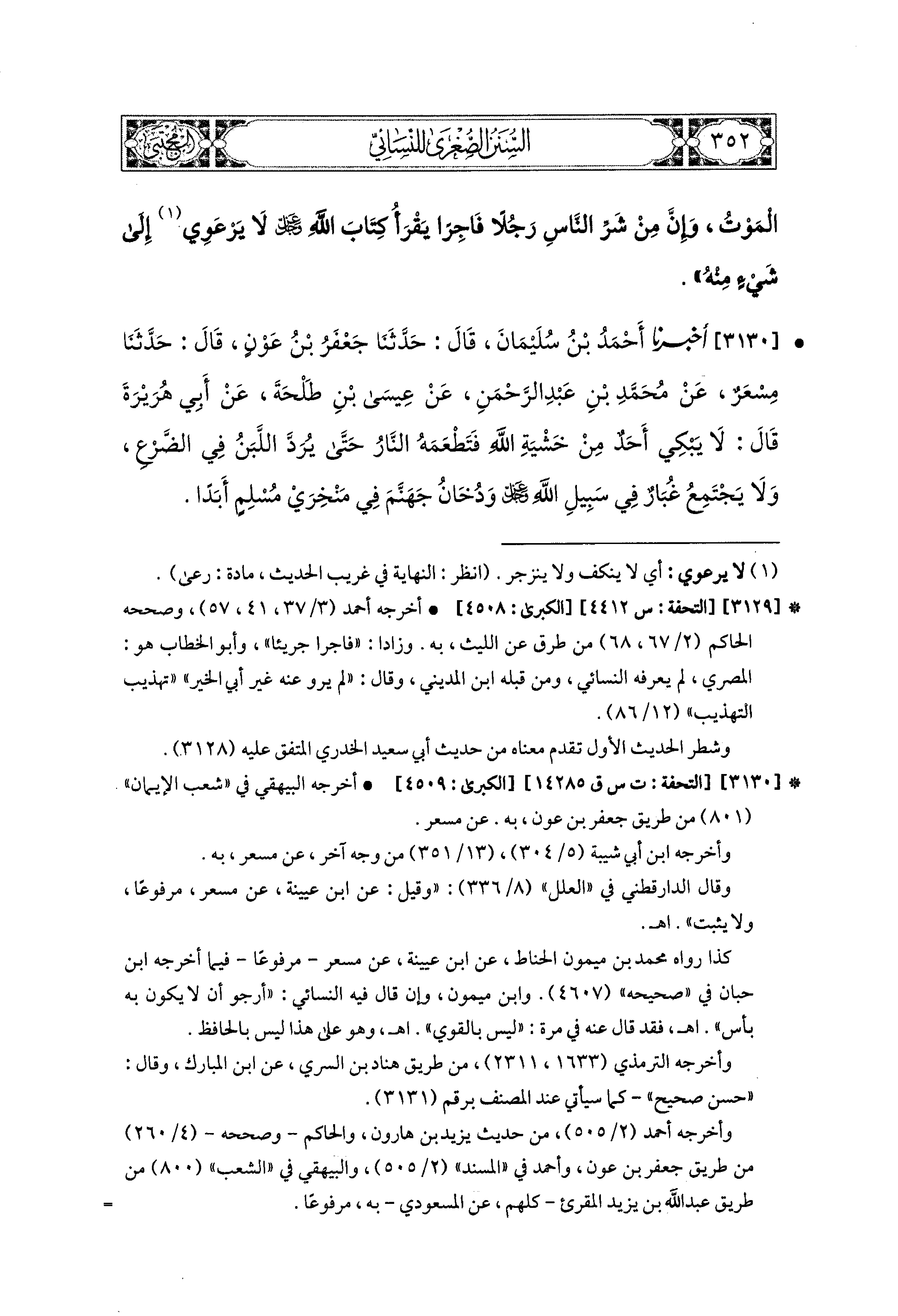 3130 - أَخبَرَنا أَحْمَدُ بْنُ سُلَيمَانَ، قال: حَدثنا جَعْفَرُ بْنُ عَوْنٍ، قال: حَدثنا مِسْعَرٌ، عَن مُحَمدِ بْنِ عَبدِ الرَّحمَنِ، عَن عِيسَى بْنِ طَلْحَةَ، عَن أَبي هُرَيرَةَ، قَالَ: لاَ يَبْكِي أَحَدٌ مِنْ خَشْيَةِ اللهِ فَتَطْعَمَهُ النَّارُ حَتَّى يُرَدَّ اللَّبَنُ فِي الضَّرْعِ، وَلاَ يَجْتَمِعُ غُبَارٌ فِي سَبِيلِ اللهِ عَزَّ وَجَلَّ وَدُخَانُ جَهَنَّمَ فِي مَنْخَرَيْ مُسْلِمٍ أَبَدًا.