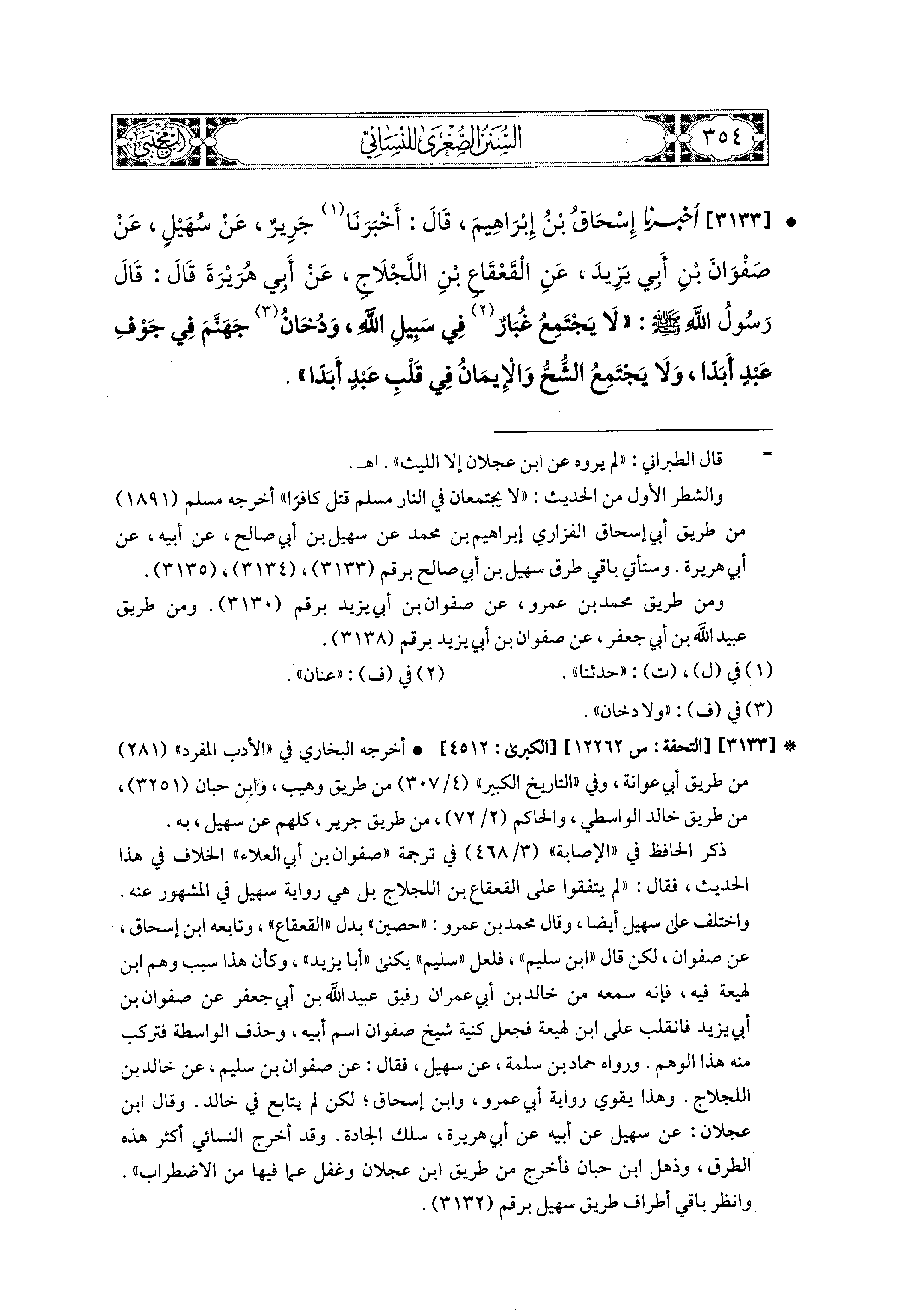 3133 - أَخبَرَنا إِسحَاقُ بْنُ إِبراهِيمَ، قال: أَخبَرَنا جَرِيرٌ، عَن سُهَيْلٍ، عَن صَفْوَانَ بْنِ أَبي يَزِيدَ، عَنِ القَعْقَاعِ بْنِ اللَّجْلاَجِ، عَن أَبي هُرَيرَةَ، قَالَ: قَالَ رَسُولُ اللهِ صَلى الله عَليه وسَلم: لاَ يَجْتَمِعُ غُبَارٌ فِي سَبِيلِ اللهِ وَدُخَانُ جَهَنَّمَ فِي جَوْفِ عَبدٍ أَبَدًا، وَلاَ يَجْتَمِعُ الشُّحُّ وَالإِيمَانُ فِي قَلْبِ عَبدٍ أَبَدًا.