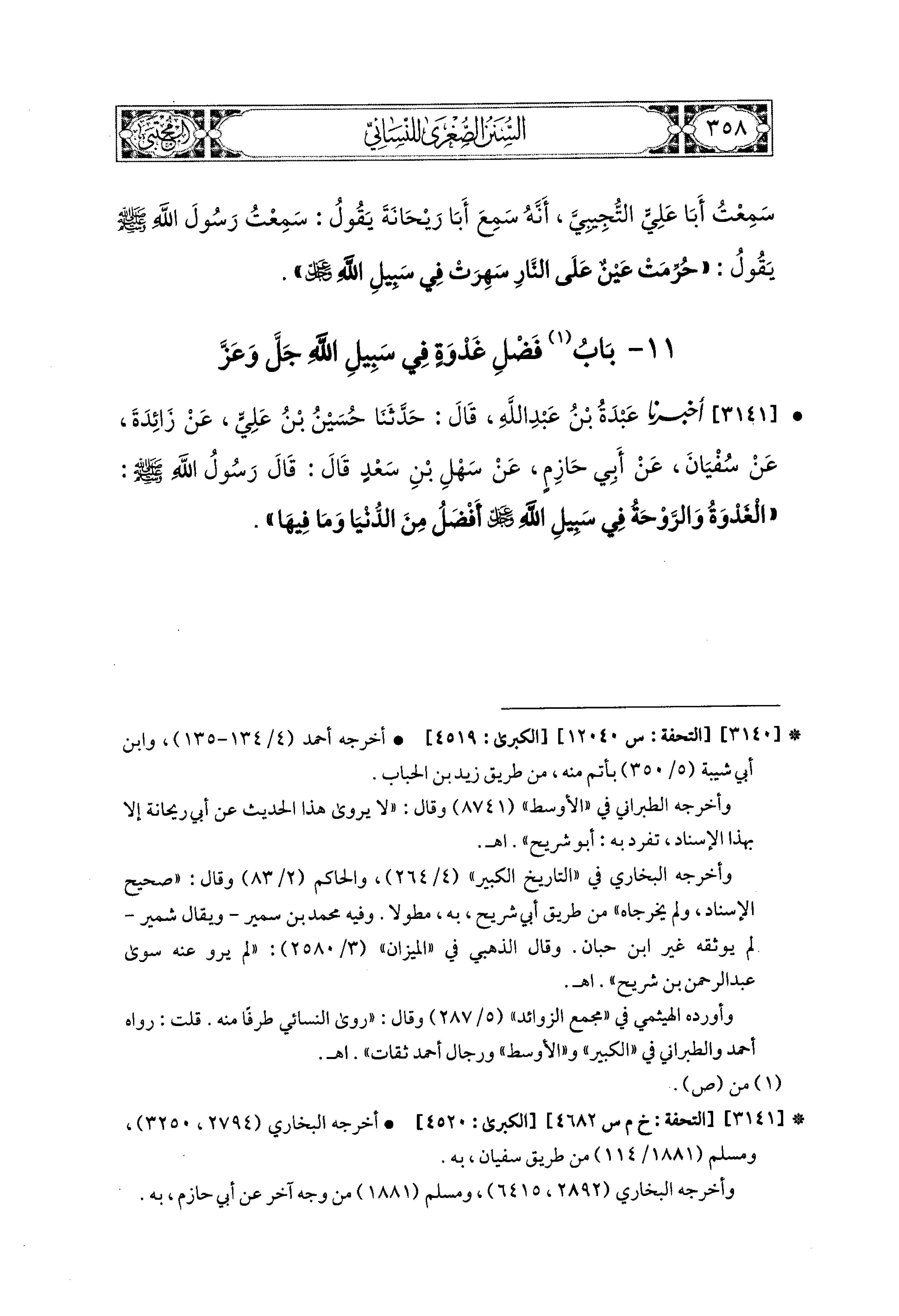 3141 - أَخبَرَنا عَبدَةُ بْنُ عَبدِ اللهِ، قال: حَدثنا حُسَيْنُ بْنُ عَلِيٍّ، عَن زَائِدَةَ، عَن سُفيَانَ، عَن أَبي حَازِمٍ، عَن سَهْلِ بْنِ سَعْدٍ، قَالَ: قَالَ رَسُولُ اللهِ صَلى الله عَليه وسَلم: الغَدْوَةُ وَالرَّوْحَةُ فِي سَبِيلِ اللهِ عَزَّ وَجَلَّ أَفْضَلُ مِنَ الدُّنْيَا وَمَا فِيهَا.