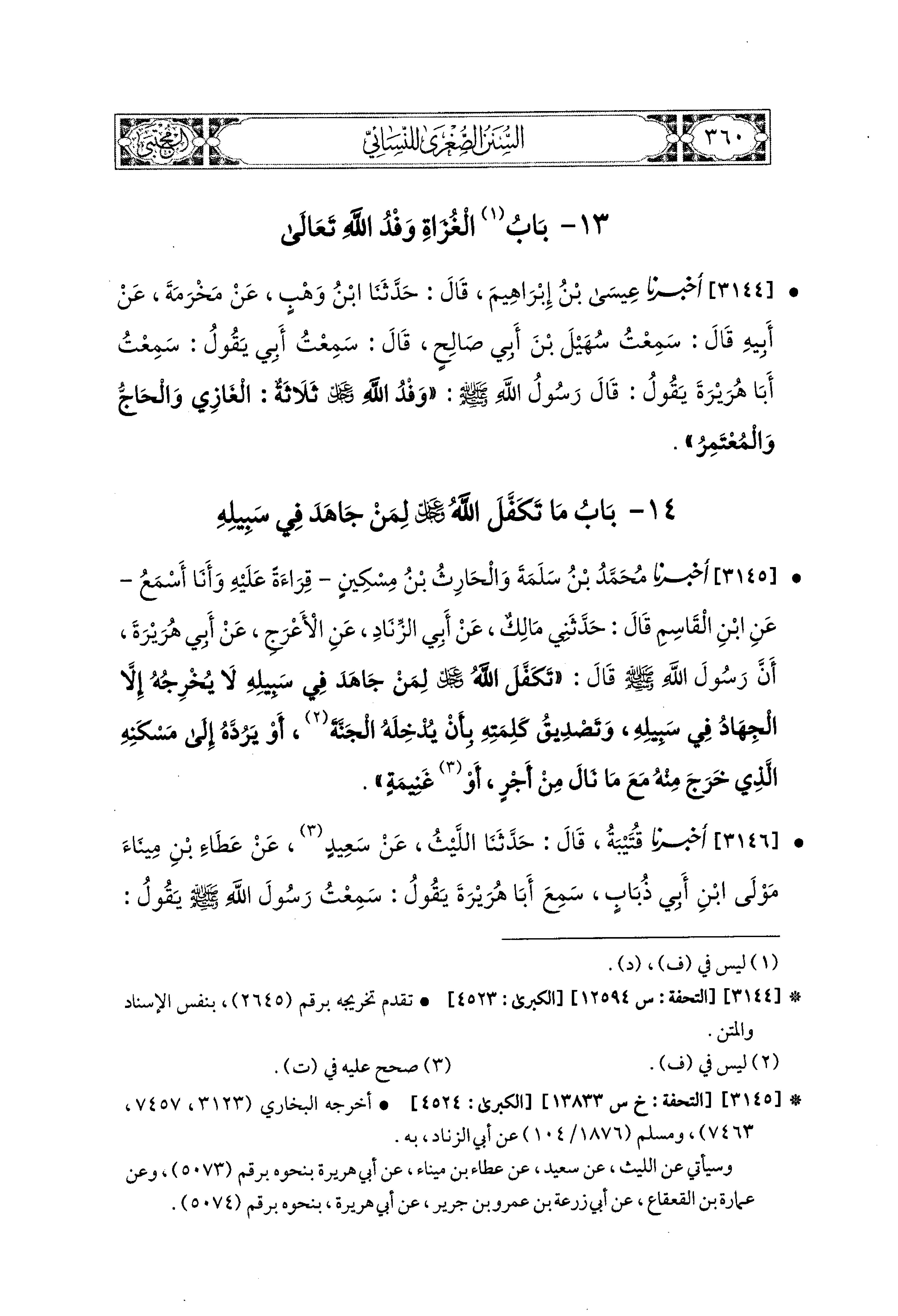 3146 - أَخبَرَنا قُتَيبَةُ، قال: حَدثنا اللَّيْثُ، عَن سَعيدٍ، عَن عَطَاءِ بْنِ مينَاءَ، مَوْلَى ابنِ أَبي ذُبَابٍ سَمِعَ أَبَا هُرَيرَةَ، يَقُولُ: سَمِعْتُ رَسُولَ اللهِ صَلى الله عَليه وسَلم يَقُولُ: انْتَدَبَ اللهُ عَزَّ وَجَلَّ لِمَنْ يَخْرُجُ فِي سَبِيلِهِ لاَ يُخْرِجُهُ إِلاَّ الإِيمَانُ بِي، وَالجِهَادُ فِي سَبِيلِي، أَنَّهُ ضَامِنٌ حَتَّى أُدْخِلَهُ الجَنَّةَ بِأَيِّهِمَا كَانَ، إِمَّا بِقَتْلٍ، أَوْ وَفَاةٍ، أَوْ أَرُدَّهُ إِلَى مَسْكَنِهِ الَّذِي خَرَجَ مِنْهُ، نَالَ مَا نَالَ مِنْ أَجْرٍ، أَوْ غَنيمَةٍ.