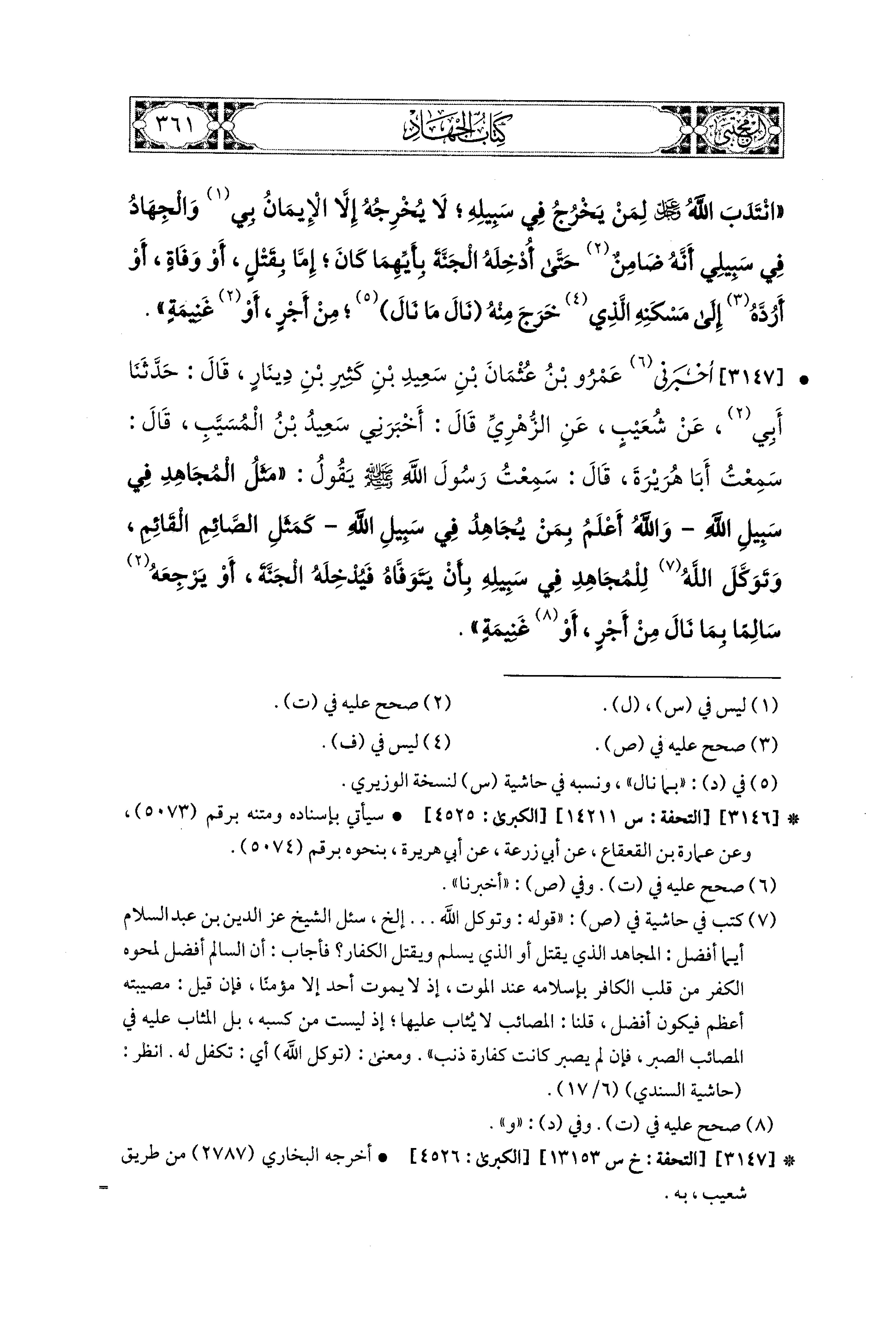 3147 - أَخبَرني عَمْرُو بْنُ عُثمَانَ بْنِ سَعيدِ بْنِ كَثِيرِ بْنِ دِينَارٍ، قال: حَدثنا أَبي، عَن شُعَيبٍ، عَنِ الزُّهْرِيِّ، قَالَ: أَخبَرني سَعيدُ بْنُ المُسَيَّبِ، قَالَ: سَمِعْتُ أَبَا هُرَيرَةَ، قَالَ: سَمِعْتُ رَسُولَ اللهِ صَلى الله عَليه وسَلم، يَقُولُ: مَثَلُ المُجَاهِدِ فِي سَبِيلِ اللهِ، وَاللهُ أَعْلَمُ بِمَنْ يُجَاهِدُ فِي سَبِيلِ اللهِ، كَمَثَلِ الصَّائِمِ القَائِمِ، وَتَوَكَّلَ اللهُ لِلْمُجَاهِدِ فِي سَبِيلِهِ، بِأَنْ يَتَوَفَّاهُ فَيُدْخِلَهُ الجَنَّةَ، أَوْ يُرْجِعَهُ سَالِمًا بِمَا نَالَ مِنْ أَجْرٍ، أَوْ غَنيمَةٍ.