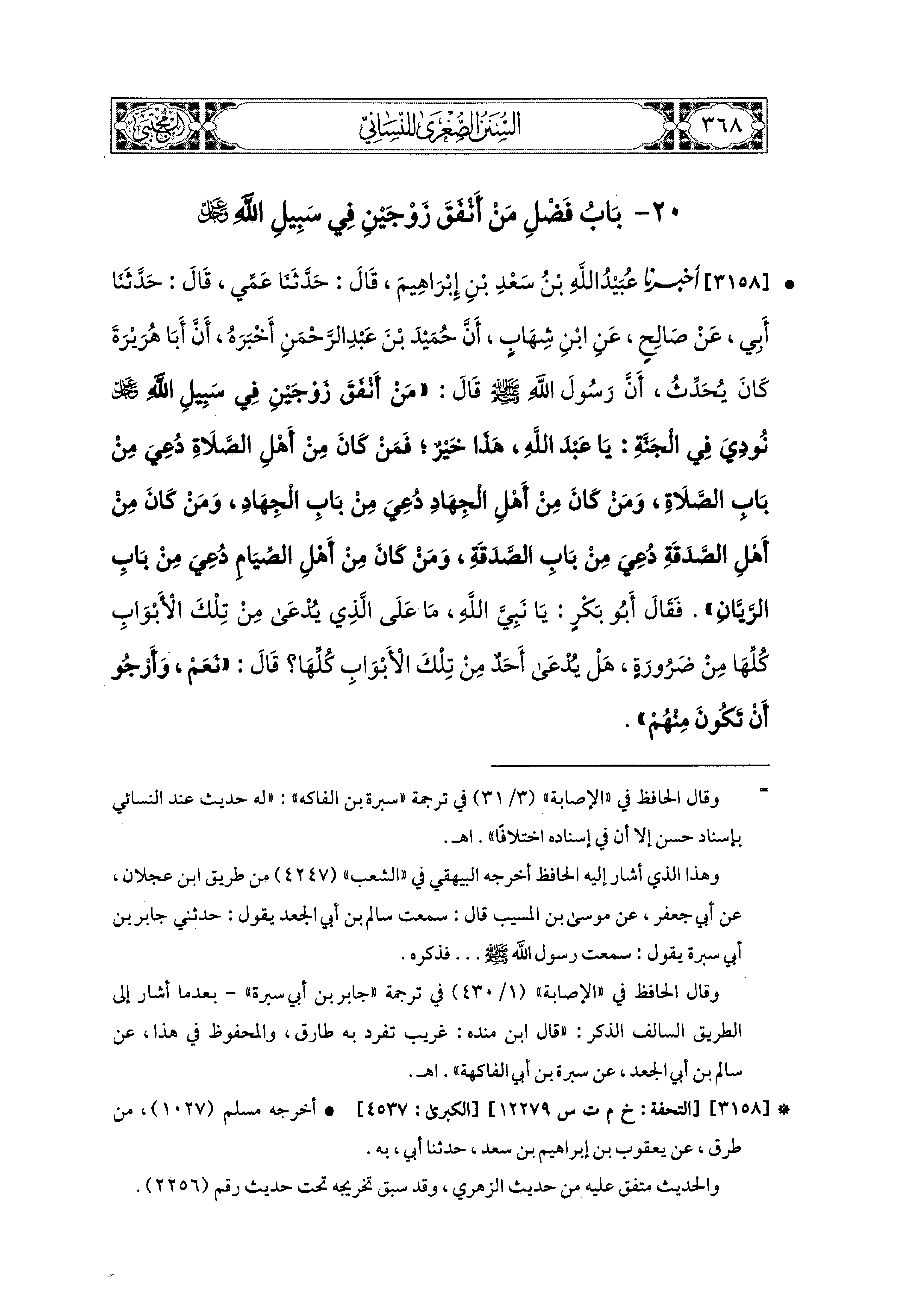 3158 - أَخبَرَنا عُبَيدُ اللهِ بْنُ سَعْدِ بْنِ إِبراهِيمَ، قال: حَدثنا عَمِّي، قال: حَدثنا أَبي، عَن صَالِحٍ، عَنِ ابنِ شِهَابٍ، أَنَّ حُمَيدَ بْنَ عَبدِ الرَّحمَنِ، أَخْبَرَهُ، أَنَّ أَبَا هُرَيرَةَ، كَانَ يُحَدِّثُ، أَنَّ رَسُولَ اللهِ صَلى الله عَليه وسَلم قَالَ: مَنْ أَنْفَقَ زَوْجَيْنِ فِي سَبِيلِ اللهِ عَزَّ وَجَلَّ نُودِيَ فِي الجَنَّةِ: يَا عَبدَ اللهِ هَذَا خَيْرٌ، فَمَنْ كَانَ مِنْ أَهْلِ الصَّلاَةِ، دُعِيَ مِنْ بَابِ الصَّلاَةِ، وَمَنْ كَانَ مِنْ أَهْلِ الجِهَادِ دُعِيَ مِنْ بَابِ الجِهَادِ، وَمَنْ كَانَ مِنْ أَهْلِ الصَّدَقَةِ، دُعِيَ مِنْ بَابِ الصَّدَقَةِ، وَمَنْ كَانَ مِنْ أَهْلِ الصِّيَامِ، دُعِيَ مِنْ بَابِ الرَّيَّانِ، فَقَالَ أَبو بَكْرٍ: يَا نَبِيَّ اللهِ، مَا عَلَى الَّذِي يُدْعَى مِنْ تِلْكَ الأَبْوَابِ كُلِّهَا مِنْ ضَرُورَةٍ، هَلْ يُدْعَى أَحَدٌ مِنْ تِلْكَ الأَبْوَابِ كُلِّهَا؟ قَالَ: نَعَمْ، وَأَرْجُو أَنْ تَكُونَ مِنْهُمْ.