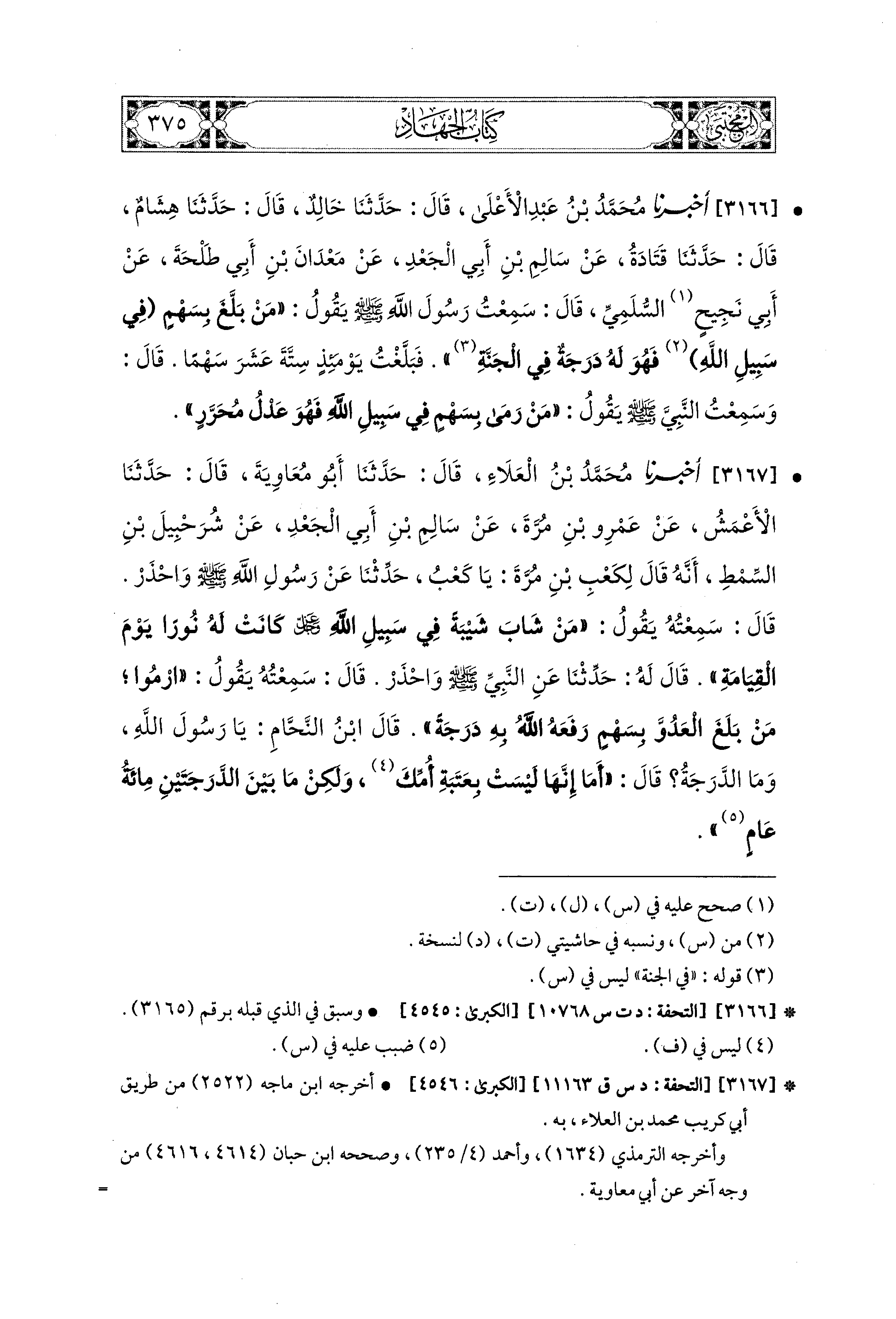 3167 - أَخبَرَنا مُحَمد بْنُ العَلاَءِ، قال: حَدثنا أَبو مُعَاوِيَةَ، قال: حَدثنا الأَعْمَشُ، عَن عَمْرِو بْنِ مُرَّةَ، عَن سَالِمِ بْنِ أَبي الجَعْدِ، عَن شُرَحْبِيلَ بْنِ السِّمْطِ، أنه قَالَ لِكَعْبِ بْنِ مُرَّةَ: يَا كَعْبُ، حَدِّثْنَا عَن رَسُولِ اللهِ صَلى الله عَليه وسَلم، وَاحْذَرْ، قَالَ: سَمِعْتُهُ يَقُولُ: مَنْ شَابَ شَيْبَةً فِي الإِسْلاَمِ فِي سَبِيلِ اللهِ عَزَّ وَجَلَّ، كَانَتْ لَهُ نُورًا يَوْمَ القِيَامَةِ، قَالَ لَهُ: حَدِّثْنَا عَنِ النَّبيِّ صَلى الله عَليه وسَلم، وَاحْذَرْ، قَالَ: سَمِعْتُهُ يَقُولُ: ارْمُوا مَنْ بَلَغَ العَدُوَّ بِسَهْمٍ رَفَعَهُ اللهُ بِهِ دَرَجَةً، قَالَ ابنُ النَّحَّامِ: يَا رَسُولَ اللهِ، وَمَا الدَّرَجَةُ؟ قَالَ: أَمَا إِنَّهَا لَيْسَتْ بِعَتَبَةِ أُمِّكَ، وَلَكِنْ مَا بَيْنَ الدَّرَجَتَيْنِ مِئَةُ عَامٍ.