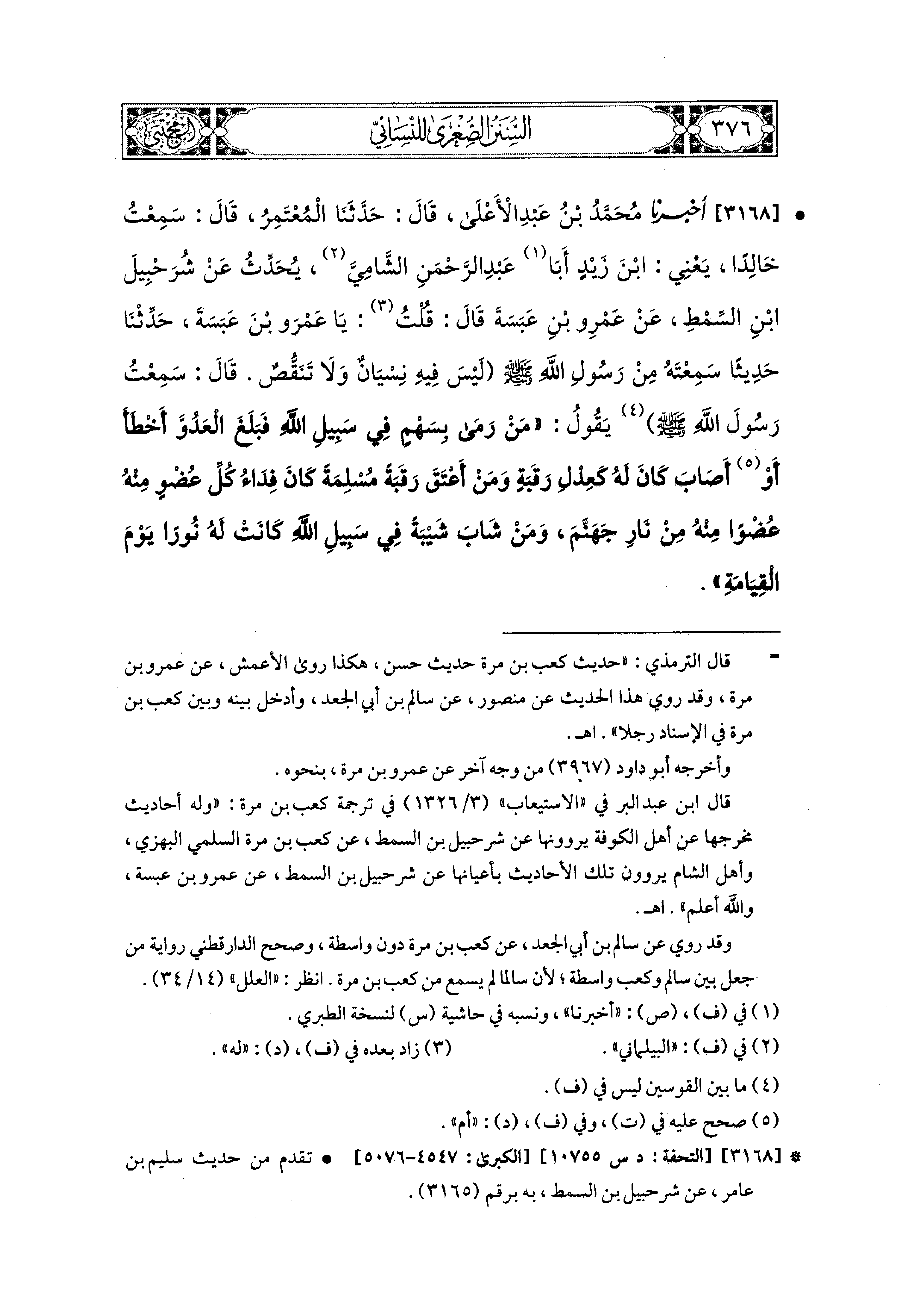 3168 - أَخبَرَنا مُحَمد بن عَبدِ الأَعلَى، قال: حَدثنا المُعْتَمِرُ، قَالَ: سَمِعْتُ خَالِدًا، يَعْني ابنَ زَيْدٍ أَبَا عَبدِ الرَّحمَنِ الشَّاميَّ، يُحَدِّثُ عَن شُرَحْبِيلَ بْنِ السِّمْطِ، عَن عَمْرِو بْنِ عَبَسَةَ، قَالَ: قُلْتُ: يَا عَمْرُو بْنَ عَبَسَةَ، حَدِّثْنَا حَدِيثًا سَمِعْتَهُ مِنْ رَسُولِ اللهِ صَلى الله عَليه وسَلم لَيْسَ فِيهِ نِسْيَانٌ وَلاَ تَنَقُّصٌ، قَالَ: سَمِعْتُ رَسُولَ اللهِ صَلى الله عَليه وسَلم يَقُولُ: مَنْ رَمَى بِسَهْمٍ فِي سَبِيلِ اللهِ فَبَلَغَ العَدُوَّ أَخْطَأَ، أَوْ أَصَابَ، كَانَ لَهُ كَعِدْلِ رَقَبَةٍ، وَمَنْ أَعْتَقَ رَقَبَةً مُسْلِمَةً، كَانَ فِدَاءُ كُلِّ عُضْوٍ مِنْهُ عُضْوًا مِنْهُ مِنْ نَارِ جَهَنَّمَ، وَمَنْ شَابَ شَيْبَةً فِي سَبِيلِ اللهِ، كَانَتْ لَهُ نُورًا يَوْمَ القِيَامَةِ.