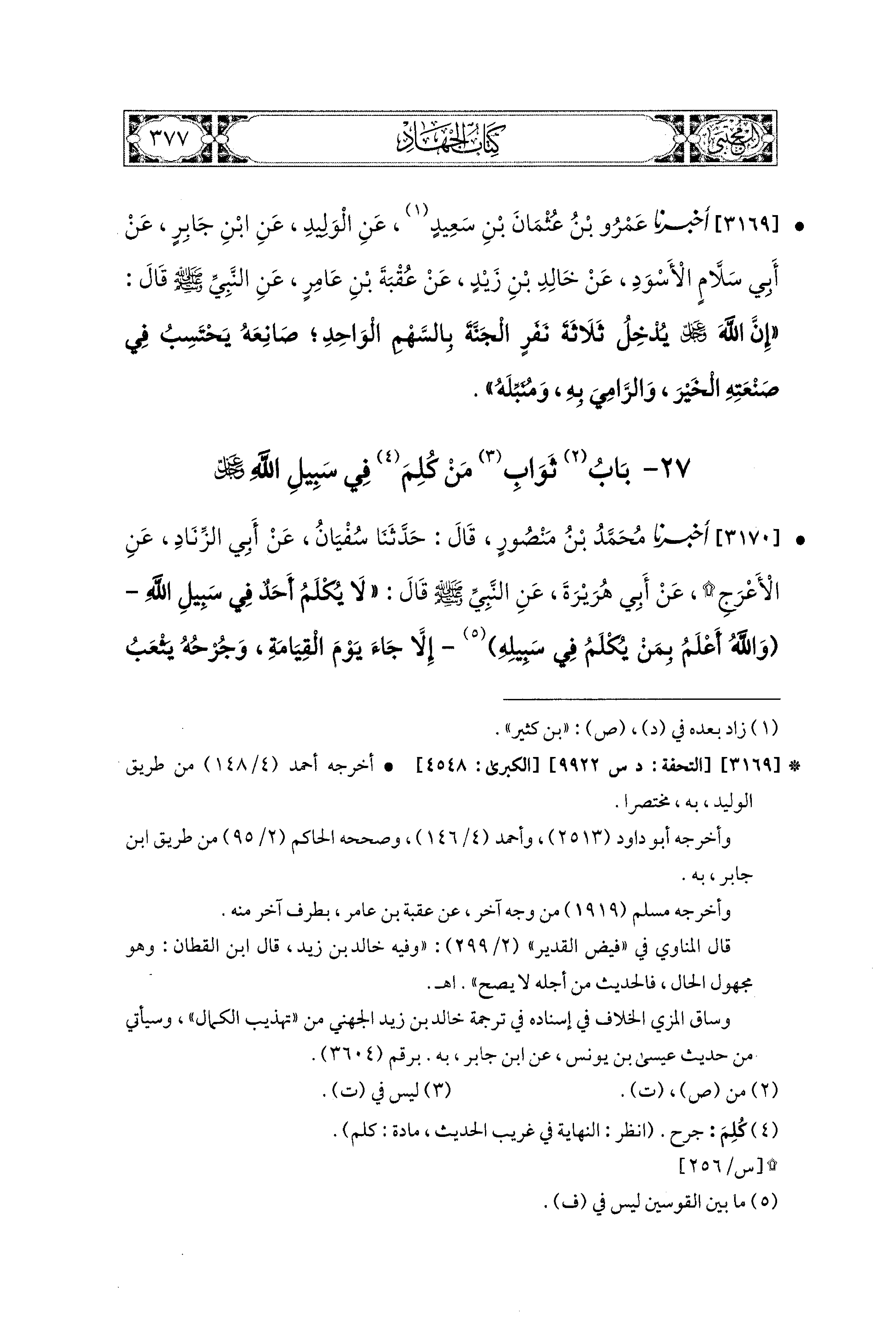 3170 - أَخبَرَنا مُحَمد بْنُ مَنْصُورٍ، قال: حَدثنا سُفيَانُ، عَن أَبي الزِّنَادِ، عَنِ الأَعْرَجِ، عَن أَبي هُرَيرَةَ، عَنِ النَّبيِّ صَلى الله عَليه وسَلم قَالَ: لاَ يُكْلَمُ أَحَدٌ فِي سَبِيلِ اللهِ وَاللهُ أَعْلَمُ بِمَنْ يُكْلَمُ فِي سَبِيلِهِ، إِلاَّ جَاءَ يَوْمَ القِيَامَةِ، وَجُرْحُهُ يَثْعَبُ دَمًا، اللَّوْنُ لَوْنُ الدَمٍ، وَالرِّيحُ رِيحُ المِسْكِ.