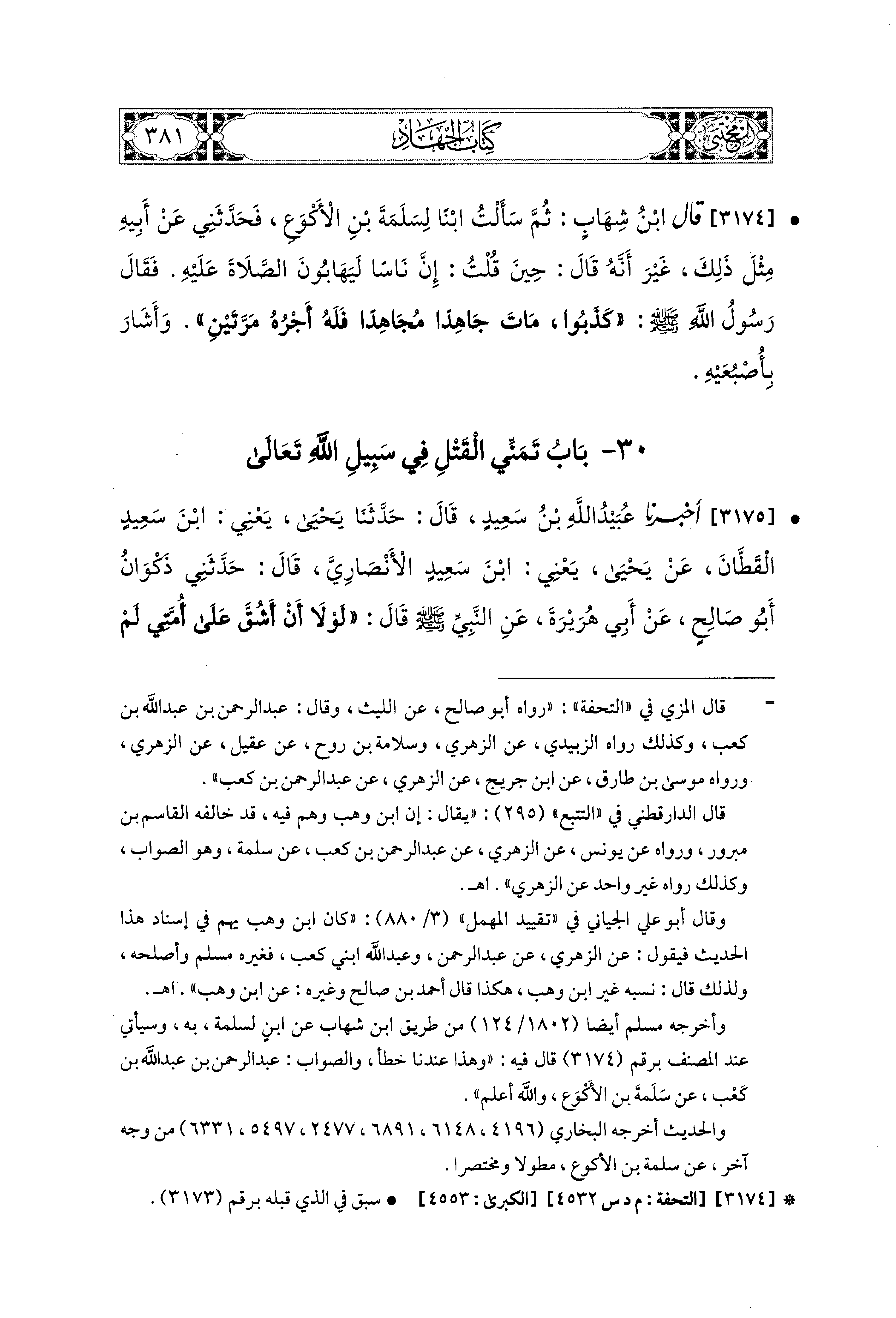3174 - قَالَ ابنُ شِهَابٍ: ثُمَّ سَأَلْتُ ابنًا لِسَلَمَةَ بْنِ الأَكْوَعِ، فَحَدَّثَني عَن أَبيهِ، مِثْلَ ذَلِكَ، غَيْرَ أَنَّهُ قَالَ حِينَ قُلْتُ: إِنَّ نَاسًا لَيَهَابُونَ الصَّلاَةَ عَلَيهِ، فَقَالَ رَسُولُ اللهِ صَلى الله عَليه وسَلم: كَذَبُوا، مَاتَ جَاهِدًا مُجَاهِدًا، فَلَهُ أَجْرُهُ مَرَّتَيْنِ، وَأَشَارَ بِإِصْبَعَيْهِ.