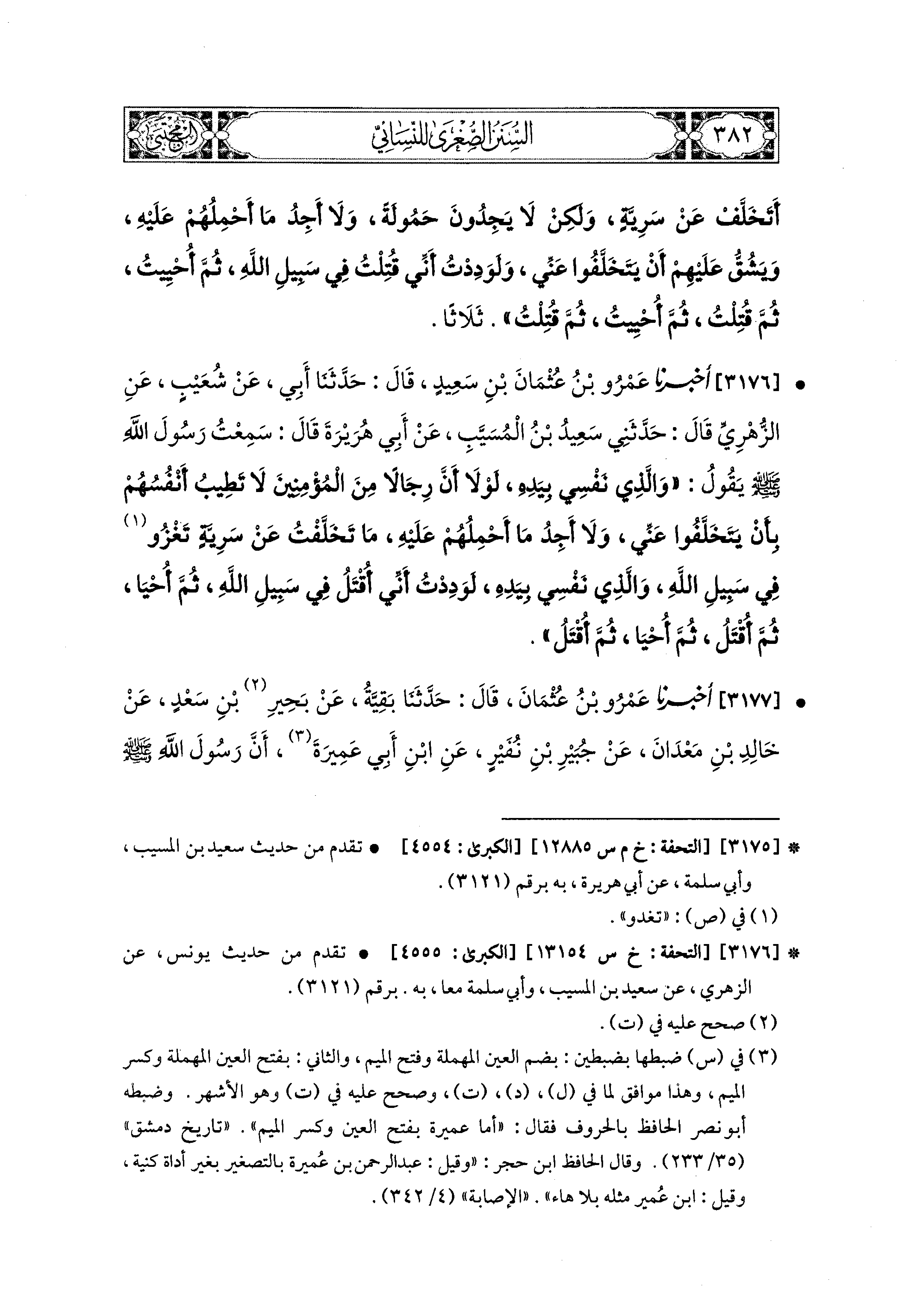 3176 - أَخبَرَنا عَمْرُو بْنُ عُثمَانَ بْنِ سَعيدٍ، قال: حَدثنا أَبي، عَن شُعَيبٍ، عَنِ الزُّهْرِيِّ، قَالَ: حَدَّثَني سَعيدُ بْنُ المُسَيَّبِ، عَن أَبي هُرَيرَةَ، قَالَ: سَمِعْتُ رَسُولَ اللهِ صَلى الله عَليه وسَلم يَقُولُ: وَالَّذِي نَفْسِي بِيَدِهِ، لَوْلاَ أَنَّ رِجَالاً مِنَ المُؤْمِنينَ لاَ تَطِيبُ أَنْفُسُهُمْ بِأَنْ يَتَخَلَّفُوا عَنِّي، وَلاَ أَجِدُ مَا أَحْمِلُهُمْ عَلَيهِ، مَا تَخَلَّفْتُ عَن سَرِيَّةٍ تَغْزُو فِي سَبِيلِ اللهِ، وَالَّذِي نَفْسِي بِيَدِهِ، لَوَدِدْتُ أَنِّي أُقْتَلُ فِي سَبِيلِ اللهِ، ثُمَّ أُحْيَا، ثُمَّ أُقْتَلُ، ثُمَّ أُحْيَا، ثُمَّ أُقْتَلُ.