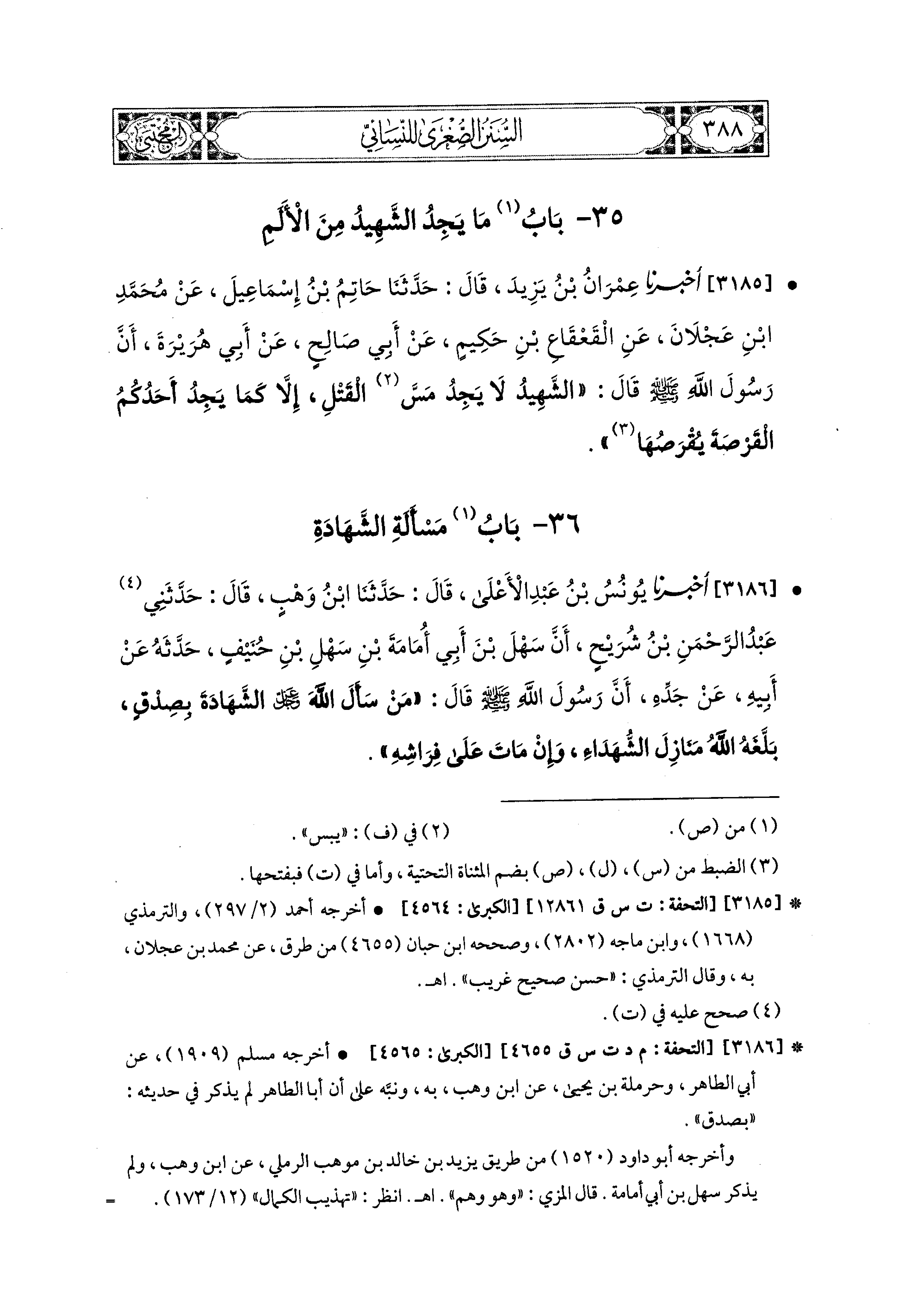 3186 - أَخبَرَنا يُونُسُ بن عَبدِ الأَعلَى، قال: حَدثنا ابنُ وَهْبٍ، قَالَ: حَدَّثَني عَبدُ الرَّحمَنِ بْنُ شُرَيْحٍ، أَنَّ سَهْلَ بْنَ أَبي أُمَامَةَ بْنِ سَهْلِ بْنِ حُنَيْفٍ، حَدَّثَهُ عَن أَبيهِ، عَن جَدِّهِ، أَنَّ رَسُولَ اللهِ صَلى الله عَليه وسَلم قَالَ: مَنْ سَأَلَ اللهَ عَزَّ وَجَلَّ الشَّهَادَةَ بِصِدْقٍ، بَلَّغَهُ اللهُ مَنَازِلَ الشُّهَدَاءِ، وَإِنْ مَاتَ عَلَى فِرَاشِهِ.