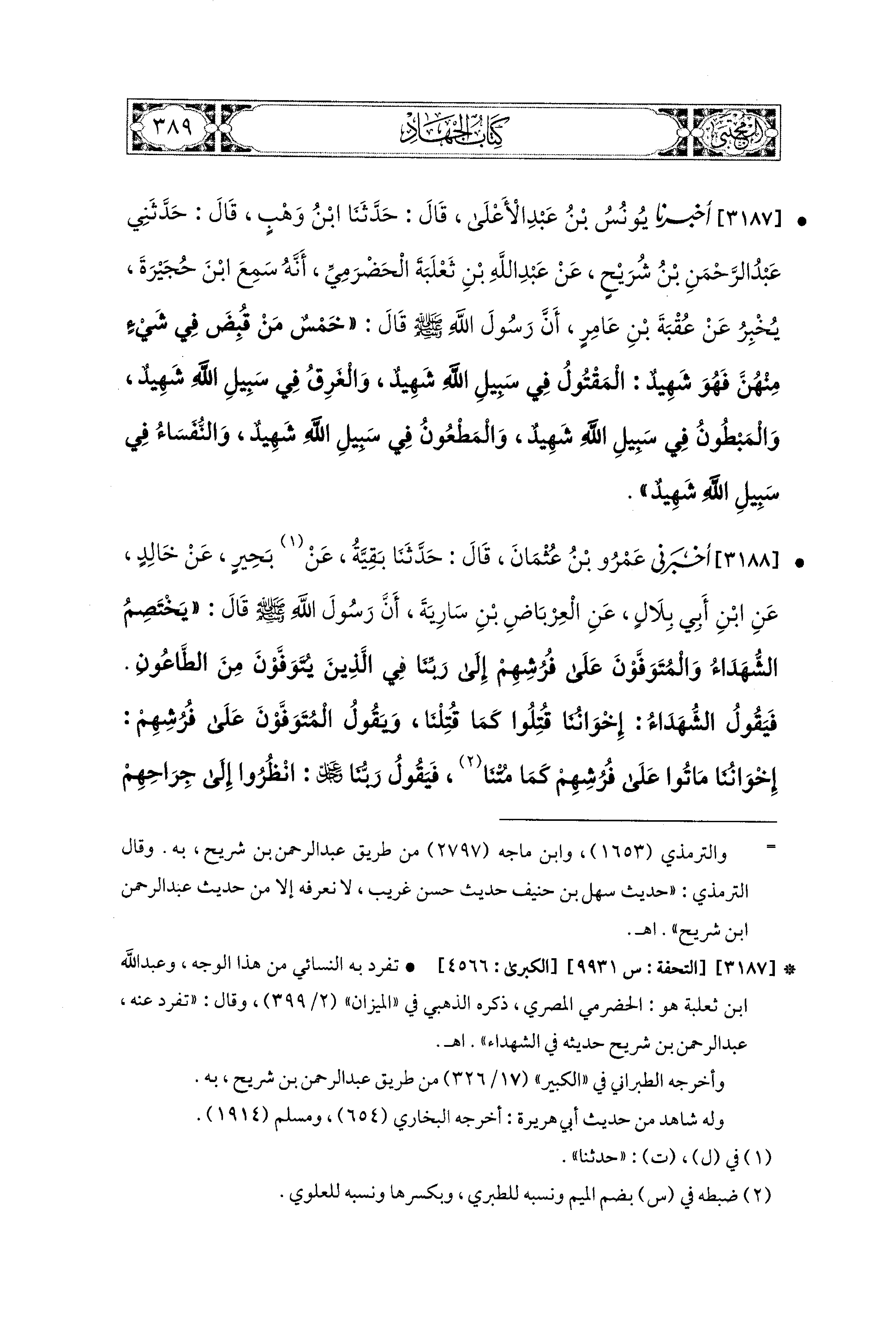 3188 - أَخبَرني عَمْرُو بْنُ عُثمَانَ، قال: حَدثنا بَقِيَّةُ، عَن بَحِيرٌ، عَن خَالِدٍ، عَنِ ابنِ أَبي بِلاَلٍ، عَنِ العِرْبَاضِ بْنِ سَارِيَةَ، أَنَّ رَسُولَ اللهِ صَلى الله عَليه وسَلم قَالَ: يَخْتَصِمُ الشُّهَدَاءُ وَالمُتَوَفَّوْنَ عَلَى فُرُشِهِمْ إِلَى رَبِّنَا فِي الَّذِينَ يُتَوَفَّوْنَ مِنَ الطَّاعُونِ، فَيَقُولُ الشُّهَدَاءُ: إِخْوَانُنَا قُتِلُوا كَمَا قُتِلْنَا، وَيَقُولُ المُتَوَفَّوْنَ عَلَى فُرُشِهِمْ: إِخْوَانُنَا مَاتُوا عَلَى فُرُشِهِمْ كَمَا مُتْنَا، فَيَقُولُ رَبُّنَا عَزَّ وَجَلَّ: انْظُرُوا إِلَى جِرَاحِهِمْ، فَإِنْ أَشْبَهَ جِرَاحُهُمْ جِرَاحَ المَقْتُولِينَ، فَإِنَّهُمْ مِنْهُمْ وَمَعَهُمْ، فَإِذَا جِرَاحُهُمْ قَدْ أَشْبَهَتْ جِرَاحَهُمْ.