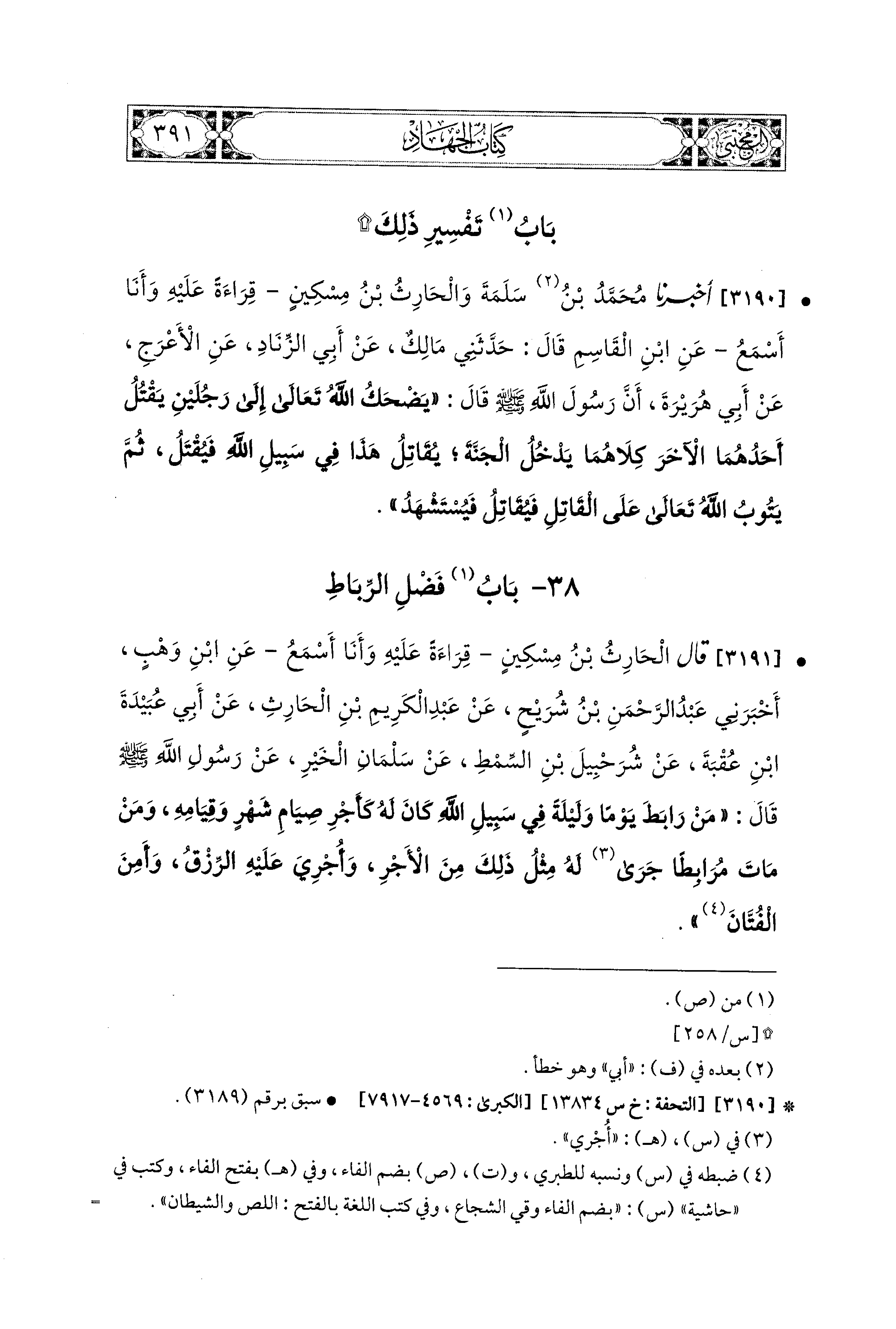 3191 - قَالَ: الحَارِثُ بْنُ مِسكينٍ، قِرَاءَةً عَلَيهِ وَأَنَا أَسْمَعُ، عَنِ ابنِ وَهْبٍ، أَخبَرني عَبدُ الرَّحمَنِ بْنُ شُرَيْحٍ، عَن عَبدِ الكَرِيمِ بْنِ الحَارِثِ، عَن أَبي عُبَيدَةَ بْنِ عُقْبَةَ، عَن شُرَحْبِيلَ بْنِ السِّمْطِ، عَن سَلْمَانَ الخَيْرِ، عَن رَسُولِ اللهِ صَلى الله عَليه وسَلم قَالَ: مَنْ رَابَطَ يَوْمًا وَلَيْلَةً فِي سَبِيلِ اللهِ كَانَ لَهُ كَأَجْرِ صِيَامِ شَهْرٍ وَقِيَامِهِ، وَمَنْ مَاتَ مُرَابِطًا جْرِيَ لَهُ مِثْلُ ذَلِكَ مِنَ الأَجْرِ، وَأُجْرِيَ عَلَيهِ الرِّزْقُ، وَأَمِنَ الفَتَّانِ.