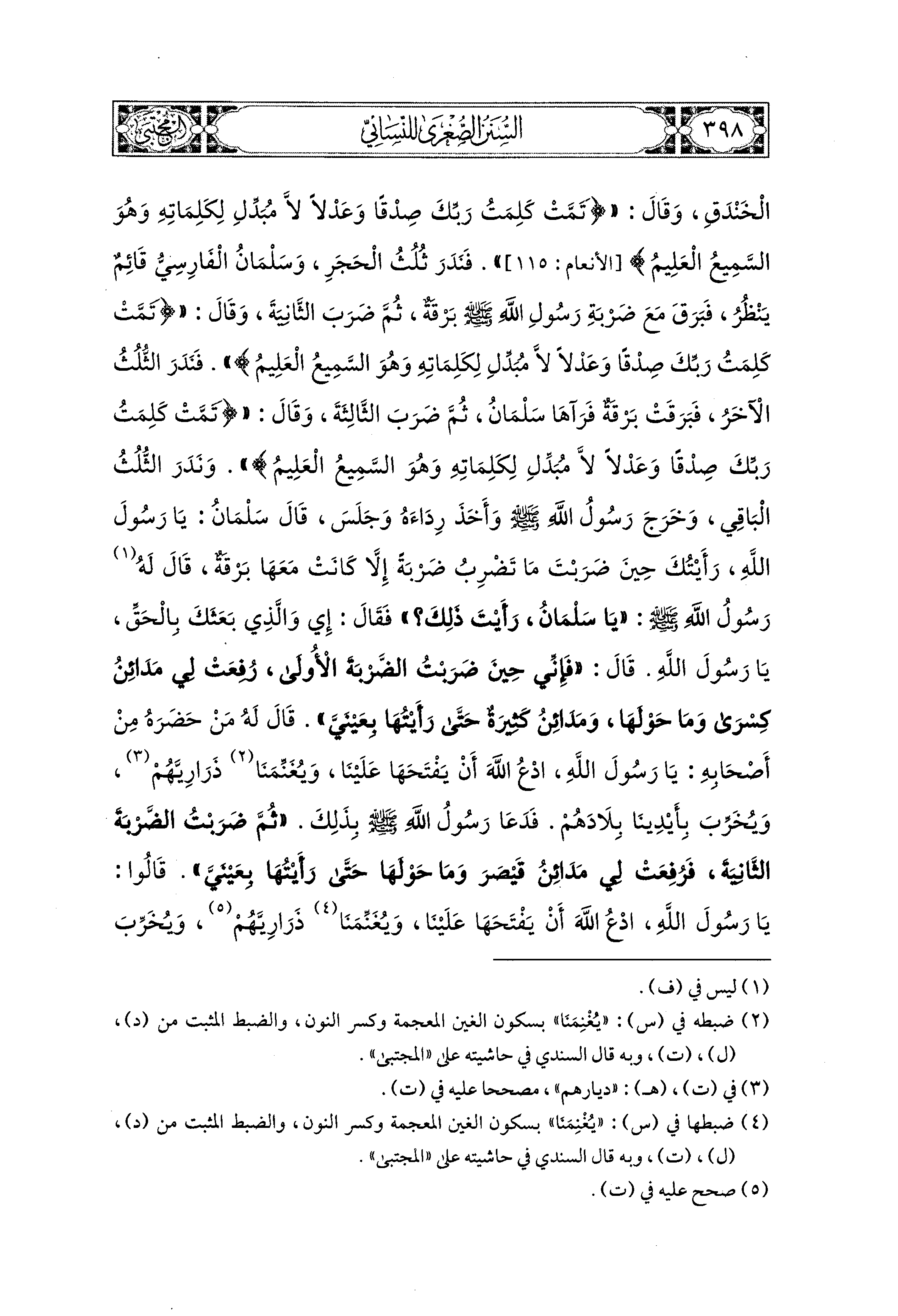 قَالَ لَهُ رَسُولُ اللهِ صَلى الله عَليه وسَلم: يَا سَلْمَانُ، رَأَيْتَ ذَلِكَ؟ فَقَالَ: إِي وَالَّذِي بَعَثَكَ بِالحَقِّ يَا رَسُولَ اللهِ، قَالَ: فَإِنِّي حِينَ ضَرَبْتُ الضَّرْبَةَ الأُولَى رُفِعَتْ لِي مَدَائِنُ كِسْرَى وَمَا حَوْلَهَا وَمَدَائِنُ كَثِيرَةٌ، حَتَّى رَأَيْتُهَا بِعَيْنَيَّ، قَالَ لَهُ مَنْ حَضَرَهُ مِنْ أَصْحَابِهِ: يَا رَسُولَ اللهِ، ادْعُ اللهَ أَنْ يَفْتَحَهَا عَلَيْنَا وَيُغَنِّمَنَا ذراريهم، وَيُخَرِّبَ بِأَيْدِينَا بِلاَدَهُمْ، فَدَعَا رَسُولُ اللهِ صَلى الله عَليه وسَلم بِذَلِكَ، ثُمَّ ضَرَبْتُ الضَّرْبَةَ الثَّانيَةَ، فَرُفِعَتْ لِي مَدَائِنُ قَيْصَرَ وَمَا حَوْلَهَا، حَتَّى رَأَيْتُهَا بِعَيْنَيَّ، قَالُوا: يَا رَسُولَ اللهِ، ادْعُ اللهَ أَنْ يَفْتَحَهَا عَلَيْنَا وَيُغَنِّمَنَا ذراريهم، وَيُخَرِّبَ بِأَيْدِينَا بِلاَدَهُمْ، فَدَعَا رَسُولُ اللهِ صَلى الله عَليه وسَلم بِذَلِكَ، ثُمَّ ضَرَبْتُ الثَّالِثَةَ، فَرُفِعَتْ لِي مَدَائِنُ الحَبَشَةِ وَمَا حَوْلَهَا مِنَ القُرَى، حَتَّى رَأَيْتُهَا بِعَيْنَيَّ، قَالَ رَسُولُ اللهِ صَلى الله عَليه وسَلم عِنْدَ ذَلِكَ: دَعُوا الحَبَشَةَ مَا وَدَعُوكُمْ، وَاتْرُكُوا التُّرْكَ مَا تَرَكُوكُمْ.