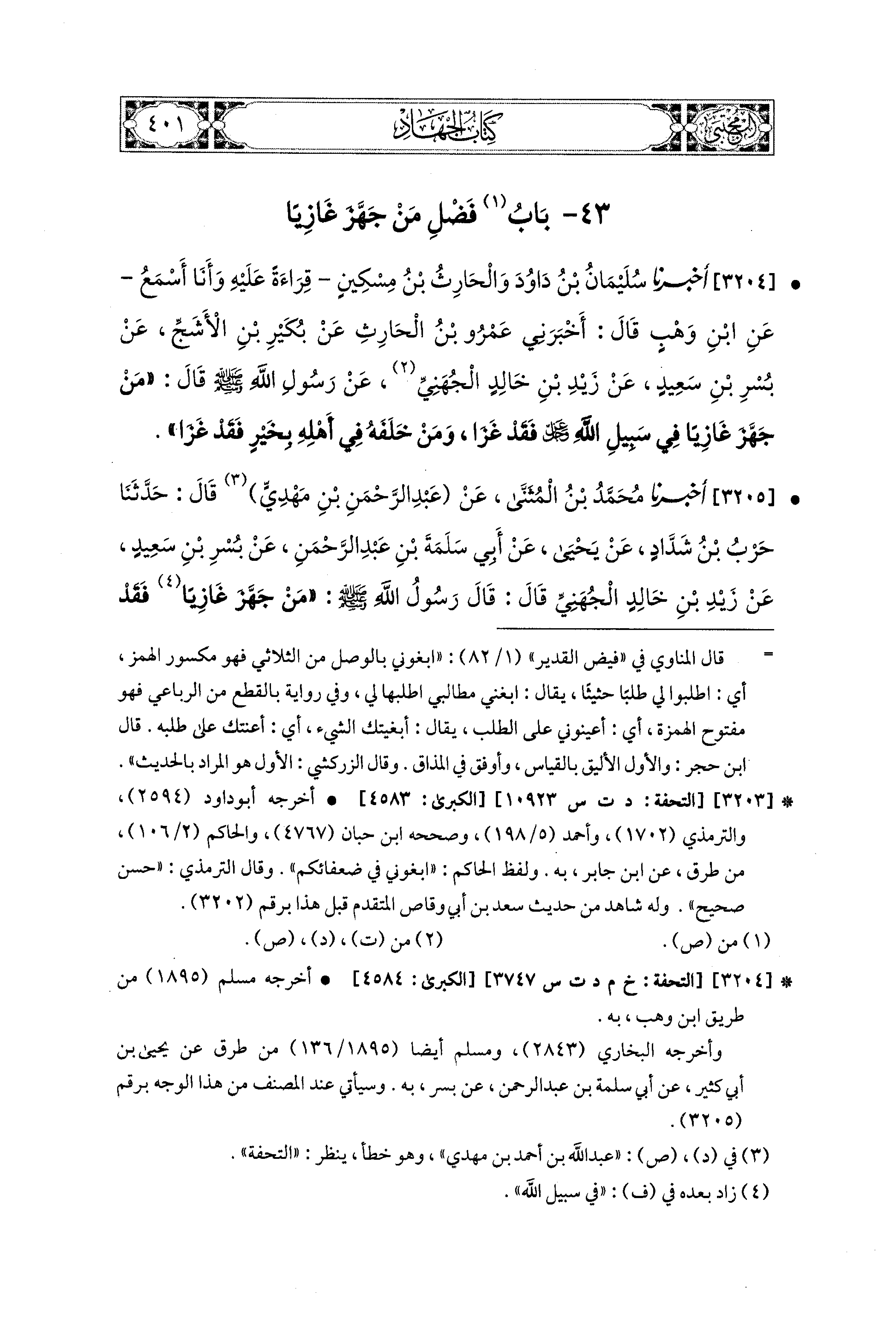 3205 - أَخبَرَنا مُحَمد بْنُ المُثَنَّى، عَن عَبدِ الرَّحمَنِ بْنِ مَهْدِيٍّ، قال: حَدثنا حَرْبُ بْنُ شَدَّادٍ، عَن يَحيَى، عَن أَبي سَلَمَةَ بْنِ عَبدِ الرَّحمَنِ، عَن بُسْرِ بْنِ سَعيدٍ، عَن زَيْدِ بْنِ خَالِدٍ الجُهَنيِّ، قَالَ: قَالَ رَسُولُ اللهِ صَلى الله عَليه وسَلم: مَنْ جَهَّزَ غَازِيًا، فَقَدْ غَزَا، وَمَنْ خَلَفَ غَازِيًا فِي أَهْلِهِ بِخَيْرٍ فَقَدْ غَزَا.