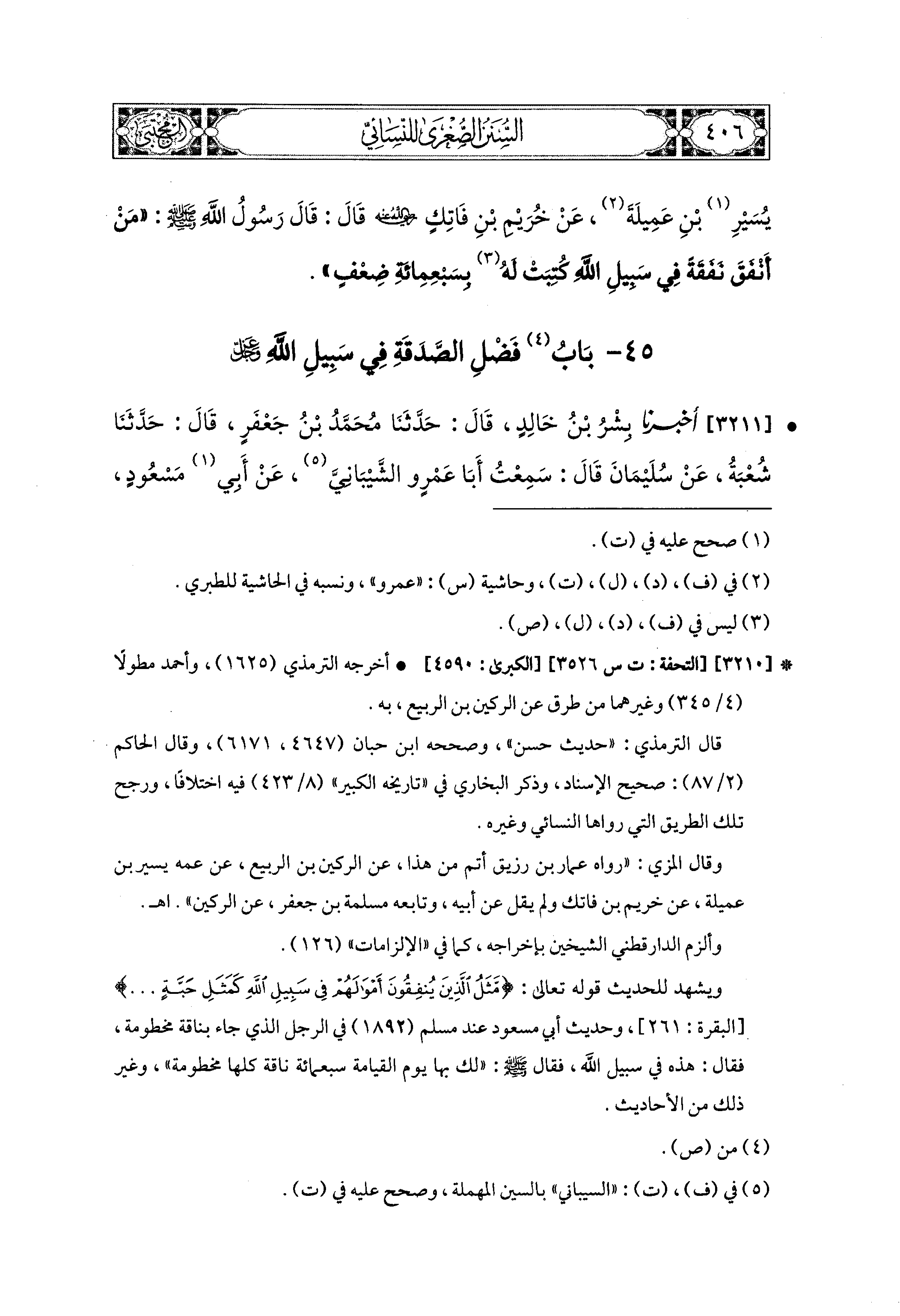 3211 - أَخبَرَنا بِشْرُ بْنُ خَالِدٍ، قال: حَدثنا مُحَمدُ بْنُ جَعْفَرٍ، قال: حَدثنا شُعبَةُ، عَن سُلَيمَانَ، قَالَ: سَمِعْتُ أَبَا عَمْرٍو الشَّيْبَانيَّ، عَن أَبي مَسْعُودٍ، أَنَّ رَجُلاً تَصَدَّقَ بِنَاقَةٍ مَخْطُومَةٍ فِي سَبِيلِ اللهِ عَزَّ وَجَلَّ، فَقَالَ رَسُولُ اللهِ صَلى الله عَليه وسَلم: لَيَأْتِيَنَّ يَوْمَ القِيَامَةِ بِسَبْعِمِئَةِ نَاقَةٍ مَخْطُومَةٍ.