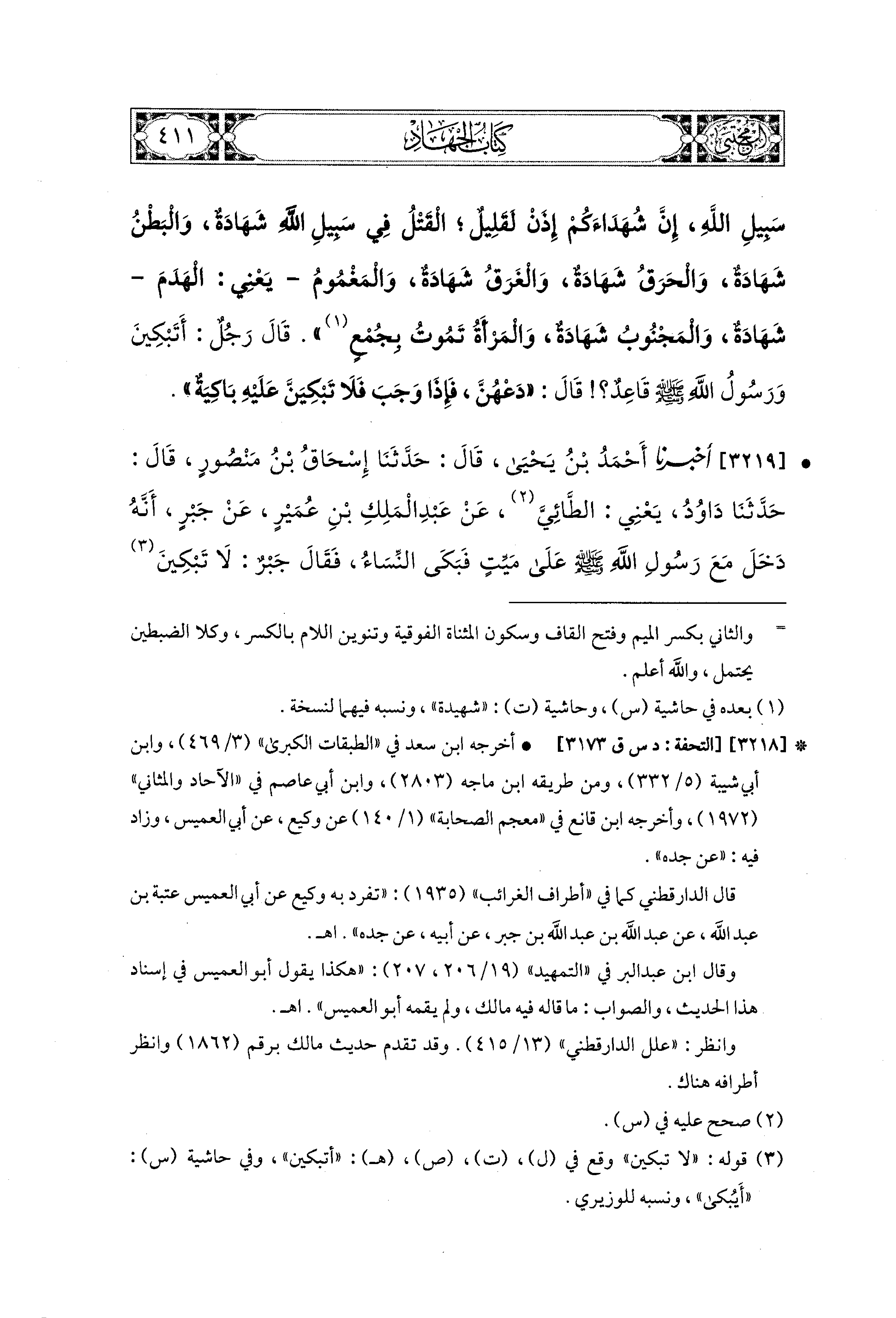 3219 - أَخبَرَنا أَحْمَدُ بْنُ يَحيَى، قال: حَدثنا إِسحَاقُ بْنُ مَنْصُورٍ، قال: حَدثنا دَاوُدُ، يَعْني الطَّائِيَّ، عَن عَبدِ المَلِكِ بْنِ عُمَيْرٍ، عَن جَبْرٍ، أَنَّهُ دَخَلَ مَعَ رَسُولِ اللهِ صَلى الله عَليه وسَلم عَلَى مَيِّتٍ، فَبَكَى النِّسَاءُ، فَقَالَ جَبْرٌ: لا تَبْكِيَنَّ مَا دَامَ رَسُولُ اللهِ صَلى الله عَليه وسَلم جَالِسًا، قَالَ: دَعْهُنَّ يَبْكِينَ مَا دَامَ بَيْنَهُنَّ، فَإِذَا وَجَبَ فَلاَ تَبْكِيَنَّ بَاكِيَةٌ.