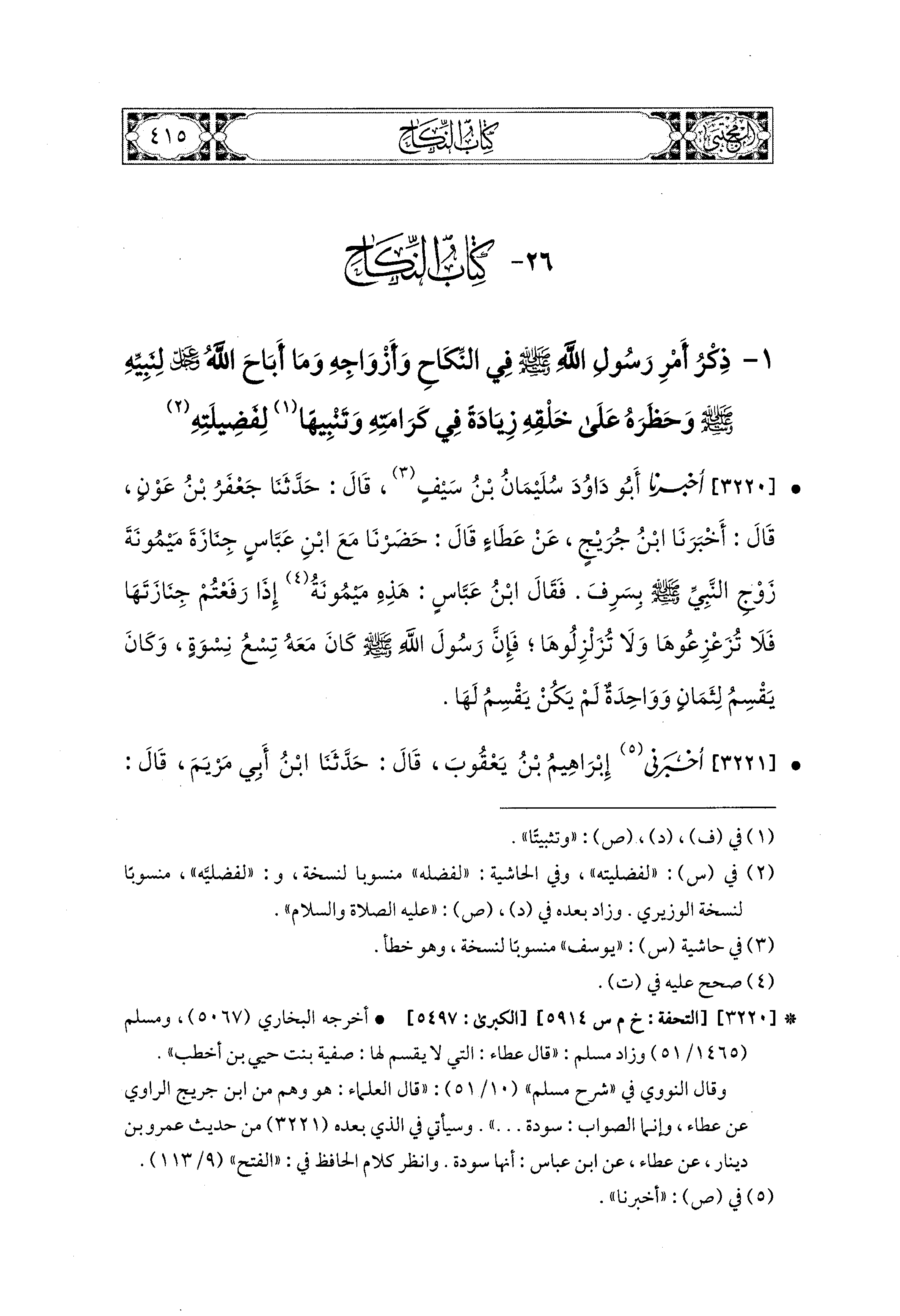 3221 - أَخبَرني إِبراهِيمُ بْنُ يَعقُوبَ، قال: حَدثنا ابنُ أَبي مَرْيَمَ، قَالَ: أَخبَرنا سُفيَانُ، قَالَ: حَدَّثَني عَمْرُو بْنُ دِينَارٍ، عَن عَطَاءٍ، عَنِ ابنِ عَبَّاسٍ، قَالَ: تُوُفِّيَ رَسُولُ اللهِ صَلى الله عَليه وسَلم وَعِنْدَهُ تِسْعُ نِسْوَةٍ يُصِيبُهُنَّ إِلاَّ سَوْدَةَ، فَإِنَّهَا وَهَبَتْ يَوْمَهَا وَلَيْلَتَهَا لِعَائِشَةَ.
