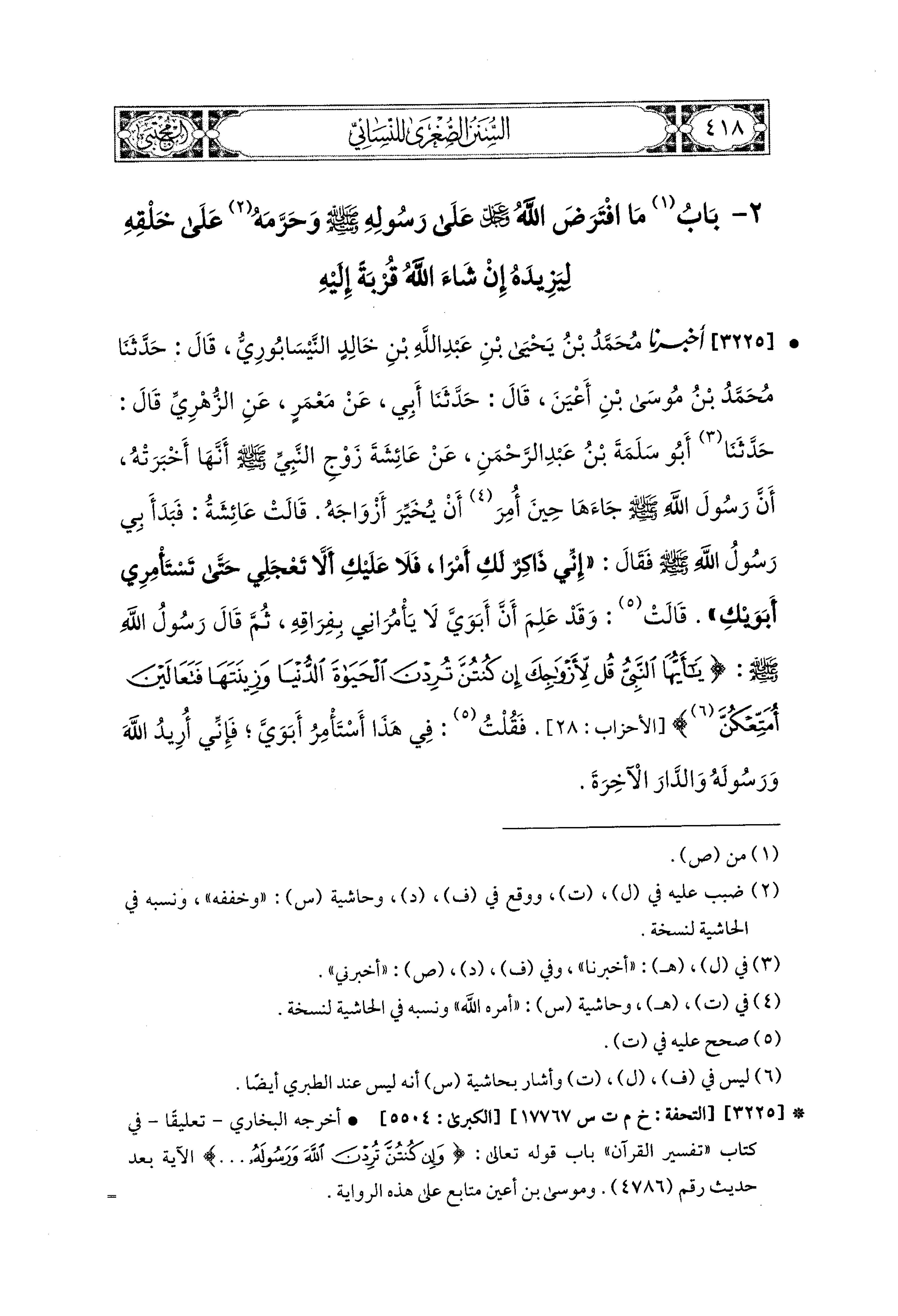 3225 - أَخبَرَنا مُحَمد بْنُ يَحيَى بْنِ عَبدِ اللهِ بْنِ خَالِدٍ النَّيْسَابُورِيُّ، قال: حَدثنا مُحَمدُ بْنُ مُوسَى بْنِ أَعْيَنَ، قال: حَدثنا أَبي، عَن مَعْمَرٍ، عَنِ الزُّهْرِيِّ، قال: حَدثنا أَبو سَلَمَةَ بْنُ عَبدِ الرَّحمَنِ، عَن عَائِشَةَ، زَوْجِ النَّبيِّ صَلى الله عَليه وسَلم، أَنَّهَا أَخْبَرَتْهُ، أَنَّ رَسُولَ اللهِ صَلى الله عَليه وسَلم جَاءَهَا حِينَ أُمِرَ أَنْ يُخَيِّرَ أَزْوَاجَهُ، قَالَتْ عَائِشَةُ: فَبَدَأَ بِي رَسُولُ اللهِ صَلى الله عَليه وسَلم، فَقَالَ: إِنِّي ذَاكِرٌ لَكِ أَمْرًا، فَلاَ عَلَيْكِ أَنْ لاَ تُعَجِّلِي حَتَّى تَسْتَأْمِرِي أَبَوَيْكِ، قَالَتْ: وَقَدْ عَلِمَ أَنَّ أَبَوَيَّ لاَ يَأْمُرَاني بِفِرَاقِهِ، ثُمَّ قَالَ رَسُولُ اللهِ صَلى الله عَليه وسَلم: {يَا أَيُّهَا النَّبيُّ قُلْ لأَزْوَاجِكَ إِنْ كُنْتُنَّ تُرِدْنَ الحَيَاةَ الدُّنْيَا وَزِينَتَهَا فَتَعَالَيْنَ أُمَتِّعْكُنَّ}، فَقُلْتُ: فِي هَذَا أَسْتَأْمِرُ أَبَوَيَّ فَإِنِّي أُرِيدُ اللهَ وَرَسُولَهُ وَالدَّارَ الآخِرَةَ.