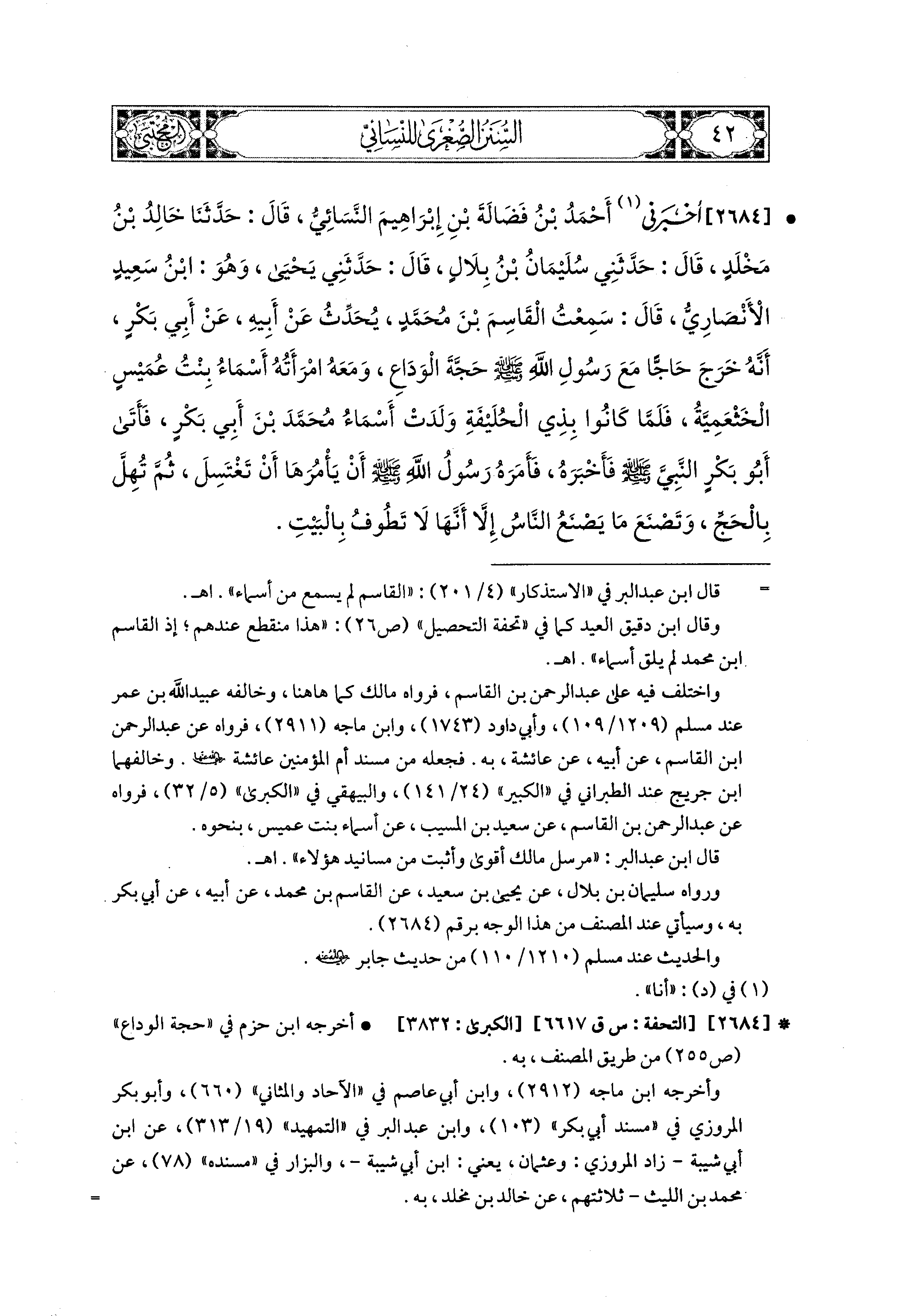 2684 - أَخبَرني أَحْمَدُ بْنُ فَضَالَةَ بْنِ إِبراهِيمَ النَّسَائِيُّ، قال: حَدثنا خَالِدُ بْنُ مَخْلَدٍ، قَالَ: حَدَّثَني سُلَيمَانُ بْنُ بِلاَلٍ، قَالَ: حَدَّثَني يَحيَى، وَهُوَ ابنُ سَعيدٍ الأَنصَارِيُّ، قَالَ: سَمِعْتُ القَاسِمَ بْنَ مُحَمدٍ، يُحَدِّثُ عَن أَبيهِ، عَن أَبي بَكْرٍ، أَنَّهُ خَرَجَ حَاجًّا مَعَ رَسُولِ اللهِ صَلى الله عَليه وسَلم حَجَّةَ الوَدَاعِ، وَمَعَهُ امْرَأَتُهُ أَسْمَاءُ بِنْتُ عُمَيْسٍ الخَثْعَميَّةُ، فَلَمَّا كَانُوا بِذِي الحُلَيْفَةِ، وَلَدَتْ أَسْمَاءُ مُحَمدَ بْنَ أَبي بَكْرٍ، فَأَتَى أَبو بَكْرٍ النَّبيَّ صَلى الله عَليه وسَلم فَأَخْبَرَهُ، فَأَمَرَهُ رَسُولُ اللهِ صَلى الله عَليه وسَلم أَنْ يَأْمُرَهَا، أَنْ تَغْتَسِلَ ثُمَّ تُهِلَّ بِالحَجِّ، وَتَصْنَعَ مَا يَصْنَعُ النَّاسُ، إِلاَّ أَنَّهَا لاَ تَطُوفُ بِالبَيْتِ.