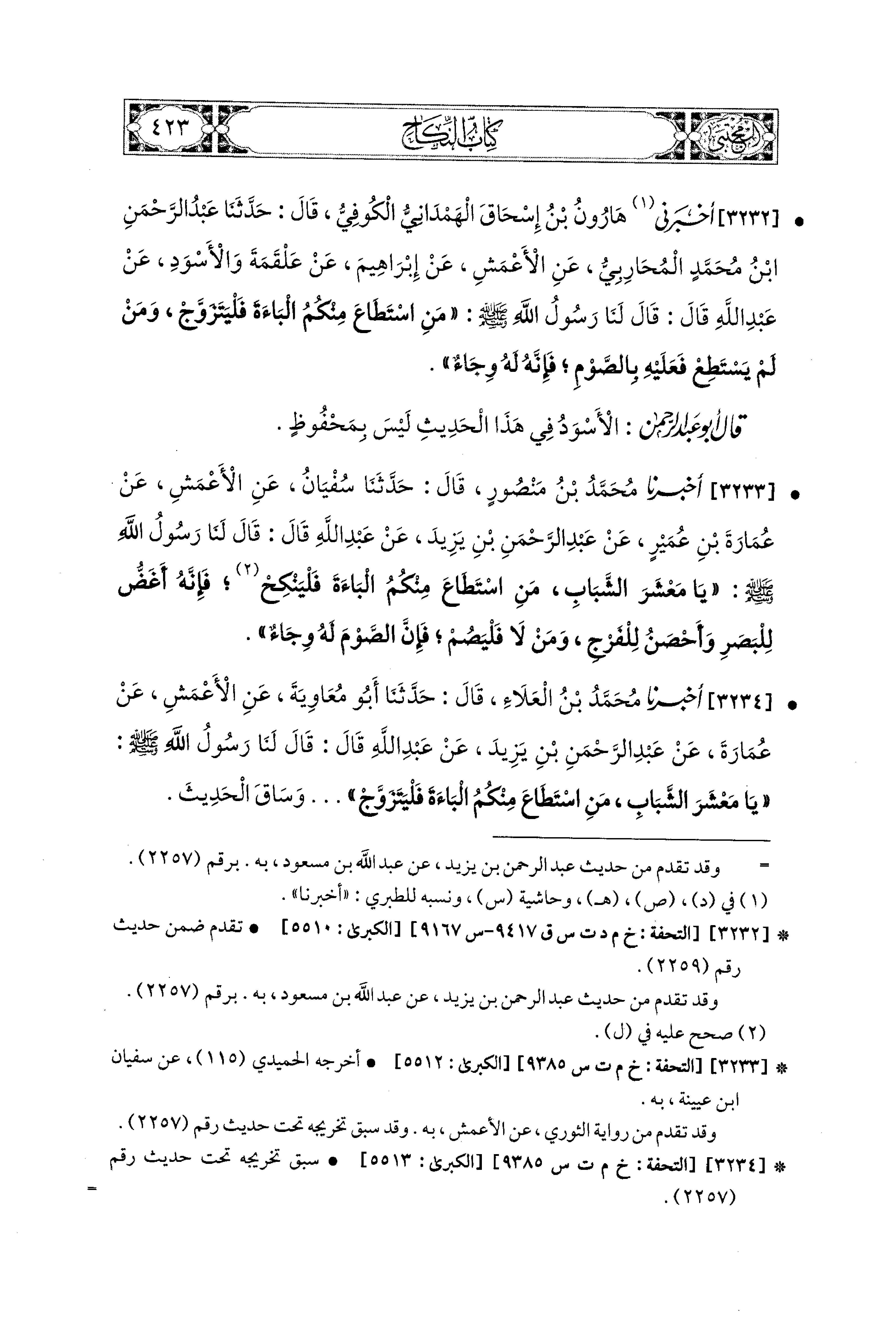 3234 - أَخبَرَنا مُحَمد بْنُ العَلاَءِ، قال: حَدثنا أَبو مُعَاوِيَةَ، عَنِ الأَعْمَشِ، عَن عُمَارَةَ، عَن عَبدِ الرَّحمَنِ بْنِ يَزِيدَ، عَن عَبدِ اللهِ، قَالَ: قَالَ لَنَا رَسُولُ اللهِ صَلى الله عَليه وسَلم: يَا مَعْشَرَ الشَّبَابِ، مَنِ اسْتَطَاعَ مِنْكُمُ البَاءَةَ فَلْيَتَزَوَّجْ ... وَسَاقَ الحَدِيثَ.
