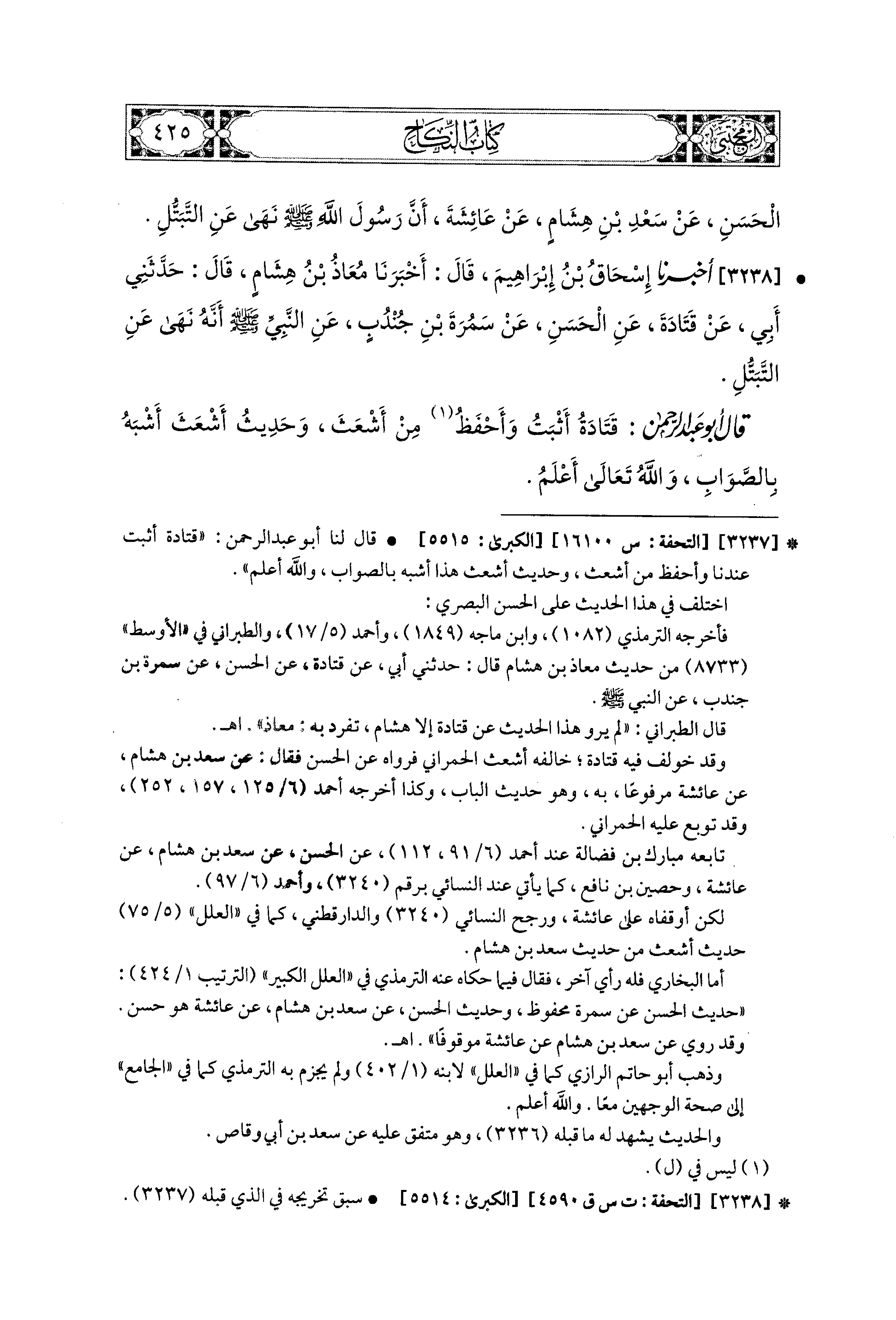 3238 - أَخبَرَنا إِسحَاقُ بْنُ إِبراهِيمَ، قَالَ: أَخبَرنا مُعَاذُ بْنُ هِشَامٍ، قَالَ: حَدَّثَني أَبي، عَن قَتَادَةَ، عَنِ الحَسَنِ، عَن سَمُرَةَ بْنِ جُنْدُبٍ، عَنِ النَّبيِّ صَلى الله عَليه وسَلم أَنَّهُ نَهَى عَنِ التَّبَتُّلِ.