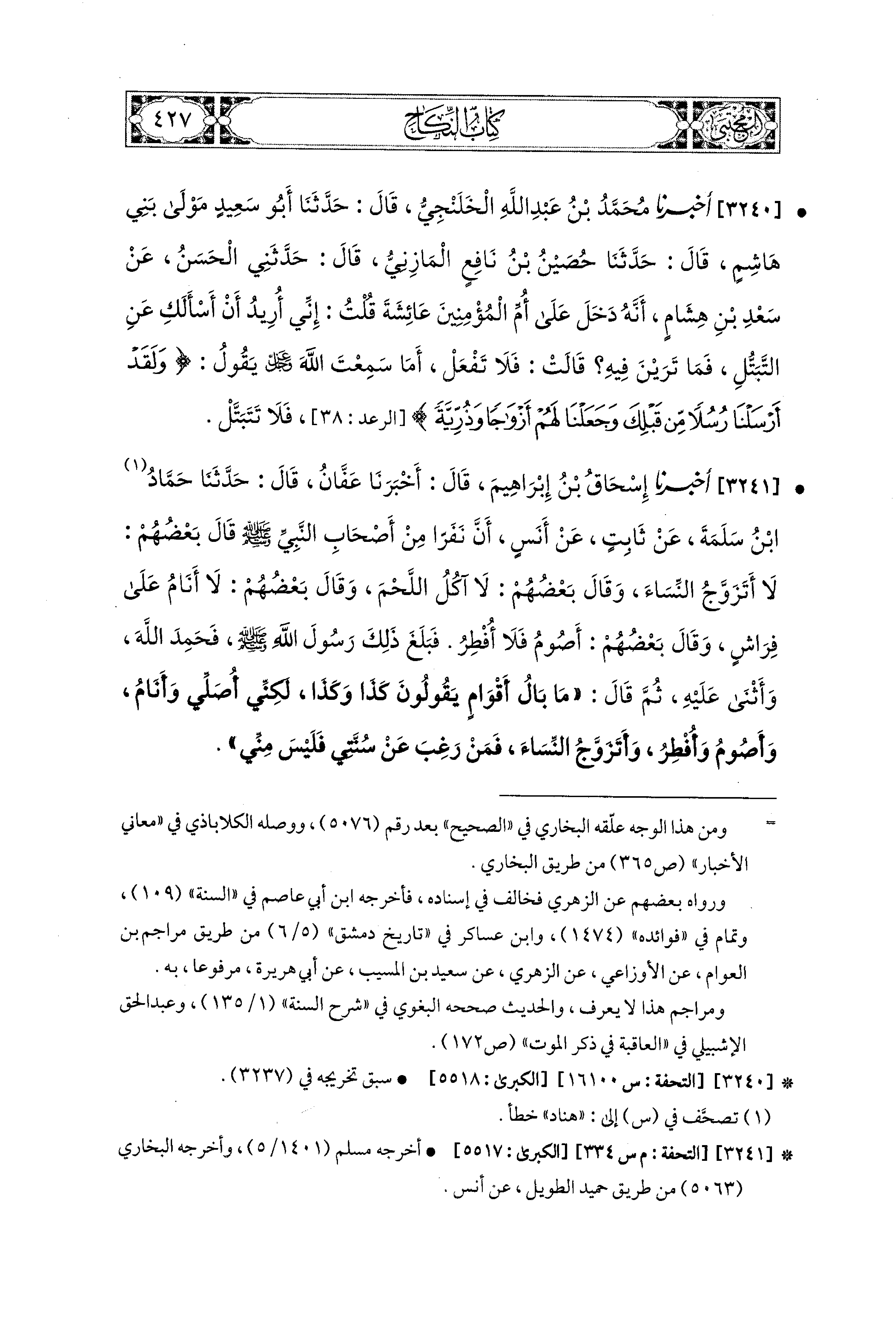 3241 - أَخبَرَنا إِسحَاقُ بْنُ إِبراهِيمَ، قَالَ: أَخبَرنا عَفَّانُ، قال: حَدثنا حَمَّادُ بْنُ سَلَمَةَ، عَن ثَابِتٍ، عَن أَنَسٍ، أَنَّ نَفَرًا مِنْ أَصْحَابِ النَّبيِّ صَلى الله عَليه وسَلم قَالَ بَعْضُهُمْ: لاَ أَتَزَوَّجُ النِّسَاءَ، وَقَالَ بَعْضُهُمْ: لاَ آكُلُ اللَّحْمَ، وَقَالَ بَعْضُهُمْ: لاَ أَنَامُ عَلَى فِرَاشٍ، وَقَالَ بَعْضُهُمْ: أَصُومُ فَلاَ أُفْطِرُ، فَبَلَغَ ذَلِكَ رَسُولَ اللهِ صَلى الله عَليه وسَلم، فَحَمِدَ اللهَ وَأَثْنَى عَلَيهِ، ثُمَّ قَالَ: مَا بَالُ أَقْوَامٍ يَقُولُونَ كَذَا وَكَذَا، لَكِنِّي أُصَلِّي وَأَنَامُ، وَأَصُومُ وَأُفْطِرُ وَأَتَزَوَّجُ النِّسَاءَ، فَمَنْ رَغِبَ عَن سُنَّتِي فَلَيْسَ مِنِّي.