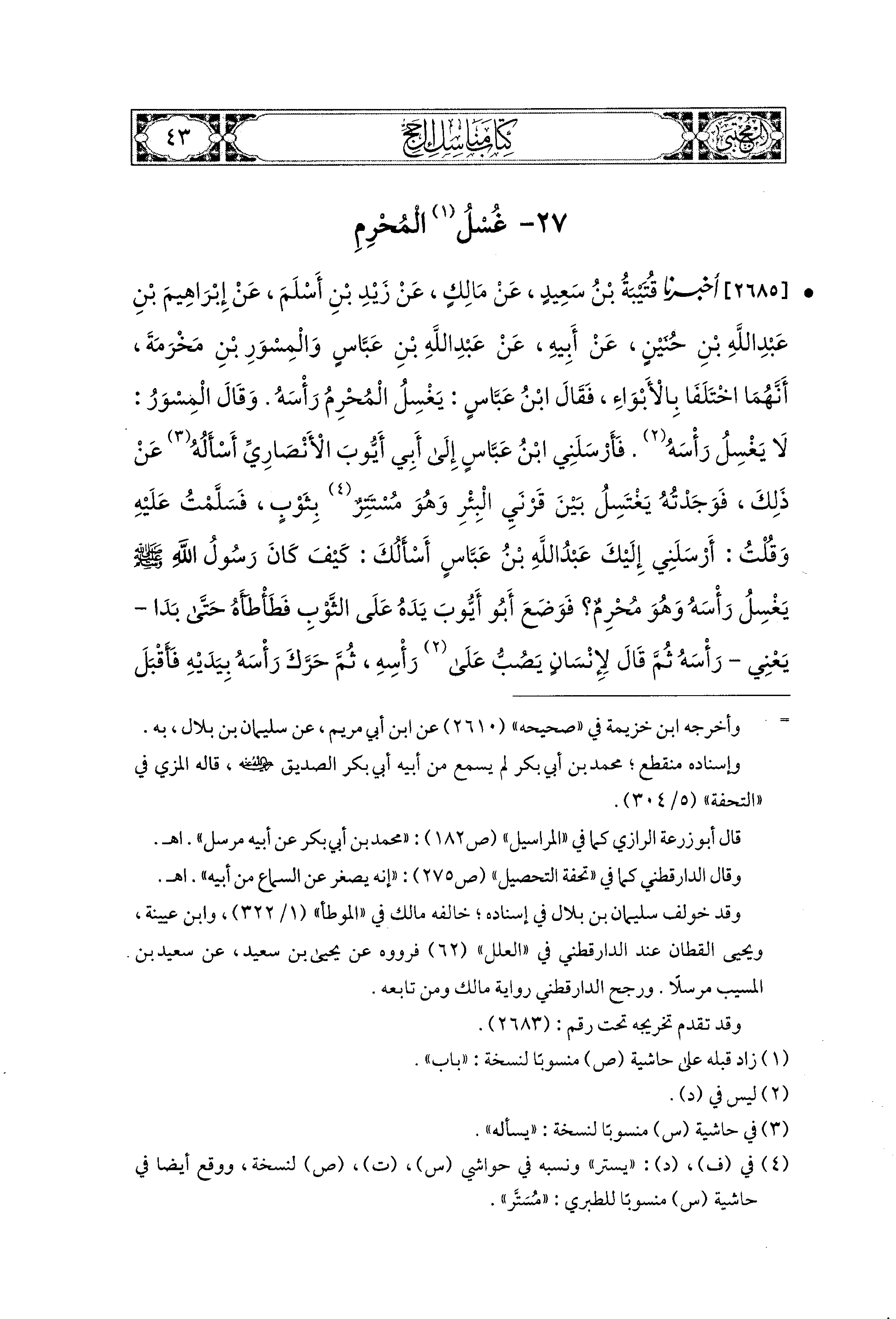2685 - أَخبَرَنا قُتَيبَةُ بْنُ سَعيدٍ، عَن مَالِكٍ، عَن زَيْدِ بْنِ أَسْلَمَ، عَن إِبراهِيمَ بْنِ عَبدِ اللهِ بْنِ حُنَيْنٍ، عَن أَبيهِ، عَن عَبد اللهِ بن عَبَّاسٍ، وَالمِسْوَرِ بْنِ مَخْرَمَةَ، أَنَّهُمَا اخْتَلَفَا بِالأَبْوَاءِ فَقَالَ ابنُ عَبَّاسٍ: يَغْسِلُ المُحْرِمُ رَأْسَهُ، وَقَالَ المِسْوَرُ: لاَ يَغْسِلُ رَأْسَهُ، فَأَرْسَلَني ابنُ عَبَّاسٍ إِلَى أَبي أَيُّوبَ الأَنصَارِيِّ أَسْأَلُهُ عَن ذَلِكَ، فَوَجَدْتُهُ يَغْتَسِلُ بَيْنَ قَرْنَيِ البِئْرِ، وَهُوَ مُسْتَتِرٌ بِثَوْبٍ، فَسَلَّمْتُ عَلَيهِ، وَقُلْتُ: أَرْسَلَني إِلَيْكَ عَبدُ اللهِ بْنُ عَبَّاسٍ أَسْأَلُكَ كَيْفَ كَانَ رَسُولُ اللهِ صَلى الله عَليه وسَلم يَغْسِلُ رَأْسَهُ وَهُوَ مُحْرِمٌ؟ فَوَضَعَ أَبو أَيُّوبَ يَدَهُ عَلَى الثَّوْبِ فَطَأْطَأَهُ حَتَّى بَدَا يعني رَأْسُهُ، ثُمَّ قَالَ لإِنْسَانٍ: يَصُبُّ عَلَى رَأْسِهِ، ثُمَّ حَرَّكَ رَأْسَهُ بِيَدَيْهِ، فَأَقْبَلَ بِهِمَا، وَأَدْبَرَ، وَقَالَ: هَكَذَا رَأَيْتُ رَسُولَ اللهِ صَلى الله عَليه وسَلم يَفْعَلُ.