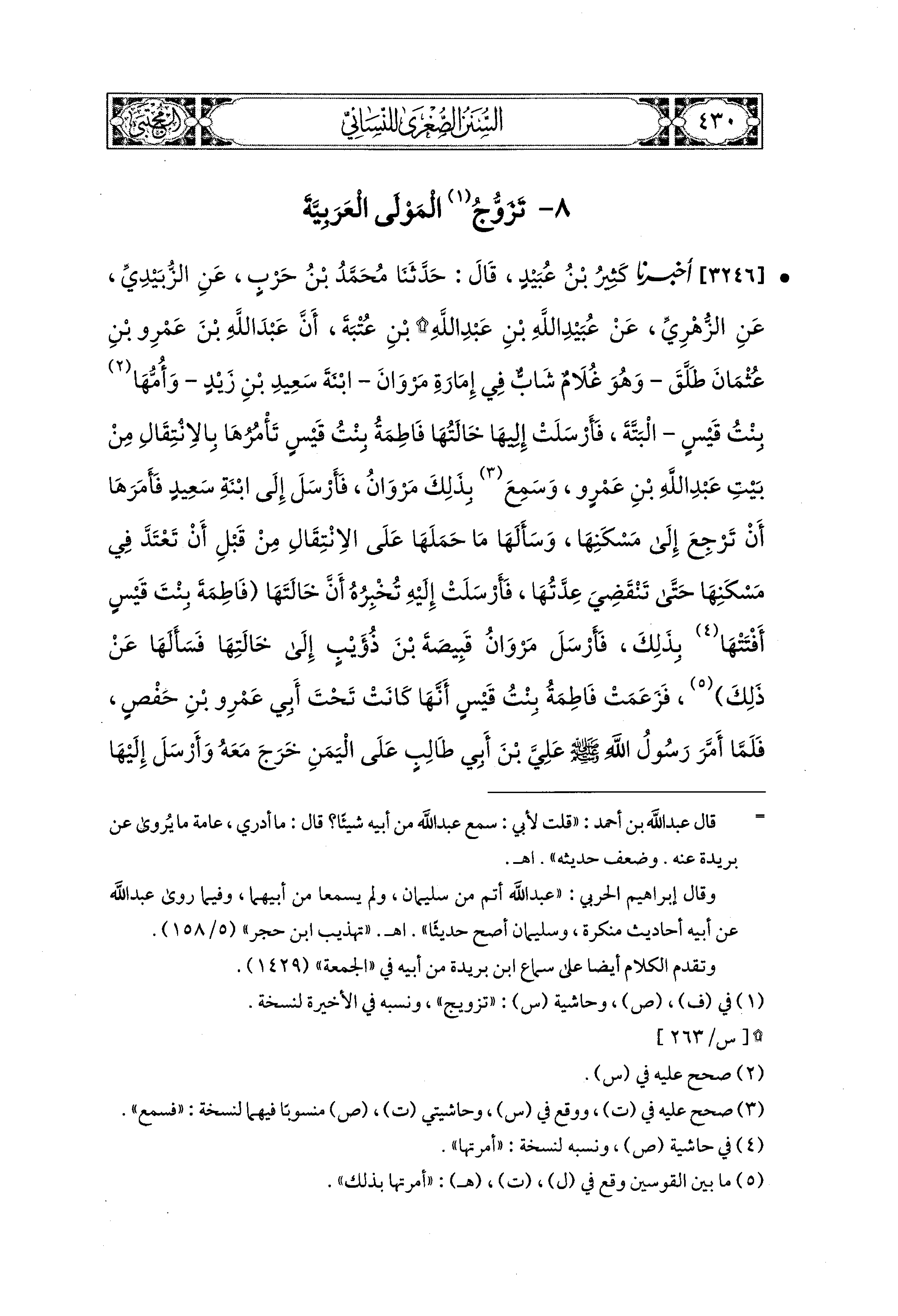 3246 - أَخبَرَنا كَثِيرُ بْنُ عُبَيدٍ، قال: حَدثنا مُحَمدُ بْنُ حَرْبٍ، عَنِ الزُّبَيْدِيِّ، عَنِ الزُّهْرِيِّ، عَن عُبَيدِ اللهِ بْنِ عَبدِ اللهِ بْنِ عُتْبَةَ؛ أَنَّ عَبدَ اللهِ بْنَ عَمْرِو بْنِ عُثمَانَ طَلَّقَ وَهُوَ غُلاَمٌ شَابٌّ فِي إِمَارَةِ مَرْوَانَ ابنَةَ سَعيدِ بْنِ زَيْدٍ، وَأُمُّهَا بِنْتُ قَيْسٍ البَتَّةَ، فَأَرْسَلَتْ إِلَيْهَا خَالَتُهَا فَاطِمَةُ بِنْتُ قَيْسٍ، تَأْمُرُهَا بِالاِنْتِقَالِ مِنْ بَيْتِ عَبدِ اللهِ بْنِ عَمْرٍو، وَسَمِعَ بِذَلِكَ مَرْوَانُ، فَأَرْسَلَ إِلَى ابنَةِ سَعيدٍ، فَأَمَرَهَا أَنْ تَرْجِعَ إِلَى مَسْكَنِهَا، وَسَأَلَهَا مَا حَمَلَهَا عَلَى الاِنْتِقَالِ مِنْ قَبْلِ أَنْ تَعْتَدَّ فِي مَسْكَنِهَا حَتَّى تَنْقَضِيَ عِدَّتُهَا؟ فَأَرْسَلَتْ إِلَيْهِ تُخْبِرُهُ أَنَّ خَالَتَهَا فَاطِمَةَ بنت قيس أفتتها بِذَلِكَ، [فَأَرْسَلَ مَرْوَانُ قَبِيصَةَ بْنَ ذُؤَيْبٍ إِلَى خَالَتَهَا فَسْأَلُهَا عَن ذَلِكَ] (1)، فَزَعَمَتْ فَاطِمَةُ بِنْتُ قَيْسٍ أَنَّهَا كَانَتْ تَحْتَ أَبي عَمْرِو بْنِ حَفْصٍ، فَلَمَّا أَمَّرَ رَسُولُ اللهِ صَلى الله عَليه وسَلم عَلِيَّ بْنَ أَبي طَالِبٍ عَلَى اليَمَنِ، خَرَجَ مَعَهُ، وَأَرْسَلَ إِلَيْهَا بِتَطْلِيقَةٍ هِيَ بَقِيَّةُ طَلاَقِهَا، وَأَمَرَ لَهَا الحَارِثَ بْنَ هِشَامٍ، وَعَيَّاشَ بْنَ أَبي رَبِيعَةَ بِنَفَقَتِهَا، فَأَرْسَلَتْ، زَعَمَتْ إِلَى الحَارِثِ وَعَيَّاشٍ، تَسْأَلُهُمَا الَّذِي أَمَرَ لَهَا بِهِ زَوْجُهَا، فَقَالاَ: وَالله مَا لَهَا عِنْدَنَا نَفَقَةٌ إِلاَّ أَنْ تَكُونَ حَامِلاً، وَمَا لَهَا أَنْ تَكُونَ فِي مَسْكَنِنَا إِلاَّ بِإِذْنِنَا، فَزَعَمَتْ أَنَّهَا أَتَتْ رَسُولَ اللهِ صَلى الله عَليه وسَلم فَذَكَرَتْ ذَلِكَ لَهُ، فَصَدَّقَهُمَا، قَالَتْ فَاطِمَةُ: فَأَيْنَ أَنْتَقِلُ يَا رَسُولَ اللهِ؟ قَالَ: انْتَقِلِي عِنْدَ ابنِ أُمِّ مَكْتُومٍ الأَعْمَى الَّذِي سَمَّاهُ اللهُ عَزَّ وَجَلَّ فِي كِتَابِهِ، قَالَتْ فَاطِمَةُ: فَاعْتَدَدْتُ عِنْدَهُ، وَكَانَ رَجُلاً قَدْ ذَهَبَ بَصَرُهُ، فَكُنْتُ أَضَعُ ثِيَابي عِنْدَهُ حَتَّى أَنْكَحَهَا رَسُولُ اللهِ صَلى الله عَليه وسَلم أُسَامَةَ بْنَ زَيْدٍ، فَأَنْكَرَ ذَلِكَ عَلَيهَا مَرْوَانُ، وَقَالَ: لَمْ أَسْمَعْ هَذَا الحَدِيثَ مِنْ أَحَدٍ قَبْلَكِ، وَسَآخُذُ بِالقَضِيَّةِ الَّتِي وَجَدْنَا النَّاسَ عَلَيهَا. مُخْتَصَرٌ.
