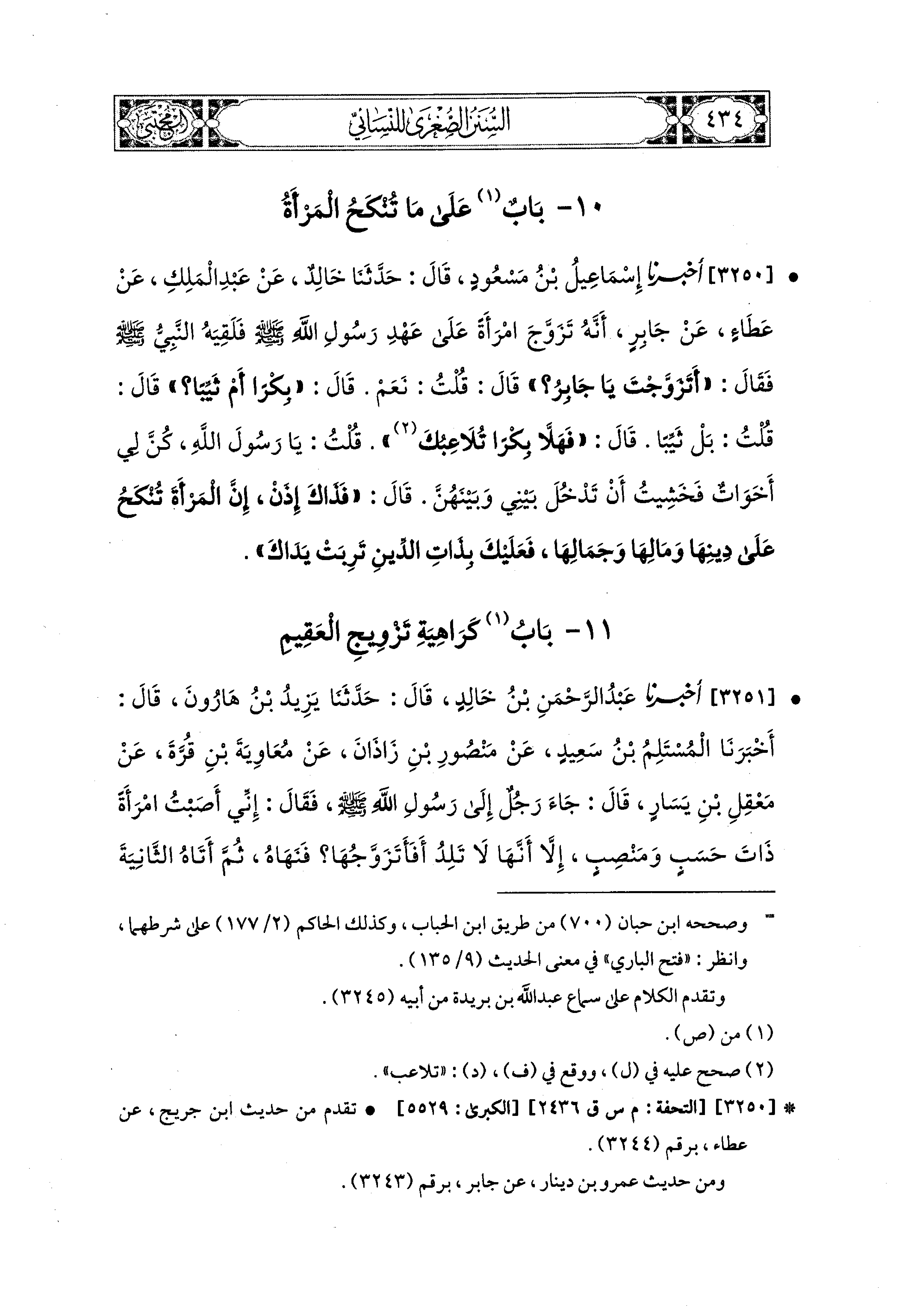 3250 - أَخبَرَنا إِسماعِيلُ بْنُ مَسْعُودٍ، قال: حَدثنا خَالِدٌ، عَن عَبدِ المَلِكِ، عَن عَطَاءٍ، عَن جَابِرٍ، أَنَّهُ تَزَوَّجَ امْرَأَةً عَلَى عَهْدِ رَسُولِ اللهِ صَلى الله عَليه وسَلم، فَلَقِيَهُ النَّبيُّ صَلى الله عَليه وسَلم، فَقَالَ: أَتَزَوَّجْتَ يَا جَابِرُ؟ قَالَ: قُلْتُ: نَعَمْ، قَالَ: بِكْرًا أَمْ ثَيِّبًا؟ قَالَ: قُلْتُ: بَلْ ثَيِّبًا، قَالَ: فَهَلاَّ بِكْرًا تُلاَعِبُكَ، قُلْتُ: يَا رَسُولَ اللهِ، كُنَّ لِي أَخَوَاتٌ فَخَشِيتُ أَنْ تَدْخُلَ بَيْني وَبَيْنَهُنَّ، قَالَ: فَذَاكَ إِذًا، إِنَّ المَرْأَةَ تُنْكَحُ عَلَى دِينِهَا، وَمَالِهَا، وَجَمَالِهَا، فَعَلَيْكَ بِذَاتِ الدِّينِ تَرِبَتْ يَدَاكَ.
