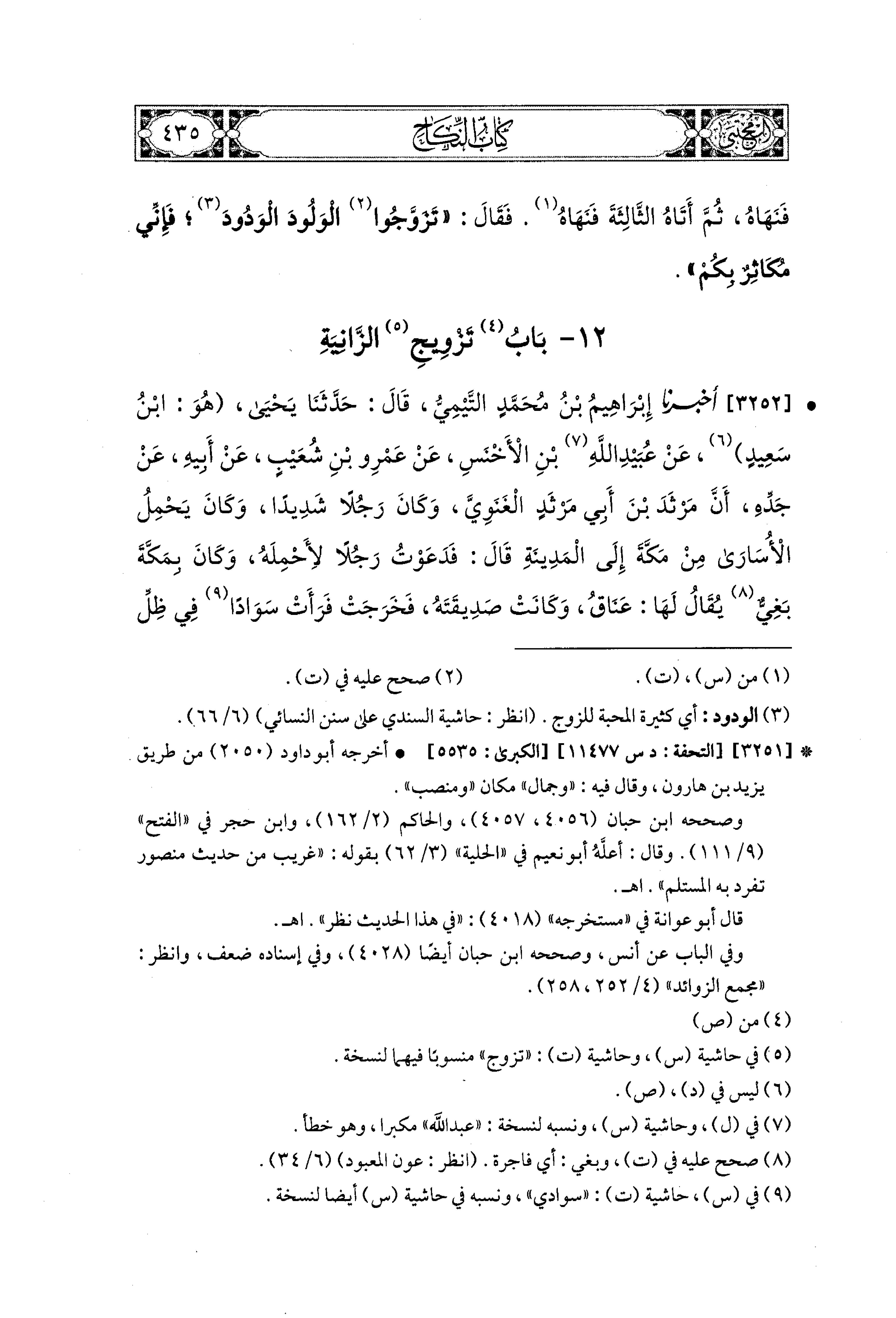 3252 - أَخبَرَنا إِبراهِيمُ بْنُ مُحَمدٍ التَّيْميُّ، قال: حَدثنا يَحيَى، هُوَ ابنُ سَعيدٍ، عَن عُبَيدِ اللهِ بْنِ الأَخْنَسِ، عَن عَمْرِو بْنِ شُعَيبٍ، عَن أَبيهِ، عَن جَدِّهِ، أَنَّ مَرْثَدَ بْنَ أَبي مَرْثَدٍ الغَنَوِيَّ، وَكَانَ رَجُلاً شَدِيدًا، وَكَانَ يَحْمِلُ الأُسَارَى مِنْ مَكَّةَ، إِلَى المَدِينَةِ، قَالَ: فَدَعَوْتُ رَجُلاً لأَحْمِلَهُ، وَكَانَ بِمَكَّةَ بَغِيٌّ يُقَالُ لَهَا: عَنَاقُ، وَكَانَتْ صَدِيقَتَهُ، فخَرَجَتْ فَرَأَتْ سَوَادًا فِي ظِلِّ الحَائِطِ، فَقَالَتْ: مَنْ هَذَا مَرْثَدٌ، مَرْحَبًا وَأَهْلاً يَا مَرْثَدُ، انْطَلِقِ اللَّيلَةَ فَبِتْ عِنْدَنَا فِي الرَّحْلِ، قُلْتُ: يَا عَنَاقُ، إِنَّ رَسُولَ اللهِ صَلى الله عَليه وسَلم حَرَّمَ الزِّنَا، قَالَتْ: يَا أَهْلَ الخِيَامِ، هَذَا الدُّلْدُلُ، الَّذِي يَحْمِلُ أُسَرَاءَكُمْ مِنْ مَكَّةَ إِلَى المَدِينَةِ، فَسَلَكْتُ الخَنْدَمَةَ، فَطَلَبَني ثَمَانيَةٌ، فَجَاؤُوا حَتَّى قَامُوا عَلَى رَأْسِي، فَبَالُوا، فَطَارَ بَوْلُهُمْ عَلَيَّ، وَأَعْمَاهُمُ اللهُ عَزَّ وَجَلَّ عَنِّي، فَجِئْتُ إِلَى صَاحِبِي، فَحَمَلْتُهُ، فَلَمَّا انْتَهَيْتُ بِهِ إِلَى الأَرَاكِ، فَكَكْتُ عَنهُ كَبْلَهُ، فَجِئْتُ إِلَى رَسُولِ اللهِ صَلى الله عَليه وسَلم، قُلْتُ: يَا رَسُولَ اللهِ، أَنْكِحُ عَنَاقَ، فَسَكَتَ عَنِّي، فَنَزَلَتْ: {الزَّانيَةُ لاَ يَنْكِحُهَا إِلاَّ زَانٍ، أَوْ مُشْرِكٌ}، فَدَعَاني، فَقَرَأَهَا عَلَيَّ وَقَالَ: لاَ تَنْكِحْهَا.