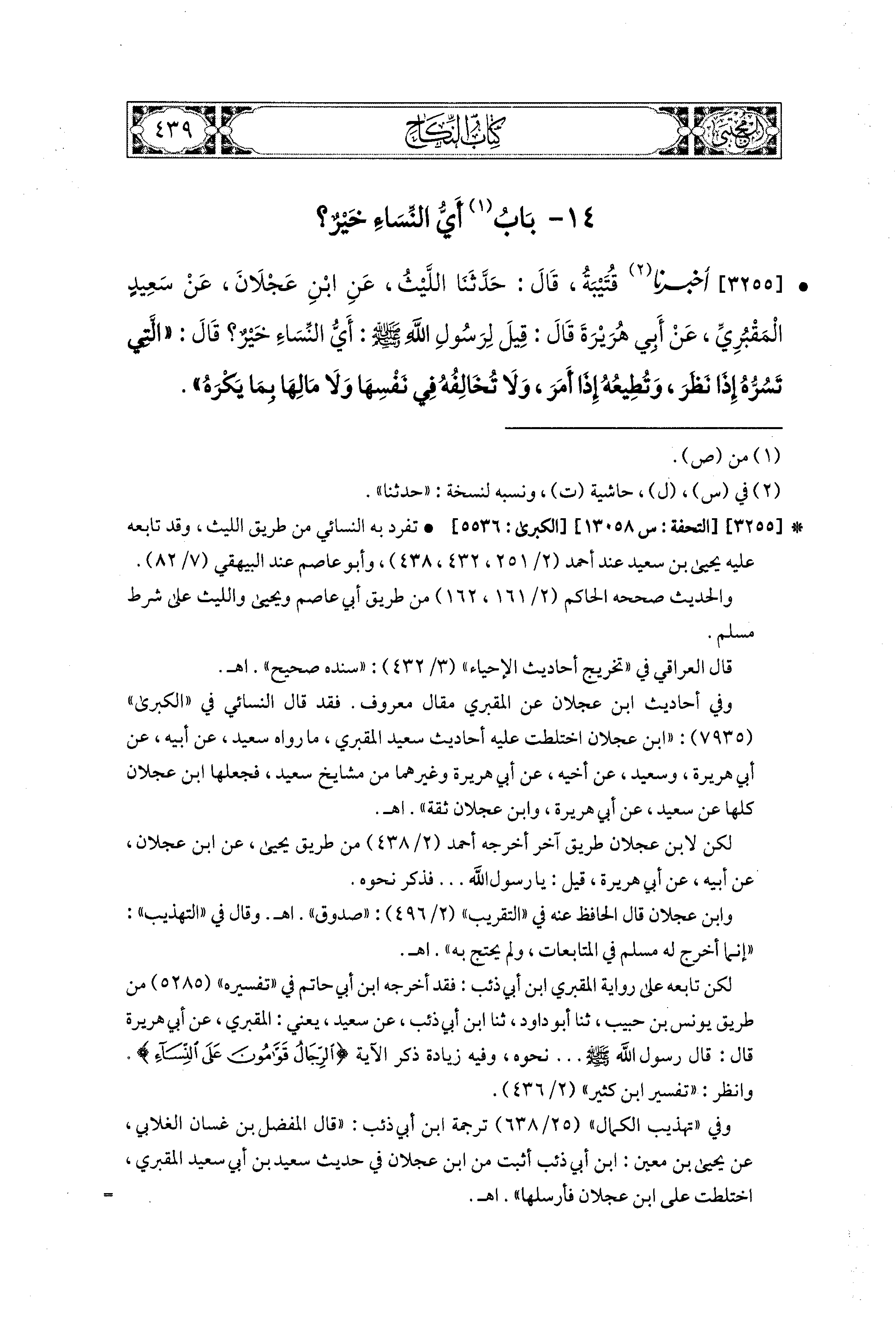 3255 - أَخبَرَنا قُتَيبَةُ، قال: حَدثنا اللَّيْثُ، عَنِ ابنِ عَجْلاَنَ، عَن سَعيدٍ المَقْبُرِيِّ، عَن أَبي هُرَيرَةَ، قَالَ: قِيلَ لِرَسُولِ اللهِ صَلى الله عَليه وسَلم: أَيُّ النِّسَاءِ خَيْرٌ؟ قَالَ: الَّتِي تَسُرُّهُ إِذَا نَظَرَ، وَتُطِيعُهُ إِذَا أَمَرَ، وَلاَ تُخَالِفُهُ فِي نَفْسِهَا وَلا مَالِهَا بِمَا يَكْرَهُ.