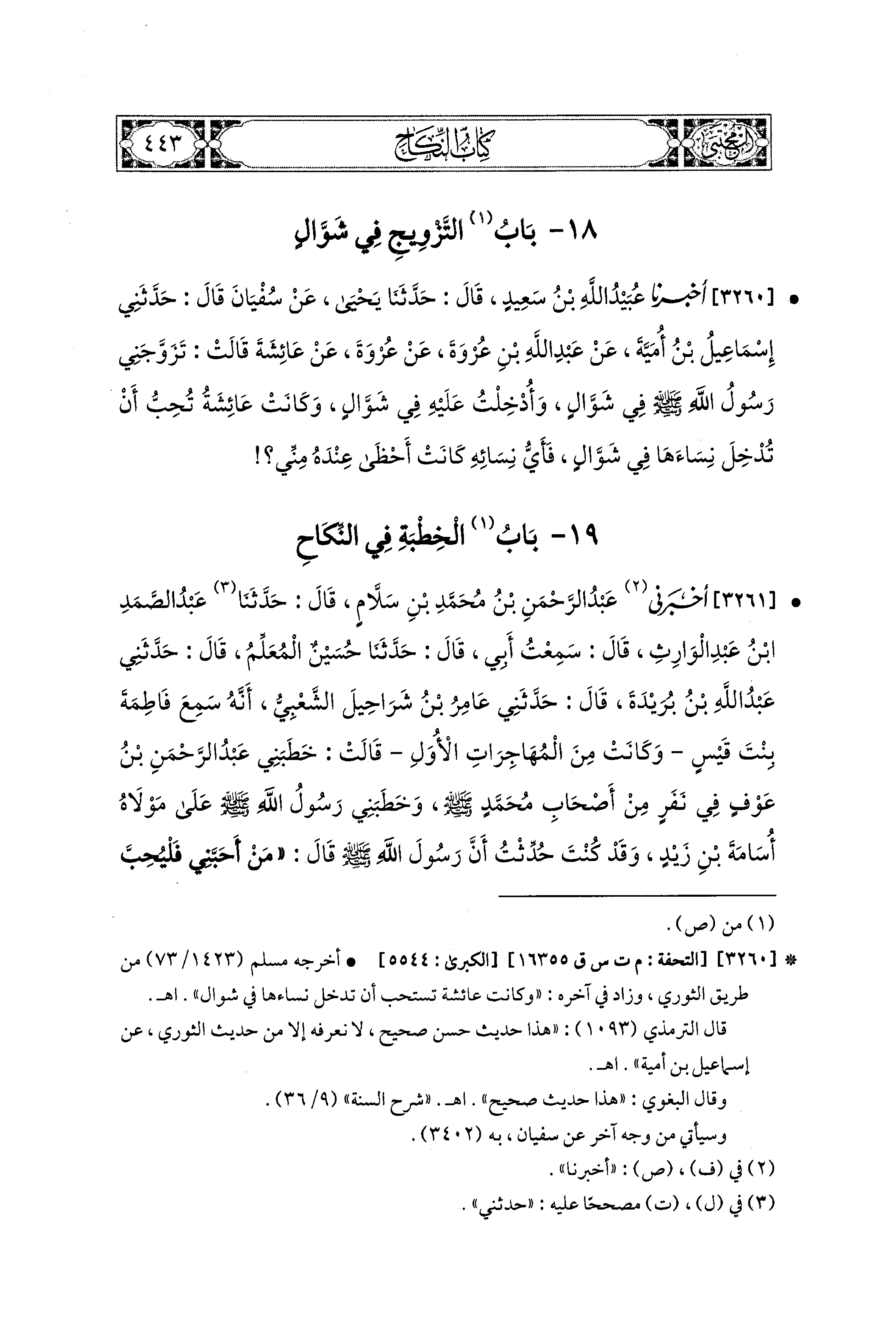 3260 - أَخبَرَنا عُبَيدُ اللهِ بْنُ سَعيدٍ، قال: حَدثنا يَحيَى، عَن سُفيَانَ، قَالَ: حَدَّثَني إِسماعِيلُ بْنُ أُمَيَّةَ، عَن عَبد اللهِ بن عُرْوَةَ، عَن عُرْوَةَ، عَن عَائِشَةَ، قَالَتْ: تَزَوَّجَني رَسُولُ اللهِ صَلى الله عَليه وسَلم فِي شَوَّالٍ، وَأُدْخِلْتُ عَلَيهِ فِي شَوَّالٍ، وَكَانَتْ عَائِشَةُ تُحِبُّ أَنْ تُدْخِلَ نِسَاءَهَا فِي شَوَّالٍ، فَأَيُّ نِسَائِهِ كَانَتْ أَحْظَى عِنْدَهُ مِنِّي.