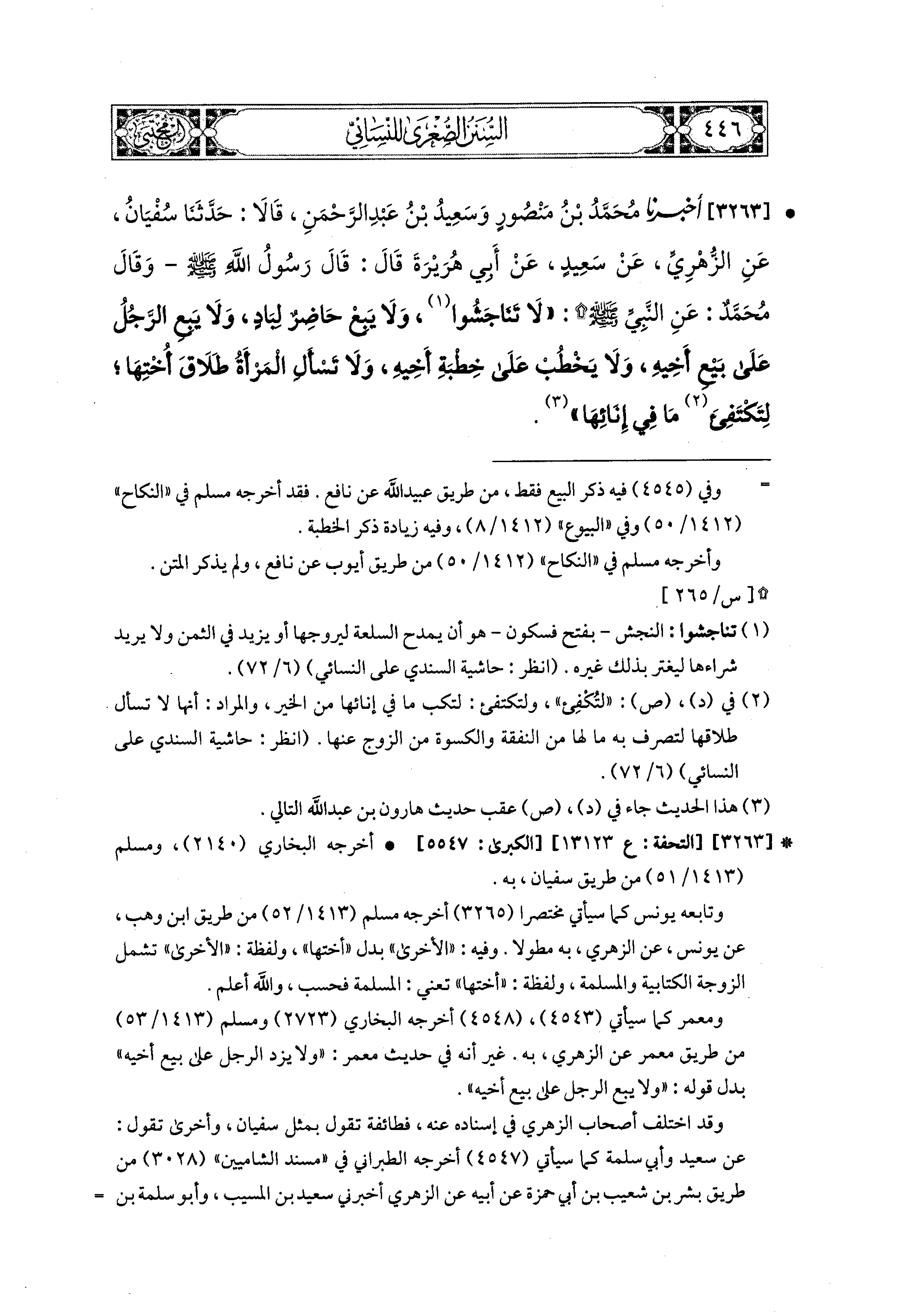 3263 - أَخبَرَنا مُحَمد بْنُ مَنْصُورٍ، وَسَعيدُ بْنُ عَبدِ الرَّحمَنِ، قَالاَ: حَدثنا سُفيان، عَنِ الزُّهْرِيِّ، عَن سَعيدٍ، عَن أَبي هُرَيرَةَ، قَالَ: قَالَ رَسُولُ اللهِ صَلى الله عَليه وسَلم، وَقَالَ مُحَمدٌ: عَنِ النَّبيِّ صَلى الله عَليه وسَلم: لاَ تَنَاجَشُوا، وَلاَ يَبِعْ حَاضِرٌ لِبَادٍ، وَلاَ يَبِعِ الرَّجُلُ عَلَى بَيْعِ أَخِيهِ، وَلاَ يَخْطُبْ عَلَى خِطْبَةِ أَخِيهِ، وَلاَ تَسْأَلِ المَرْأَةُ طَلاَقَ أُخْتِهَا لِتَكْتَفِئَ مَا فِي إِنَائِهَا.