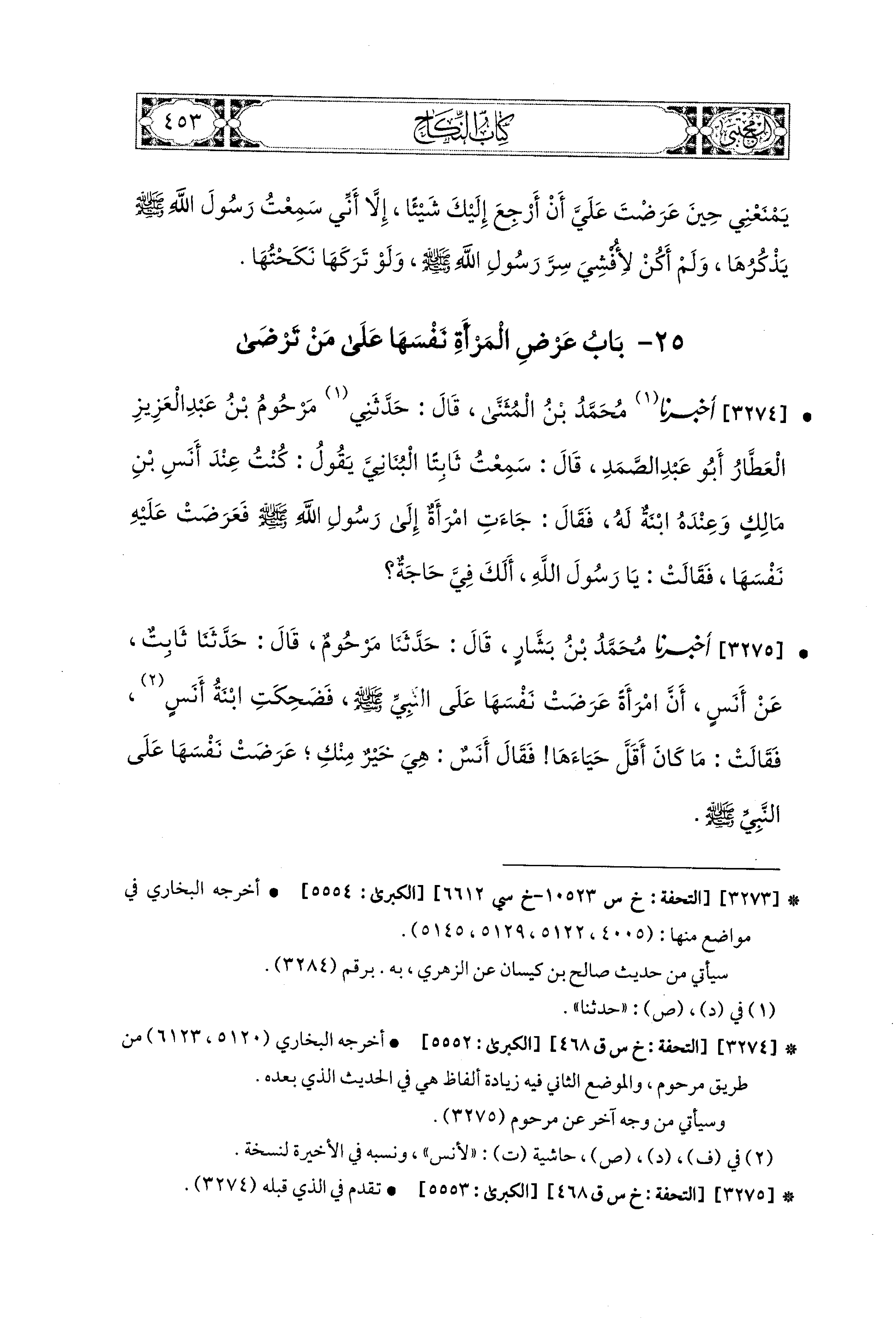 3274 - أَخبَرَنا مُحَمد بْنُ المُثَنَّى، قَالَ: حَدَّثَني مَرْحُومُ بْنُ عَبدِ العَزِيزِ العَطَّارُ أَبو عَبدِ الصَّمَدِ، قَالَ: سَمِعْتُ ثَابِتًا البُنَانيَّ، يَقُولُ: كُنْتُ عِنْدَ أَنَسِ بْنِ مَالِكٍ، وَعِنْدَهُ ابنَةٌ لَهُ، فَقَالَ: جَاءَتِ امْرَأَةٌ إِلَى رَسُولِ اللهِ صَلى الله عَليه وسَلم فَعَرَضَتْ عَلَيهِ نَفْسَهَا، فَقَالَتْ: يَا رَسُولَ اللهِ، أَلَكَ فِيَّ حَاجَةٌ.