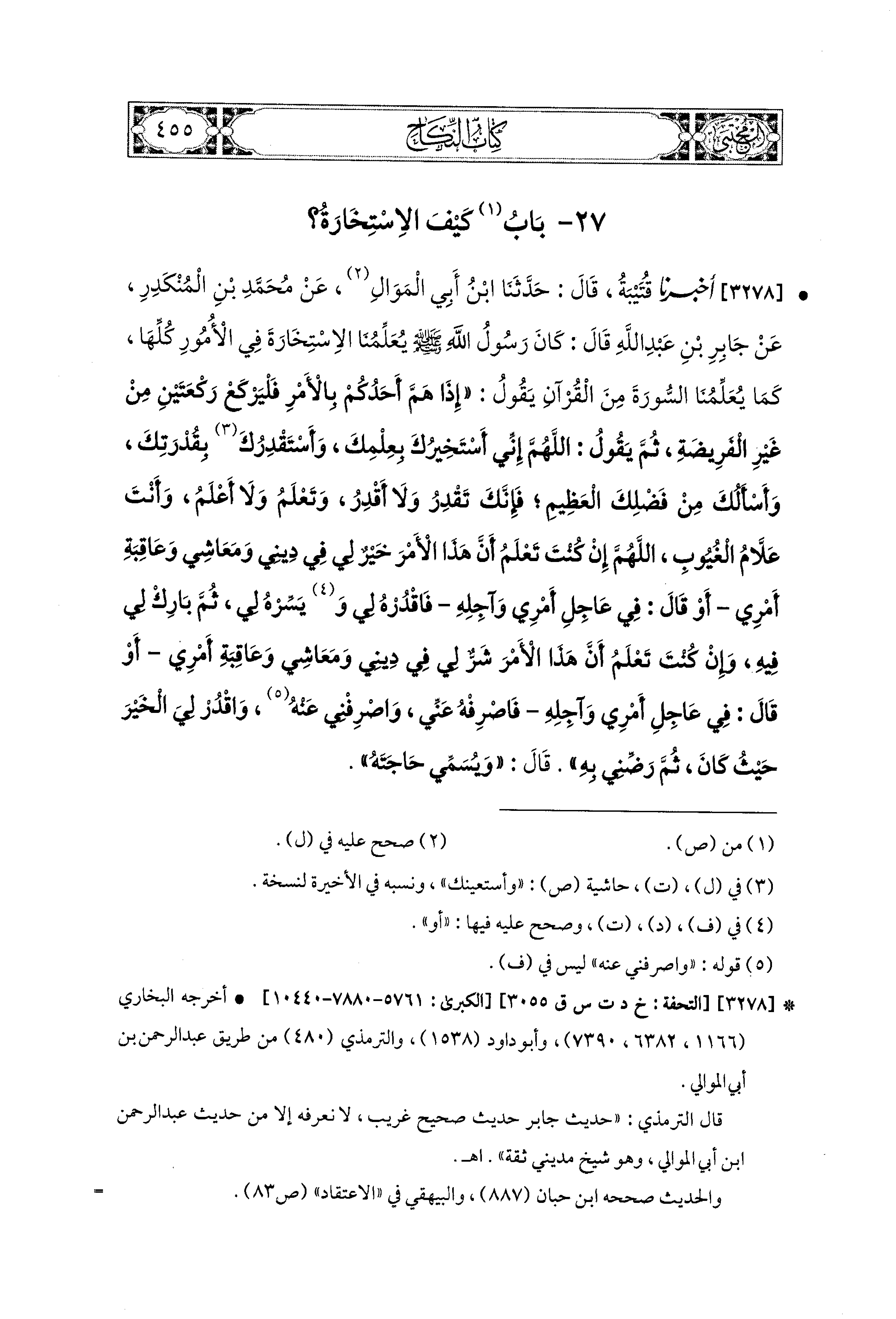 3278 - أَخبَرَنا قُتَيبَةُ، قال: حَدثنا ابنُ أَبي المَوَالِي، عَن مُحَمدِ بْنِ المُنْكَدِرِ، عَن جَابِرِ بْنِ عَبدِ اللهِ، قَالَ: كَانَ رَسُولُ اللهِ صَلى الله عَليه وسَلم يُعَلِّمُنَا الاِسْتِخَارَةَ فِي الأُمُورِ كُلِّهَا كَمَا يُعَلِّمُنَا السُّورَةَ مِنَ القُرْآنِ، يَقُولُ: إِذَا هَمَّ أَحَدُكُمْ بِالأَمْرِ، فَلْيَرْكَعْ رَكْعَتَيْنِ مِنْ غَيْرِ الفَرِيضَةِ، ثُمَّ يَقُولُ: اللهُمَّ إِنِّي أَسْتَخِيرُكَ بِعِلْمِكَ، وَأَسْتَقدركَ بِقُدْرَتِكَ، وَأَسْأَلُكَ مِنْ فَضْلِكَ العَظِيمِ، فَإِنَّكَ تَقْدِرُ وَلاَ أَقْدِرُ، وَتَعْلَمُ وَلاَ أَعْلَمُ، وَأَنْتَ عَلاَّمُ الغُيُوبِ، اللهُمَّ إِنْ كُنْتَ تَعْلَمُ أَنَّ هَذَا الأَمْرَ خَيْرٌ لِي فِي دِيني وَمَعَاشِي وَعَاقِبَةِ أَمْرِي، أَوْ قَالَ: فِي عَاجِلِ أَمْرِي وَآجِلِهِ، فَاقْدِرْهُ لِي، وَيَسِّرْهُ لِي، ثُمَّ بَارِكْ لِي فِيهِ، وَإِنْ كُنْتَ تَعْلَمُ أَنَّ هَذَا الأَمْرَ شَرٌّ لِي فِي دِيني، وَمَعَاشِي، وَعَاقِبَةِ أَمْرِي، أَوْ قَالَ: فِي عَاجِلِ أَمْرِي وَآجِلِهِ، فَاصْرِفْهُ عَنِّي، وَاصْرِفْني عَنهُ، وَاقْدُرْ لِي الخَيْرَ حَيْثُ كَانَ، ثُمَّ رْضِني بِهِ، قَالَ: وَيُسَمِّي حَاجَتَهُ.