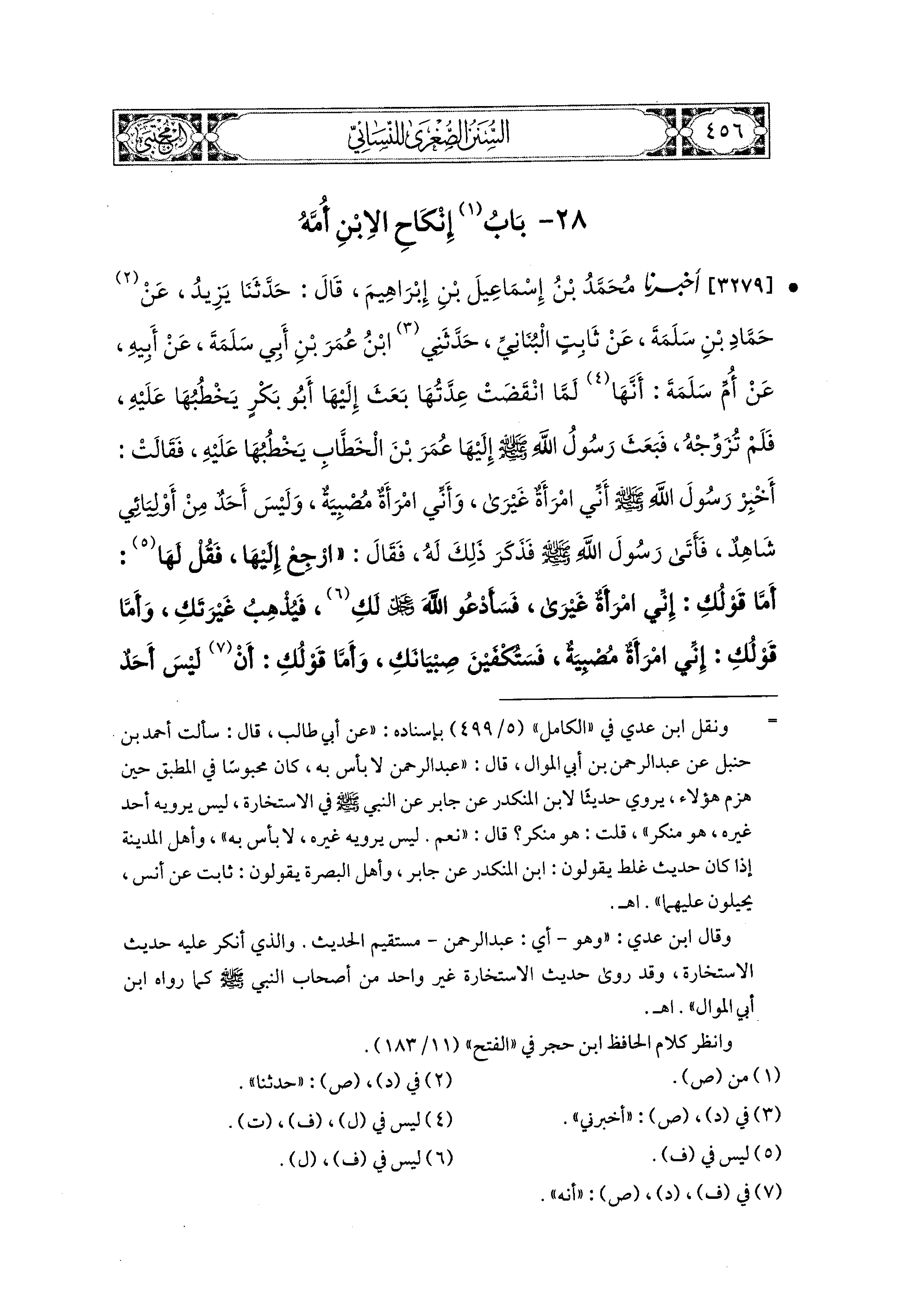 3279 - أَخبَرَنا مُحَمد بْنُ إِسماعِيلَ بْنِ إِبراهِيمَ، قال: حَدثنا يَزِيدُ، عَن حَمَّادِ بْنِ سَلَمَةَ، عَن ثَابِتٍ البُنَانيِّ، حَدَّثَني ابنُ عُمَرَ بْنِ أَبي سَلَمَةَ، عَن أَبيهِ، عَن أُمِّ سَلَمَةَ، لَمَّا انْقَضَتْ عِدَّتُهَا، بَعَثَ إِلَيْهَا أَبو بَكْرٍ يَخْطُبُهَا عَلَيهِ، فَلَمْ تَزَوَّجْهُ، فَبَعَثَ رَسُولُ اللهِ صَلى الله عَليه وسَلم إِلَيْهَا عُمَرَ بْنَ الخَطَّابِ يَخْطُبُهَا عَلَيهِ، فَقَالَتْ: أَخْبِرْ رَسُولَ اللهِ صَلى الله عَليه وسَلم أَنِّي امْرَأَةٌ غَيْرَى، وَأَنِّي امْرَأَةٌ مُصْبِيَةٌ، وَلَيْسَ أَحَدٌ مِنْ أَوْلِيَائِي شَاهِدٌ، فَأَتَى رَسُولَ اللهِ صَلى الله عَليه وسَلم، فَذَكَرَ ذَلِكَ لَهُ، فَقَالَ: ارْجِعْ إِلَيْهَا فَقُلْ لَهَا: أَمَّا قَوْلُكِ إِنِّي امْرَأَةٌ غَيْرَى، فَسَأَدْعُو اللهَ عَزَّ وَجَلَّ لَكِ فَيُذْهِبُ غَيْرَتَكِ، وَأَمَّا قَوْلُكِ إِنِّي امْرَأَةٌ مُصْبِيَةٌ، فَسَتُكْفَيْنَ صِبْيَانَكِ، وَأَمَّا قَوْلُكِ أَنْ لَيْسَ أَحَدٌ مِنْ أَوْلِيَائِي شَاهِدٌ، فَلَيْسَ أَحَدٌ مِنْ أَوْلِيَائِكِ شَاهِدٌ وَلاَ غَائِبٌ يَكْرَهُ ذَلِكَ، فَقَالَتْ لاِبْنِهَا: يَا عُمَرُ، قُمْ فَزَوِّجْ رَسُولَ اللهِ صَلى الله عَليه وسَلم، فَزَوَّجَهُ. مُخْتَصَرٌ.