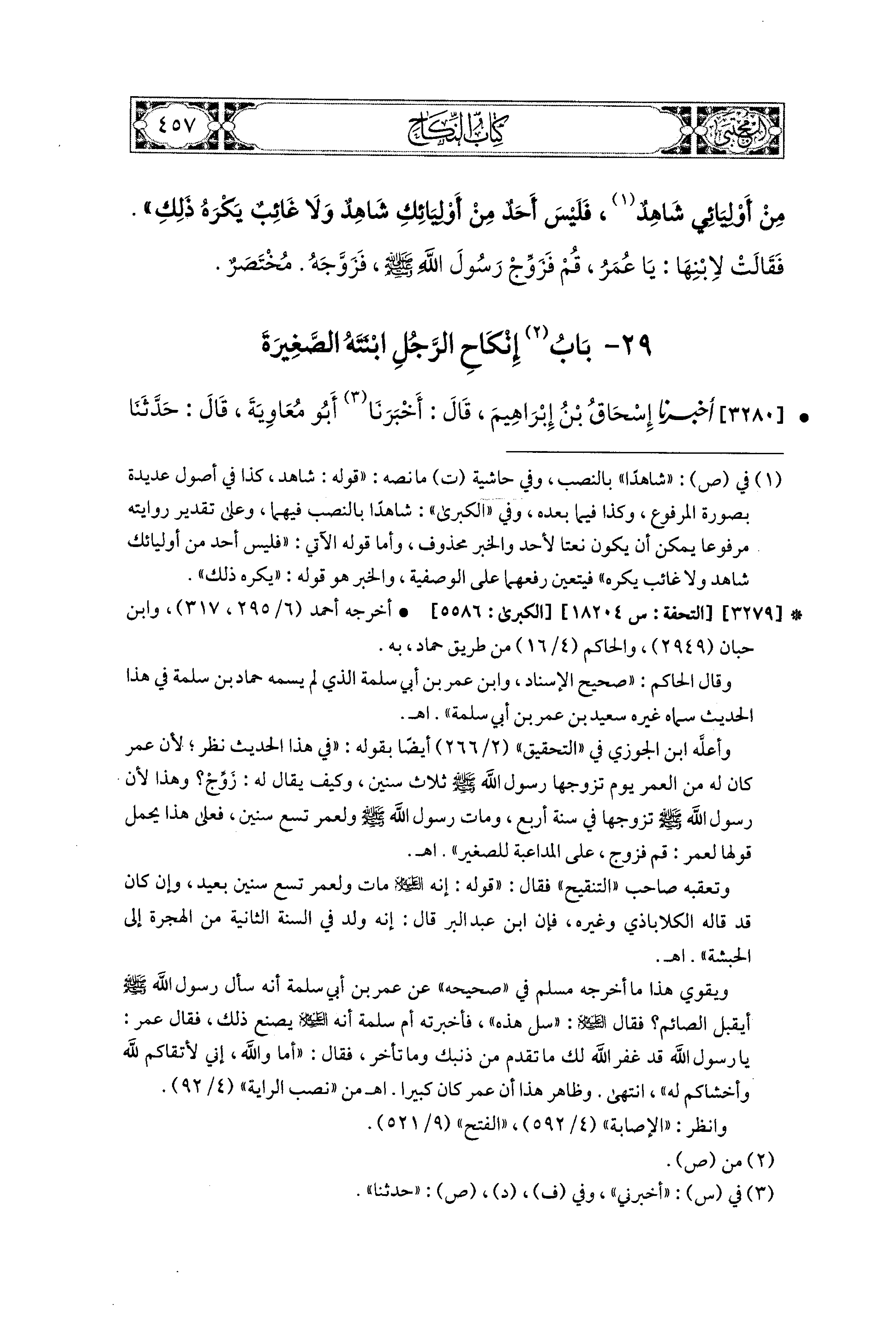 3280 - أَخبَرَنا إِسحَاقُ بْنُ إِبراهِيمَ، قَالَ: أَخبَرنا أَبو مُعَاوِيَةَ، قال: حَدثنا هِشَامُ بْنُ عُرْوَةَ، عَن أَبيهِ، عَن عَائِشَةَ أَنَّ رَسُولَ اللهِ صَلى الله عَليه وسَلم، تَزَوَّجَهَا وَهِيَ بِنْتُ سِتٍّ، وَبَنَى بِهَا وَهِيَ بِنْتُ تِسْعٍ.