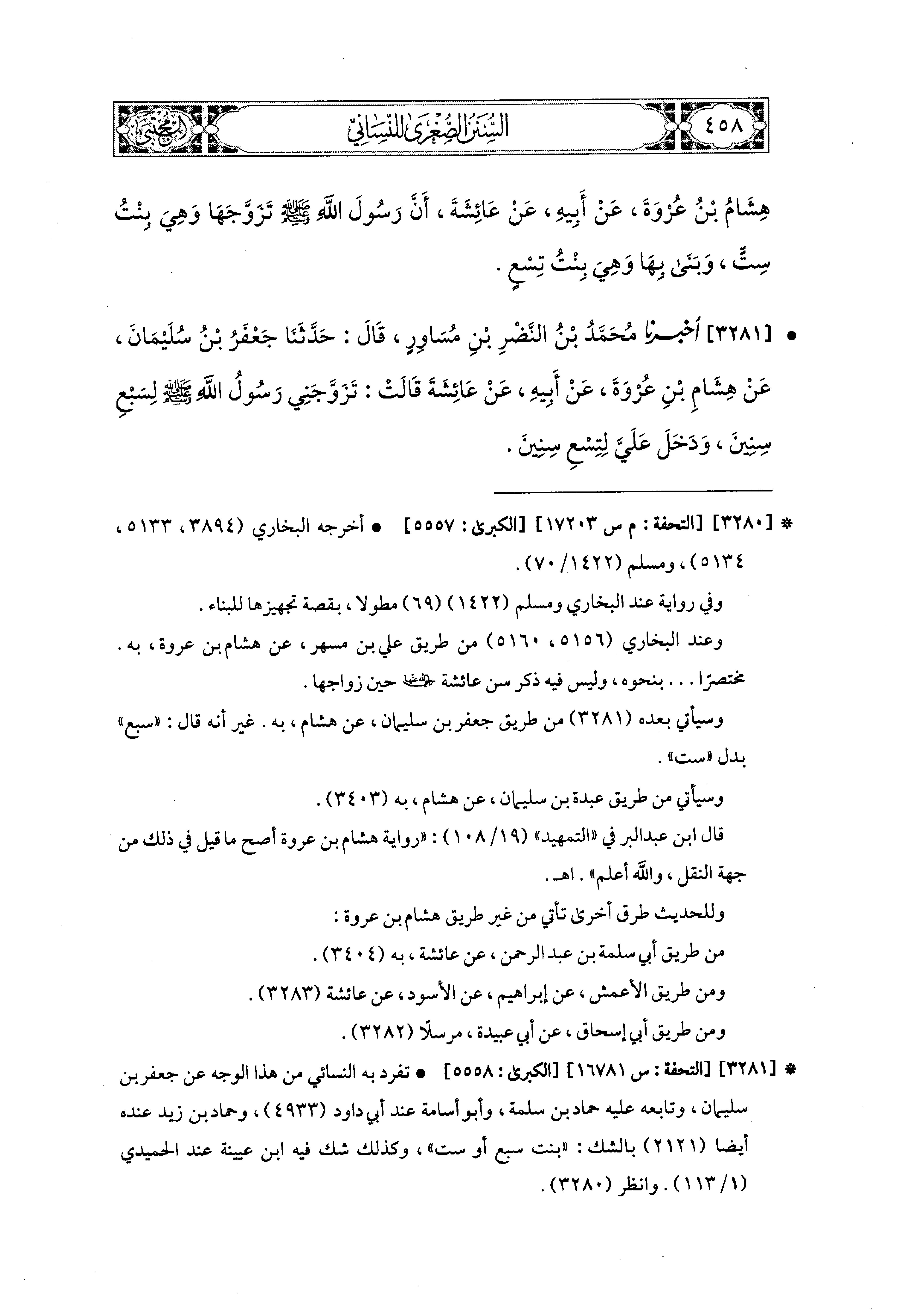 3281 - أَخبَرَنا مُحَمد بْنُ النَّضْرِ بْنِ مُسَاوِرٍ، قال: حَدثنا جَعْفَرُ بْنُ سُلَيمَانَ، عَن هِشَامِ بْنِ عُرْوَةَ، عَن أَبيهِ، عَن عَائِشَةَ، قَالَتْ: تَزَوَّجَني رَسُولُ اللهِ صَلى الله عَليه وسَلم لِسَبْعِ سِنينَ، وَدَخَلَ عَلَيَّ لِتِسْعِ سِنينَ.