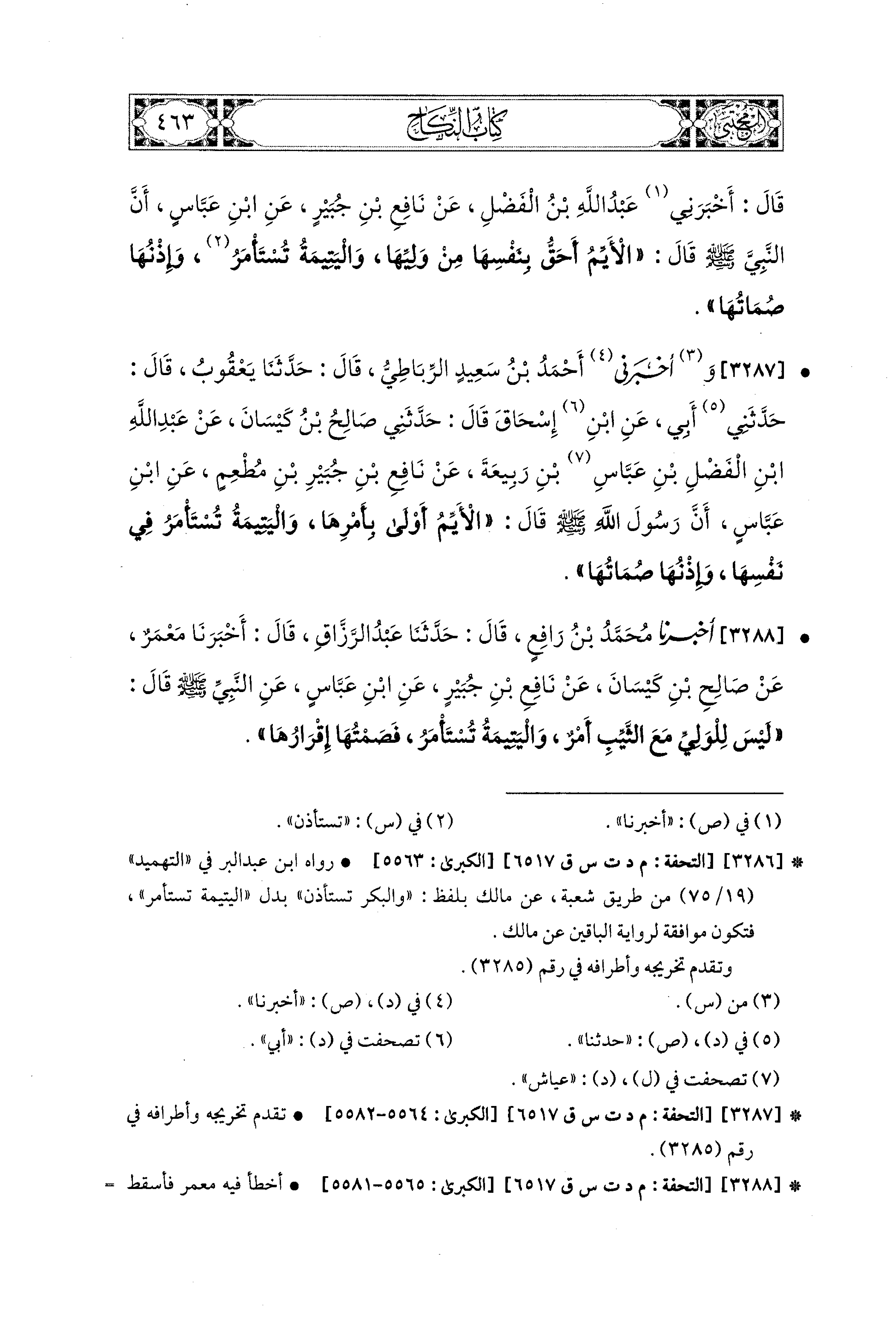 3287 - أَخبَرني أَحْمَدُ بْنُ سَعيدٍ الرِّبَاطِيُّ، قال: حَدثنا يَعقُوبُ، قَالَ: حَدَّثَني أَبي، عَنِ ابنِ إِسحَاقَ، قَالَ: حَدَّثَني صَالِحُ بْنُ كَيْسَانَ، عَن عَبد اللهِ بن الفَضْلِ بْنِ عَبَّاسِ بْنِ رَبِيعَةَ، عَن نَافِعِ بْنِ جُبَيْرِ بْنِ مُطْعِمٍ، عَنِ ابنِ عَبَّاسٍ، أَنَّ رَسُولَ اللهِ صَلى الله عَليه وسَلم قَالَ: الأَيِّمُ أَوْلَى بِأَمْرِهَا، وَاليَتِيمَةُ تُسْتَأْمَرُ فِي نَفْسِهَا، وَإِذْنُهَا صُمَاتُهَا.