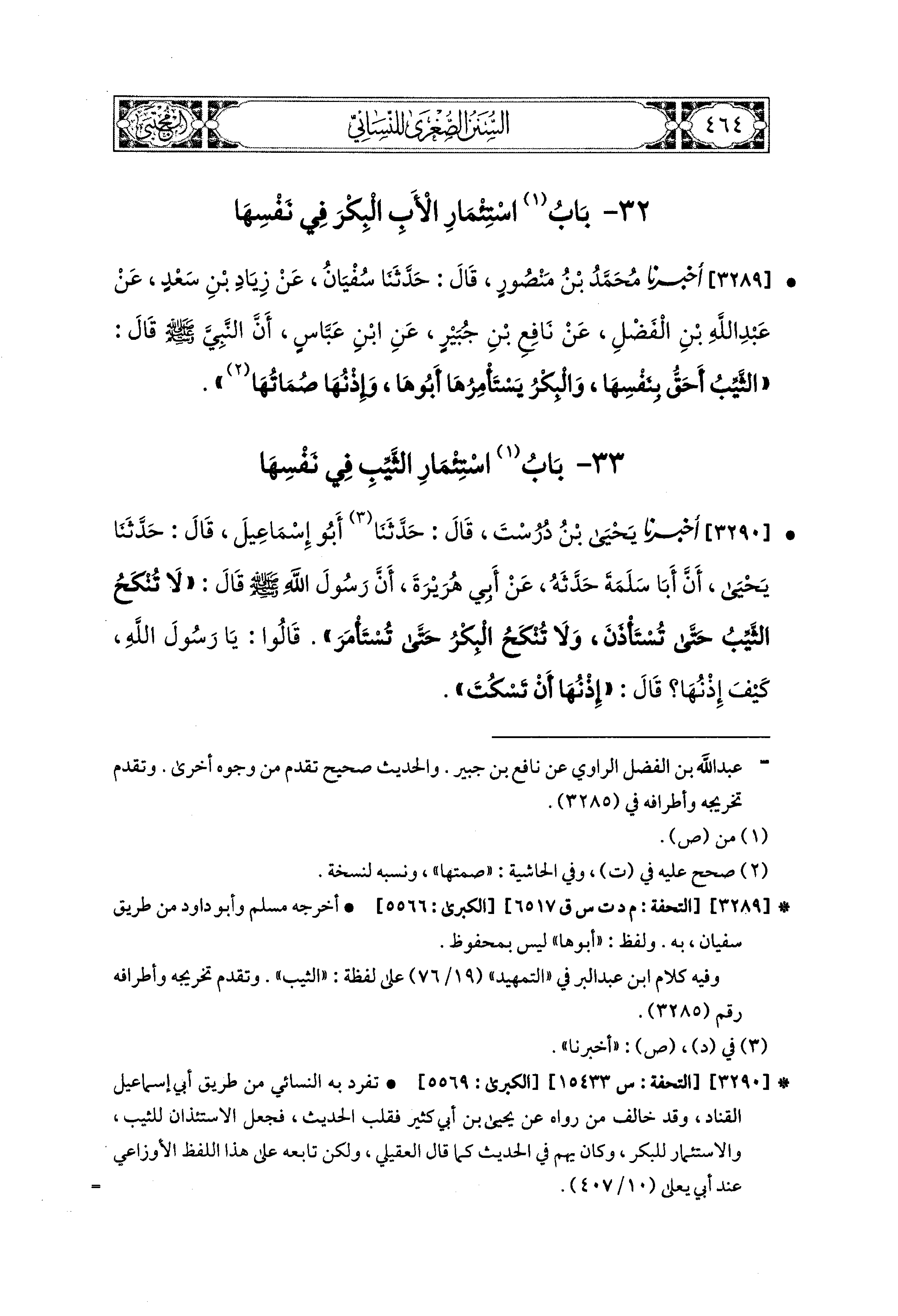 3289 - أَخبَرَنا مُحَمد بْنُ مَنْصُورٍ، قال: حَدثنا سُفيَانُ، عَن زِيَادِ بْنِ سَعْدٍ (1)، عَن عَبد اللهِ بن الفَضْلِ، عَن نَافِعِ بْنِ جُبَيْرٍ، عَنِ ابنِ عَبَّاسٍ، أَنَّ النَّبيَّ صَلى الله عَليه وسَلم قَالَ: الثَّيِّبُ أَحَقُّ بِنَفْسِهَا، وَالبِكْرُ يَسْتَأْمِرُهَا أَبوهَا، وَإِذْنُهَا صُمَاتُهَا.