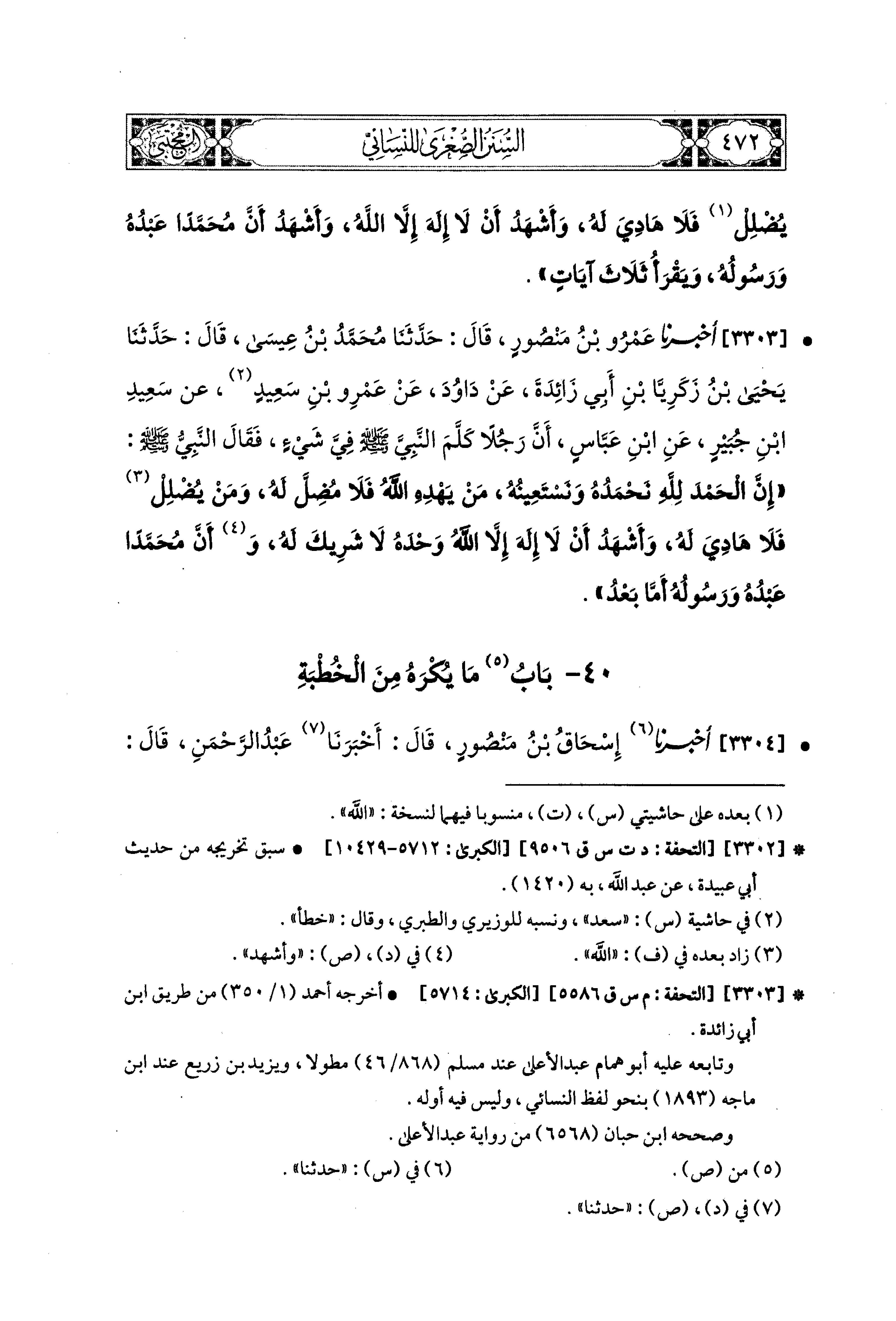 3303 - أَخبَرَنا عَمْرُو بْنُ مَنْصُورٍ، قال: حَدثنا مُحَمدُ بْنُ عِيسَى، قال: حَدثنا يَحيَى بْنُ زَكَرِيَّا بْنِ أَبي زَائِدَةَ، عَن دَاوُدَ، عَن عَمْرِو بْنِ سَعيدٍ، عَن سَعيدِ بْنِ جُبَيْرٍ، عَنِ ابنِ عَبَّاسٍ، أَنَّ رَجُلاً كَلَّمَ النَّبيَّ صَلى الله عَليه وسَلم فِي شَيْءٍ، فَقَالَ النَّبيُّ صَلى الله عَليه وسَلم: إِنَّ الحَمْدَ لِلَّهِ، نَحْمَدُهُ وَنَسْتَعِينُهُ، مَنْ يَهْدِهِ اللهُ، فَلاَ مُضِلَّ لَهُ، وَمَنْ يُضْلِلِ، فَلاَ هَادِيَ لَهُ، وَأَشْهَدُ أَنْ لاَ إِلَهَ إِلاَّ اللهُ وَحْدَهُ لاَ شَرِيكَ لَهُ، وَأَنَّ مُحَمدًا عَبدُهُ وَرَسُولُهُ، أَمَّا بَعْدُ.