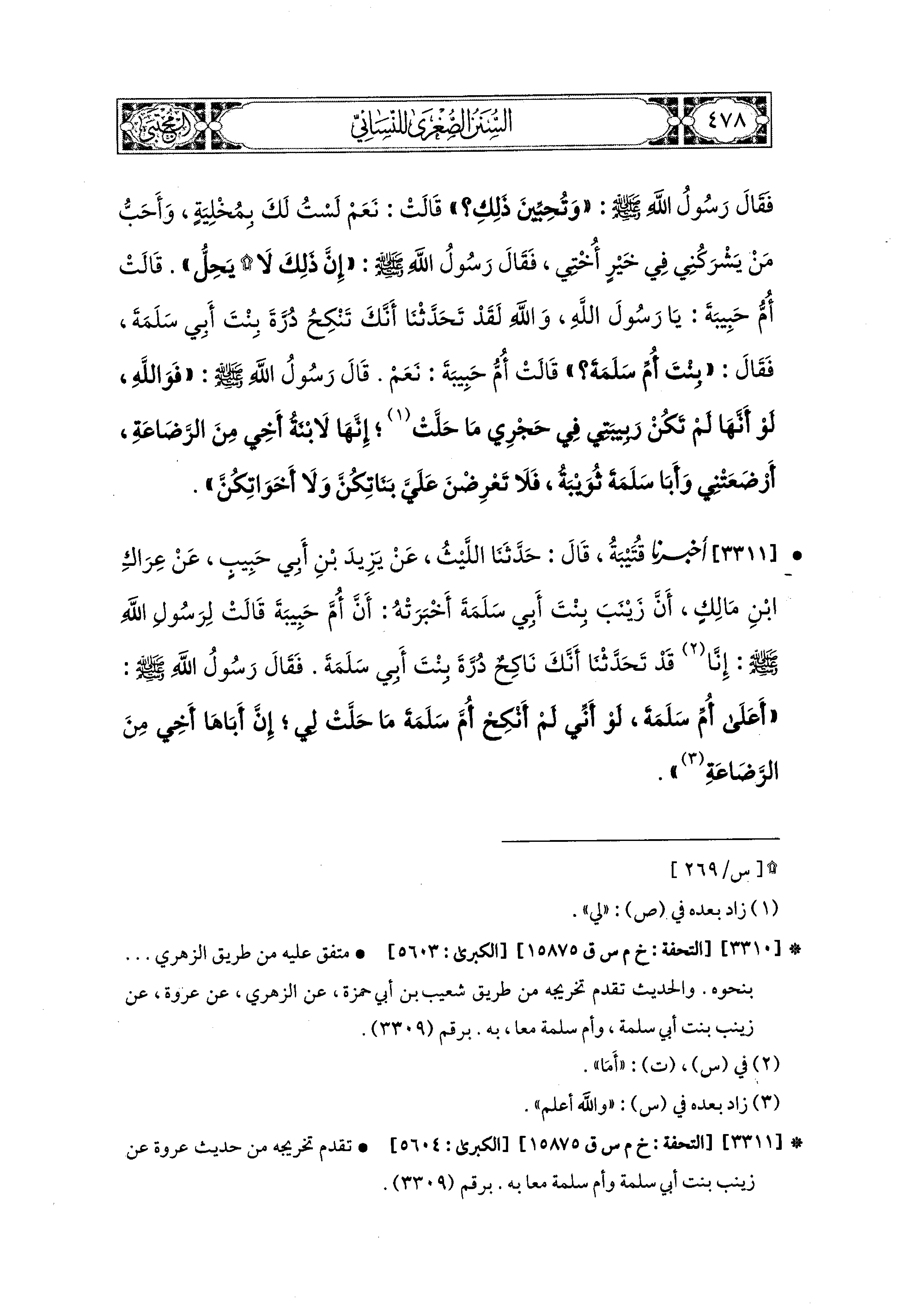 3311 - أَخبَرَنا قُتَيبَةُ، قال: حَدثنا اللَّيْثُ، عَن يَزِيدَ بْنِ أَبي حَبِيبٍ، عَن عِرَاكِ بْنِ مَالِكٍ، أَنَّ زَيْنَبَ بِنْتَ أَبي سَلَمَةَ، أَخْبَرَتْهُ أَنَّ أُمَّ حَبِيبَةَ، قَالَتْ لِرَسُولِ اللهِ صَلى الله عَليه وسَلم: إِنَّا قَدْ تَحَدَّثْنَا أَنَّكَ نَاكِحٌ دُرَّةَ بِنْتَ أَبي سَلَمَةَ، فَقَالَ رَسُولُ اللهِ صَلى الله عَليه وسَلم: أَعَلَى أُمِّ سَلَمَةَ، لَوْ أَنِّي لَمْ أَنْكِحْ أُمَّ سَلَمَةَ مَا حَلَّتْ لِي، إِنَّ أَبَاهَا أَخِي مِنَ الرَّضَاعَةِ.