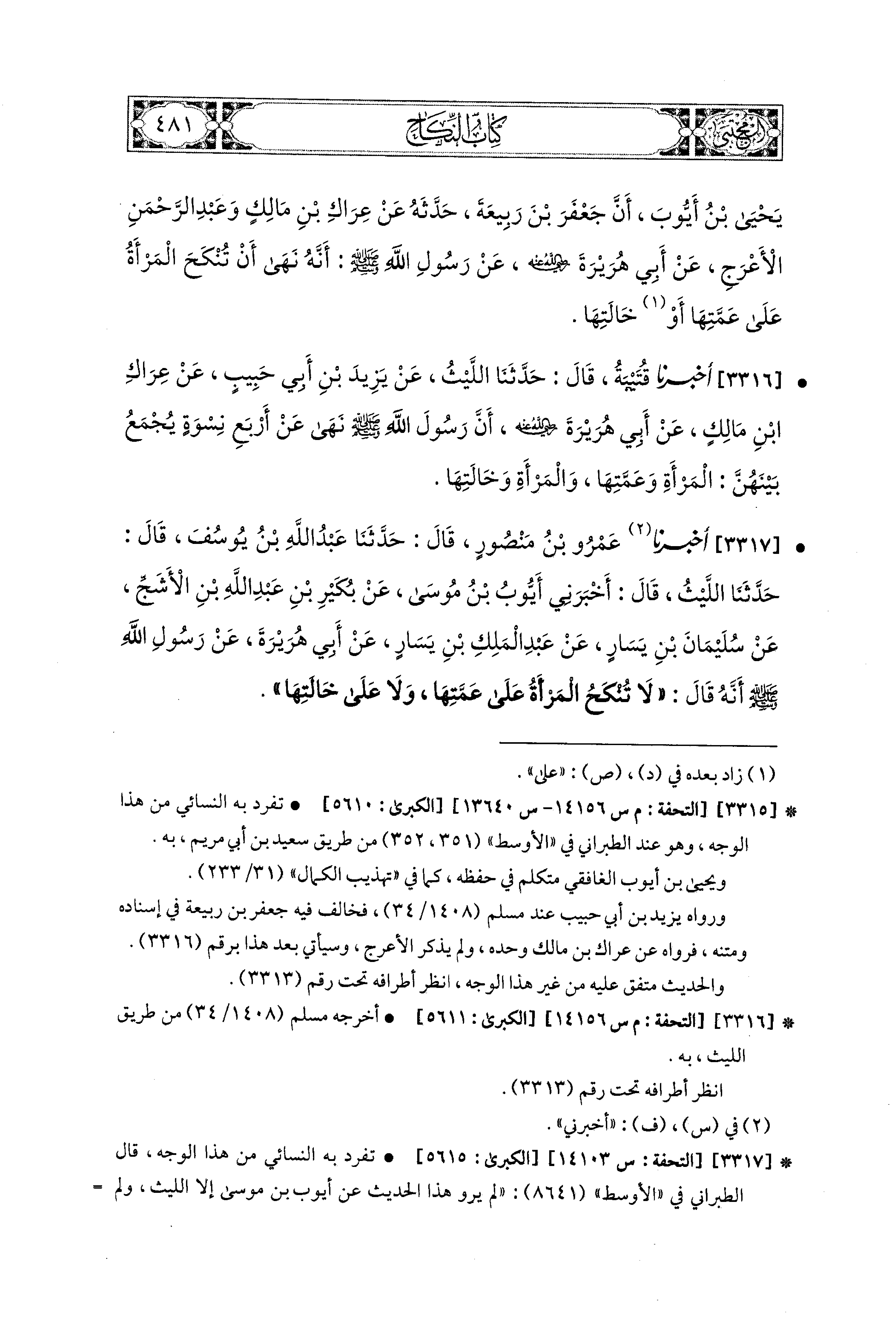 3316 - أَخبَرَنا قُتَيبَةُ، قال: حَدثنا اللَّيْثُ، عَن يَزِيدَ بْنِ أَبي حَبِيبٍ، عَن عِرَاكِ بْنِ مَالِكٍ، عَن أَبي هُرَيرَةَ رَضِيَ اللهُ عَنْهُ أَنَّ رَسُولَ اللهِ صَلى الله عَليه وسَلم، نَهَى عَن أَرْبَعِ نِسْوَةٍ يُجْمَعُ بَيْنَهُنَّ: المَرْأَةِ وَعَمَّتِهَا، وَالمَرْأَةِ وَخَالَتِهَا.