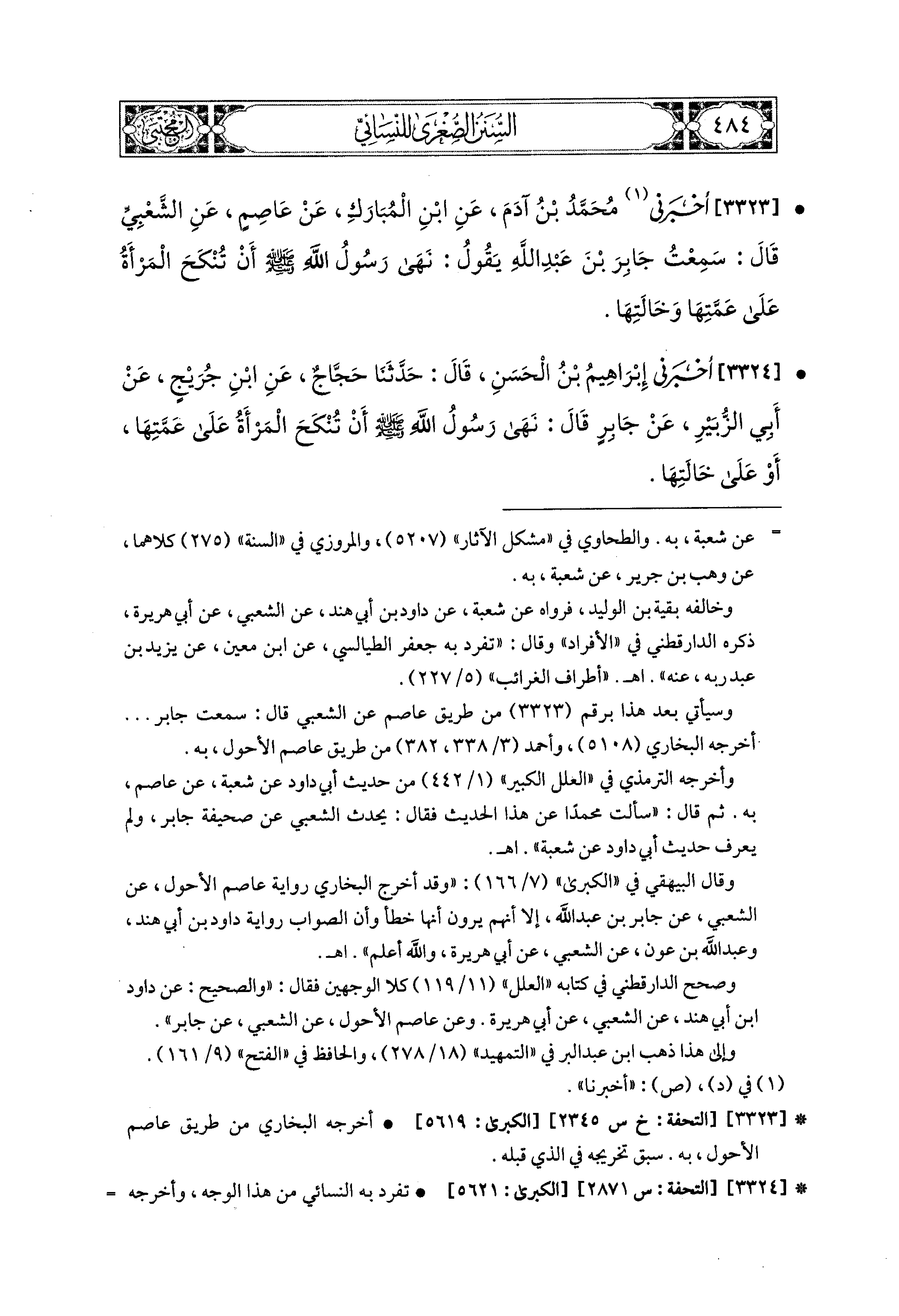 3323 - أَخبَرني مُحَمدُ بْنُ آدَمَ، عَنِ ابنِ المُبَارَكِ، عَن عَاصِمٍ، عَنِ الشَّعْبِيِّ، قَالَ: سَمِعْتُ جَابِرَ بْنَ عَبدِ اللهِ، يَقُولُ: نَهَى رَسُولُ اللهِ صَلى الله عَليه وسَلم أَنْ تُنْكَحَ المَرْأَةُ عَلَى عَمَّتِهَا وَخَالَتِهَا.