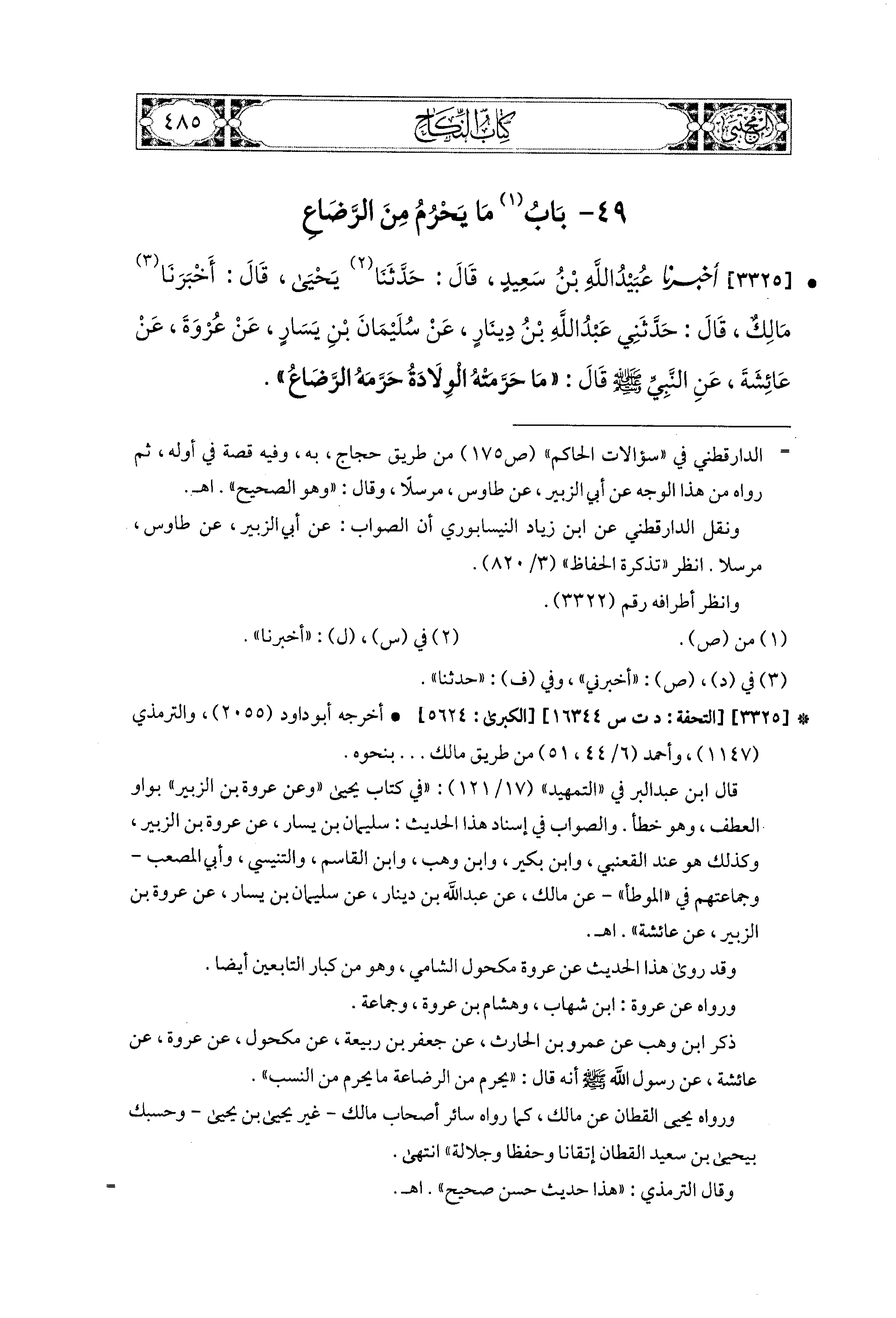 3325 - أَخبَرَنا عُبَيدُ اللهِ بْنُ سَعيدٍ، قال: حَدثنا يَحيَى، قَالَ: أَخبَرنا مَالِكٌ، قَالَ: حَدَّثَني عَبدُ اللهِ بْنُ دِينَارٍ، عَن سُلَيمَانَ بْنِ يَسَارٍ، عَن عُرْوَةَ، عَن عَائِشَةَ، عَنِ النَّبيِّ صَلى الله عَليه وسَلم قَالَ: مَا حَرَّمَتْهُ الوِلاَدَةُ حَرَّمَهُ الرَّضَاعُ.